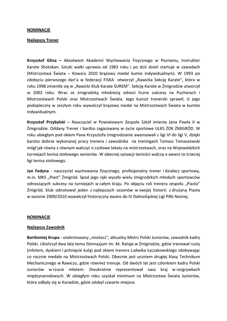 NOMINACJE Najlepszy Trener Krzysztof Glina – Absolwent Akademii Wychowania Fizycznego w Poznaniu, Instruktor Karate Shotokan. Sztuki walki uprawia od 1983 roku i po dziś dzień startuje w zawodach (Mistrzostwa Świata – Kowary 2010 brązowy medal kumie indywidualnym). W 1993 po zdobyciu pierwszego dan’a w federacji FISKA otworzył „Rawicka Sekcję Karate”, która w roku 1998 zmieniła się w „Rawicki Klub Karate SUREM”. Sekcję Karate w Żmigrodzie utworzył w 2002 roku. Wraz ze żmigrodzką młodzieżą odnosi liczne sukcesy na Pucharach i Mistrzostwach Polski oraz Mistrzostwach Świata. Jego kunszt trenerski sprawił, iż jego podopieczny w zeszłym roku wywalczył brązowy medal na Mistrzostwach Świata w kumite indywidualnym. Krzysztof Przybylski – Nauczyciel w Powiatowym Zespole Szkół imienia Jana Pawła II w Żmigrodzie. Oddany Trener i bardzo zagazowany w życie sportowe ULKS ŻOK ŻMIGRÓD. W roku ubiegłym pod okiem Pana Krzysztofa żmigrodzianie awansowali z ligi VI do ligi V, dzięki bardzo dobrze wykonanej pracy trenera i zawodnika na treningach Tomasz Tomaszewski mógł jak równy z równym walczyć o czołowe lokaty na mistrzostwach, oraz na Wojewódzkich turniejach tenisa stołowego seniorów. W obecnej sytuacji tenisiści walczą o awans to trzeciej ligi tenisa stołowego. Jan Fedyna ‐ nauczyciel wychowania fizycznego, profesjonalny trener i działacz sportowy, m.in. MKS „Piast” Żmigród. Spod jego ręki wyszło wielu żmigrodzkich młodych sportowców odnoszących sukcesy na turniejach w całym kraju. Po objęciu roli trenera zespołu „Piasta” Żmigród, klub odnotował jeden z najlepszych sezonów w swojej historii: z drużyną Piasta w sezonie 2009/2010 wywalczył historyczny awans do IV Dolnośląskiej Ligi Piłki Nożnej. NOMINACJE Najlepszy Zawodnik Bartłomiej Krupa ‐ utalentowany „miotacz”, aktualny Mistrz Polski Juniorów, zawodnik kadry Polski. Ukończył dwa lata temu Gimnazjum im. M. Rataja w Żmigrodzie, gdzie trenował rzuty (młotem, dyskiem i pchnięcie kulą) pod okiem trenera Ludwika Łyczakowskiego zdobywając co rocznie medale na Mistrzostwach Polski. Obecnie jest uczniem drugiej klasy Technikum Mechanicznego w Rawiczu, gdzie również trenuje. Od dwóch lat jest członkiem kadry Polski Juniorów w rzucie młotem. Dwukrotnie reprezentował nasz kraj w rozgrywkach międzynarodowych. W ubiegłym roku uzyskał minimum na Mistrzostwa Świata Juniorów, które odbyły się w Kanadzie, gdzie zdobył czwarte miejsce. Dawid Tomaszewski – Absolwent Liceum Ogólnokształcącego w Rawiczu, student Wyższej Szkoły Marketingu i Rachunkowości w Poznaniu, Instruktor Karate Shotokan. Sztuki walki uprawia już 15 lat. Rozpoczynał treningi Karate i dalej je kontynuuje pod okiem Krzysztofa Glinki w Klubie Karate SUREM. Medalista Mistrzostw Świata ETF, Mistrzostw Europy Taekwon‐do, Pucharu Europy Taekwon‐do, Mistrzostw Anglii i Pucharu Irlandii. Uczestnik Mistrzostw Świata w Taekwon‐do TI. Na ostatnich Mistrzostwach Świata w 2010 roku po raz pierwszy rozgrywanych w Polsce (Kowary) wywalczył brązowy medal w Kumite Indywidualnym (walka ciągła). Tomek Tomaszewski ‐ Uczeń III LO w Żmigrodzie, jego przygoda z tenisem stołowym zaczęła się w wieku 8 lat. Treningi rozpoczynał pod czujnym okiem Pana Leszka Kraszewskiego. Po pewnym czasie szukał swojej szansy w innym klubie, który był wstanie zapewnić mu odpowiednie warunki do dalszej pracy. Trzy lata temu ukończył Gimnazjum imienia Jana Pawła II w Żmigrodzie. Medalista mistrzostw Polski wielokrotny uczestnik mistrzostw Polski, uczestnik w międzynarodowych zawodach w Belgi. W ubiegłym roku zajął 9 miejsce na mistrzostwach polski LZS.
