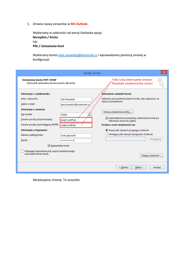 1. Zmiana nazwy serwerów w MS Outlook. Wybieramy w zależności