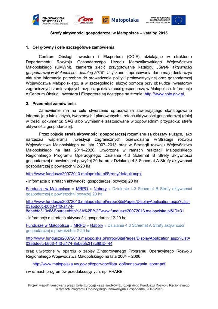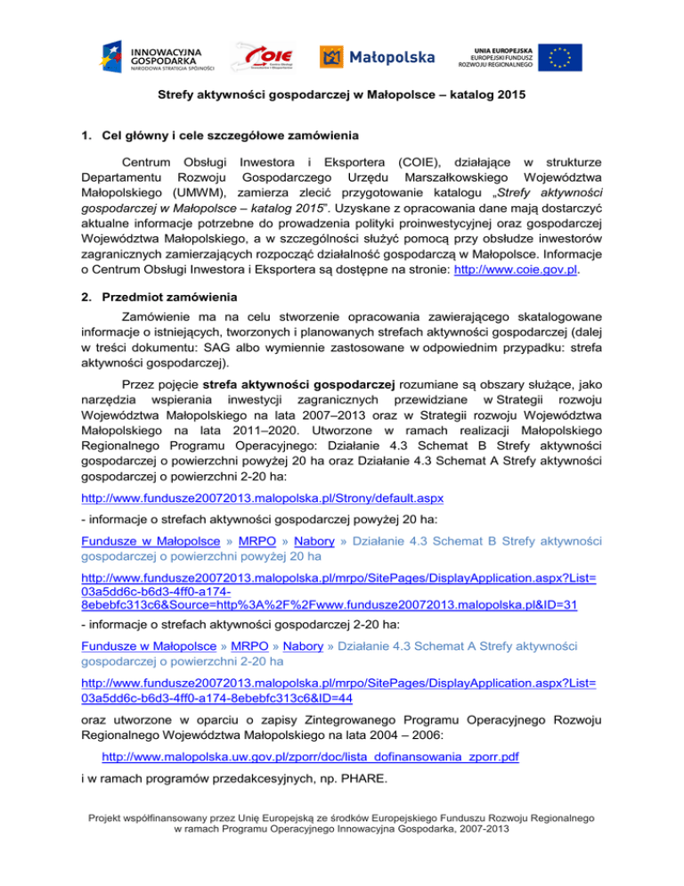 Strefy aktywności gospodarczej w Małopolsce – katalog 2015 1. Cel główny i cele szczegółowe zamówienia Centrum Obsługi Inwestora i Eksportera (COIE), działające w strukturze Departamentu Rozwoju Gospodarczego Urzędu Marszałkowskiego Województwa Małopolskiego (UMWM), zamierza zlecić przygotowanie katalogu „Strefy aktywności gospodarczej w Małopolsce – katalog 2015”. Uzyskane z opracowania dane mają dostarczyć aktualne informacje potrzebne do prowadzenia polityki proinwestycyjnej oraz gospodarczej Województwa Małopolskiego, a w szczególności służyć pomocą przy obsłudze inwestorów zagranicznych zamierzających rozpocząć działalność gospodarczą w Małopolsce. Informacje o Centrum Obsługi Inwestora i Eksportera są dostępne na stronie: http://www.coie.gov.pl. 2. Przedmiot zamówienia Zamówienie ma na celu stworzenie opracowania zawierającego skatalogowane informacje o istniejących, tworzonych i planowanych strefach aktywności gospodarczej (dalej w treści dokumentu: SAG albo wymiennie zastosowane w odpowiednim przypadku: strefa aktywności gospodarczej). Przez pojęcie strefa aktywności gospodarczej rozumiane są obszary służące, jako narzędzia wspierania inwestycji zagranicznych przewidziane w Strategii rozwoju Województwa Małopolskiego na lata 2007–2013 oraz w Strategii rozwoju Województwa Małopolskiego na lata 2011–2020. Utworzone w ramach realizacji Małopolskiego Regionalnego Programu Operacyjnego: Działanie 4.3 Schemat B Strefy aktywności gospodarczej o powierzchni powyżej 20 ha oraz Działanie 4.3 Schemat A Strefy aktywności gospodarczej o powierzchni 2-20 ha: http://www.fundusze20072013.malopolska.pl/Strony/default.aspx - informacje o strefach aktywności gospodarczej powyżej 20 ha: Fundusze w Małopolsce » MRPO » Nabory » Działanie 4.3 Schemat B Strefy aktywności gospodarczej o powierzchni powyżej 20 ha http://www.fundusze20072013.malopolska.pl/mrpo/SitePages/DisplayApplication.aspx?List= 03a5dd6c-b6d3-4ff0-a1748ebebfc313c6&Source=http%3A%2F%2Fwww.fundusze20072013.malopolska.pl&ID=31 - informacje o strefach aktywności gospodarczej 2-20 ha: Fundusze w Małopolsce » MRPO » Nabory » Działanie 4.3 Schemat A Strefy aktywności gospodarczej o powierzchni 2-20 ha http://www.fundusze20072013.malopolska.pl/mrpo/SitePages/DisplayApplication.aspx?List= 03a5dd6c-b6d3-4ff0-a174-8ebebfc313c6&ID=44 oraz utworzone w oparciu o zapisy Zintegrowanego Programu Operacyjnego Rozwoju Regionalnego Województwa Małopolskiego na lata 2004 – 2006: http://www.malopolska.uw.gov.pl/zporr/doc/lista_dofinansowania_zporr.pdf i w ramach programów przedakcesyjnych, np. PHARE. Projekt współfinansowany przez Unię Europejską ze środków Europejskiego Funduszu Rozwoju Regionalnego w ramach Programu Operacyjnego Innowacyjna Gospodarka, 2007-2013 W opracowaniu Wykonawca ma uwzględnić strefy aktywności gospodarczej już istniejące i tworzone w ramach wyszczególnionych wyżej programów, a także dokonać rozeznania wśród jednostek samorządu terytorialnego, czy w ciągu najbliższych 3 lat planowane jest utworzenie kolejnych SAG w oparciu o dofinansowanie z Małopolskiego Regionalnego Programu Operacyjnego na lata 2014 – 2020. Informacja o programie dostępna jest na stronie internetowej: http://www.fundusze.malopolska.pl/ Opracowanie będące przedmiotem zamówienia stanowić ma źródło niezbędnych informacji zgromadzonych w formie zapewniającej łatwy dostęp do informacji oraz ich prezentację inwestorom zagranicznym podczas spotkań biznesowych. Katalog stref aktywności gospodarczej zawierać ma podstawowe informacje o strefach aktywności gospodarczej w Małopolsce, takie jak: 1. Lokalizacja – umiejscowienie SAG na mapie województwa małopolskiego. 2. Powierzchnia istniejącej, tworzonej albo planowanej SAG. Informacja o ewentualnej możliwości powiększenia strefy aktywności gospodarczej lub możliwości zakupu sąsiadujących działek z przeznaczeniem pod prowadzenie działalności gospodarczej., 3. Lokalizacja na terenie SAG podstrefy specjalnej strefy ekonomicznej utworzonej na podstawie przepisów ustawy z dnia 20 października 1994 roku o specjalnych strefach ekonomicznych (tekst jedn. Dz. U. z 2015 r., poz. 282 ze zm.) oraz rozporządzenia Rady Ministrów z dnia 15 grudnia 2008 roku w sprawie krakowskiej specjalnej strefy ekonomicznej (tekst jedn. Dz. U. z 2014 r., poz. 714 ze zm.), rozporządzenia Rady Ministrów z dnia 15 grudnia 2008 roku w sprawie katowickiej specjalnej strefy ekonomicznej (tekst jedn. Dz. U. z 2014 r., poz. 229 ze zm.), rozporządzenia Rady Ministrów z dnia 15 grudnia 2008 roku w sprawie mieleckiej specjalnej strefy ekonomicznej (tekst jedn. Dz. U. nr 232, poz. 1555 ze zm.). 4. Przeznaczenie w planie zagospodarowania przestrzennego ewentualnie w studium uwarunkowań i kierunków zagospodarowania przestrzennego gminy, na terenie której zlokalizowana jest SAG. 5. Sieć istniejących połączeń komunikacyjnych / sieć planowanych połączeń komunikacyjnych – schematyczna mapka powiązań komunikacyjnych z odległościami do: Krakowa, międzynarodowego portu lotniczego w Balicach, Warszawy, granic Niemiec, Czech, Słowacji, Ukrainy. 6. Istniejące uzbrojenie / planowane uzbrojenie (wraz z informacją o dostępnej mocy / ilości możliwych do dostarczenia mediów) – informacja o istniejącym uzbrojeniu SAG (prąd, woda, gaz, kanalizacja) wraz informacją o parametrach istniejącej sieci uzbrojenia (dostępna moc prądu, dostępna objętość gazu, wody, możliwa do odbioru objętość ścieków), istnienie kanalizacji burzowej, odległość do przyłączy. Informacja o planowanych do wykonania instalacjach mediów w ramach tworzenia SAG, jeśli takie prace planowane są do wykonania. 7. Mapa strefy aktywności gospodarczej – schematyczny rzut terenu SAG. 8. Mapkę połączeń komunikacyjnych. Informacja o odległościach do: autostrady A4, 1 lub 2 najbliższych dróg krajowych, lini
