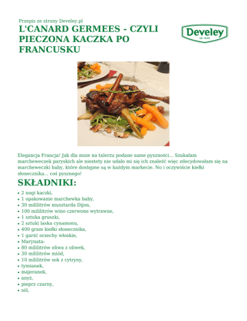 Przepis ze strony Develey.pl L'CANARD GERMEES - CZYLI PIECZONA KACZKA PO FRANCUSKU Elegancja Francja! Jak dla mnie na talerzu podane same pyszności... Szukałam marcheweczek paryskich ale niestety nie udało mi się ich znaleźć więc zdecydowałam się na marcheweczki baby, które dostępne są w każdym markecie. No i oczywiście kiełki słonecznika... coś pysznego! SKŁADNIKI: ● ● ● ● ● ● ● ● ● ● ● ● ● ● ● ● ● 2 nogi kaczki, 1 opakowanie marchewka baby, 30 mililitrów musztarda Dijon, 100 mililitrów wino czerwone wytrawne, 1 sztuka gruszki, 2 sztuki laska cynamonu, 400 gram kiełki słonecznika, 1 garść orzechy włoskie, Marynata: 80 mililitrów oliwa z oliwek, 30 mililitrów miód, 10 mililitrów sok z cytryny, tymianek, majeranek, anyż, pieprz czarny, sól, SPOSÓB PRZYGOTOWANIA: 1. 1. Jeden dzień wcześniej nogi z kaczki oczyścić i umieścić w marynacie zrobionej z oliwy, musztardy, miodu, soku z cytryny, tymianku, majeranku, anyżu, soli, pieprzu na 24 godziny. 2. Na następny dzień upiec na blaszce w temperaturze 180 stopni przez półtorej do dwóch godzin podlewając w międzyczasie winem. 3. Gruszkę przekrój na pół, wytnij gniazda nasienne i pokrój w długie plastry. 4. Z sosu który powstał podczas pieczenia nóżek odlać trochę i poddusić na nim gruszkę dodając laski cynamonu. 5. Gotowe udka ułóż na kiełkach i podduszonych gruszkach, posyp orzechami włoskimi wcześniej podpieczonymi lekko na suchej patelni. 6. Podajemy z gotowaną al'dente baby marchewką okraszoną masłem.