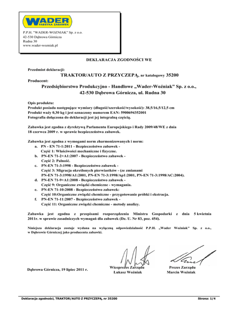P.P.H. "WADER-WOŹNIAK" Sp. z o.o. 42-530 Dąbrowa Górnicza Rudna 30 www.wader-wozniak.pl DEKLARACJA ZGODNOŚCI WE Przedmiot deklaracji: TRAKTOR/AUTO Z PRZYCZEPĄ, nr katalogowy 35200 Producent: Przedsiębiorstwo Produkcyjno - Handlowe „Wader-Woźniak” Sp. z o.o., 42-530 Dąbrowa Górnicza, ul. Rudna 30 Opis produktu: Produkt posiada następujące wymiary (długość/szerokość/wysokość): 38,5/16,5/12,5 cm Produkt waży 0,30 kg i jest oznaczony numerem EAN: 5900694352001 Fotografia dołączona do deklaracji jest jej integralną częścią. Zabawka jest zgodna z dyrektywą Parlamentu Europejskiego i Rady 2009/48/WE z dnia 18 czerwca 2009 r. w sprawie bezpieczeństwa zabawek. Zabawka jest zgodna z wymogami norm zharmonizowanych i norm: a. PN - EN 71-1:2011 - Bezpieczeństwo zabawek Część 1: Właściwości mechaniczne i fizyczne. b. PN-EN 71-2+A1:2007 - Bezpieczeństwo zabawek Część 2: Palność. c. PN-EN 71-3:1998 - Bezpieczeństwo zabawek Część 3: Migracja określonych pierwiastków - (ze zmianami PN-EN 71-3:1998/A1:2001, PN-EN 71-3:1998/Ap1:2001, PN-EN 71-3:1998/AC:2004). d. PN-EN 71-9+A1:2008 - Bezpieczeństwo zabawek Część 9: Organiczne związki chemiczne - wymagania. e. PN-EN 71-10:2008 - Bezpieczeństwo zabawek: Część 10:Organiczne związki chemiczne - przygotowanie próbki i ekstracja. f. PN-EN 71-11:2007 - Bezpieczeństwo zabawek Część 11: Organiczne związki chemiczne - metody analizy. Zabawka jest zgodna z przepisami rozporządzenia Ministra Gospodarki 2011r. w sprawie zasadniczych wymagań dla zabawek (Dz. U. Nr 83, poz. 454). z dnia 5 kwietnia Niniejsza deklaracja zostaje wydana na wyłączną odpowiedzialność P.P.H. „Wader Woźniak" Sp. z o.o., w Dąbrowie Górniczej jako producenta zabawki. Dąbrowa Górnicza, 19 lipiec 2011 r. Wiceprezes Zarządu Łukasz Woźniak Deklaracja zgodności, TRAKTOR/AUTO Z PRZYCZEPĄ, nr 35200 Prezes Zarządu Marcin Woźniak Strona: 1/4 P.P.H. "WADER-WOŹNIAK" Sp. z o.o. 42-530 Dąbrowa Górnicza Rudna 30 www.wader-wozniak.pl DEKLARACJA ZGODNOŚCI WE TRAKTOR/AUTO Z PRZYCZEPĄ, nr katalogowy 35200 Deklaracja zgodności, TRAKTOR/AUTO Z PRZYCZEPĄ, nr 35200 Strona: 2/4 P.P.H. "WADER-WOŹNIAK" Sp. z o.o. 42-530 Dąbrowa Górnicza Rudna 30 www.wader-wozniak.pl DEKLARACJA ZGODNOŚCI WE Deklaracja zgodności, TRAKTOR/AUTO Z PRZYCZEPĄ, nr 35200 Strona: 3/4 P.P.H. "WADER-WOŹNIAK" Sp. z o.o. 42-530 Dąbrowa Górnicza Rudna 30 www.wader-wozniak.pl DEKLARACJA ZGODNOŚCI WE Deklaracja zgodności, TRAKTOR/AUTO Z PRZYCZEPĄ, nr 35200 Strona: 4/4