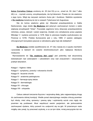 Aulus Cornelius Celsus urodzony ok. 25 (lub 53) p.n.e., zmarł ok. 50. (lub 7 albo 48) n.e. - rzymski uczony, encyklopedysta, nie był lekarzem. Prawie nic nie wiadomo o jego życiu. Mógł się nazywać zarówno Aulus jak i Aureliusz. Niektóre wyrażenia z De medicina świadczą że żył w czasach Tyberiusza lub Augustusa. Nie do końca wiadomo gdzie żył. Mieszkał prawdopodobnie w Gallia Narbonensis. Jego dzieło De Medicina jest jedynym zachowanym tomem o wiele większej encyklopedii "Artes". Pozostałe zaginione tomy dotyczyły prawdopodobnie rolnictwa, prawa, retoryki i sztuki wojennej. Zostało ono odnalezione przez papieża Mikołaja V i wydana ponownie w 1478. Była to pierwsza książka wydrukowana we Florencji w 1478r. Polskie tłumaczenie jest z roku 1889. Z opisów zabiegów chirurgicznych korzystano jeszcze w odrodzeniu gdyż były tak dokładne!! De Medicina została opublikowana ok. 47 roku naszej ery w języku łacińskim i pozostała w łaskach do czasów średniowiecznych jako najlepsza literatura medyczna. Wprowadzenie do "De medicina libri octo" jest polemiką nad słusznością doświadczeń nad zwierzętami i człowiekiem oraz nad znaczeniem i słusznością praktyk lekarskich. Księga I - higiena i dieta Księga II - symptomy, powody i rokowania chorób Księga III - leczenie chorób Księga IV - anatomia patologiczna Księga V - farmacja-opisy leków Księga VI - dermatologia Księga VII - chirurgia Księga VIII - ortopedia Celsus zalecał ćwiczenia fizyczne i racjonalną dietę, jako najpewniejszą drogę do zachowania dobrej kondycji. Wedle porad starożytnego medyka chirurg powinien być młody, mieć silną, sprawną i pewną rękę i wyśmienity wzrok oraz nigdy nie powinien się poddawać. Musi współczuć swoim pacjentom, ale jednocześnie zachowywać dystans, który pozwoli mu uodpornić się na jęki. W przeciwnym razie mógłby ulec presji, by pracować szybciej, a co za tym idzie, mniej precyzyjnie lub nie ciąć wystarczająco głęboko. Celsus wymienia ponad sto różnych instrumentów, którymi posługiwali się starożytni lekarze. Ciekawe, że wiele spośród nich stosuje się we współczesnej medycynie, chociażby: skalpele, cewniki, sondy, szczypce, specjalne narzędzia zakończone haczykami używane do usuwania grotów, a także obcęgi do wyrywania zębów, a niektóre z nich np. cewnik i wziernik, przetrwały do dziś w niezmienionej postaci. Narzędzia te projektowano z niezwykłą dbałością i przemyśleniem celu zastosowania - od usuwania katarakt po operowanie hemoroidów. Celsus również zawarł w swoim dziele "De medicina libri octo", jak należy usuwać zęby. Na początku trzeba było oskrobać je z dziąseł i poruszyć, powtarzając tę czynność dopóki ząb się nie obluzuje. Następnym krokiem było wyrwanie zęba ręką, a jeżeli nie udawało się to, wówczas należało użyć specjalnych cęgów. Pozostawienie korzenia w zębodole wymagało użycia kleszczy (rhizagra), którymi można było go usunąć. Za wskazania do usunięcia zębów przyjmował: gwałtowny ból, stan zapalny zębopochodny, przetokę dziąsłową, ropociek zębodołowy oraz ząb mleczny, który przeszkadzał w wyrzynaniu się zęba stałego. Przy ekstrakcji zębów z dużym ubytkiem próchnicowym, wypełniał je wcześniej ołowiem, aby nie nastąpiło rozkruszenie korony. Polecał też wkładać do ubytku ziarno pieprzu, jagodę bluszczu lub ałun, które miały ząb rozkruszyć. W tym samym calu stosował również okładanie zęba roztartą i rozprażoną ością ryby płaszczki zarobioną żywicą. Celsus uważał, podobnie jak Hipokrates, iż wyrywanie zębów mocno tkwiących w szczęce jest niebezpieczne. Rzymianie nadali Celsusowi tytuł zaszczytny "Cicero medicus". Nazywany jest też często "Hipokratesem Rzymu". cytaty: * Optimum medicamentum quies est - Najlepszym lekarstwem jest spokój. * Non interest, quid morbum faciat, sed quid tollat - Nie jest ważne, co wywołuje chorobę, ale co ją usuwa. Przyrządy medyczne Rzymski fresk przedstawiający lekarza udzielającego pomocy medycznej Rzymskie przyrządy medyczne. Powyżej kościane kleszcze oraz kościane podważniki