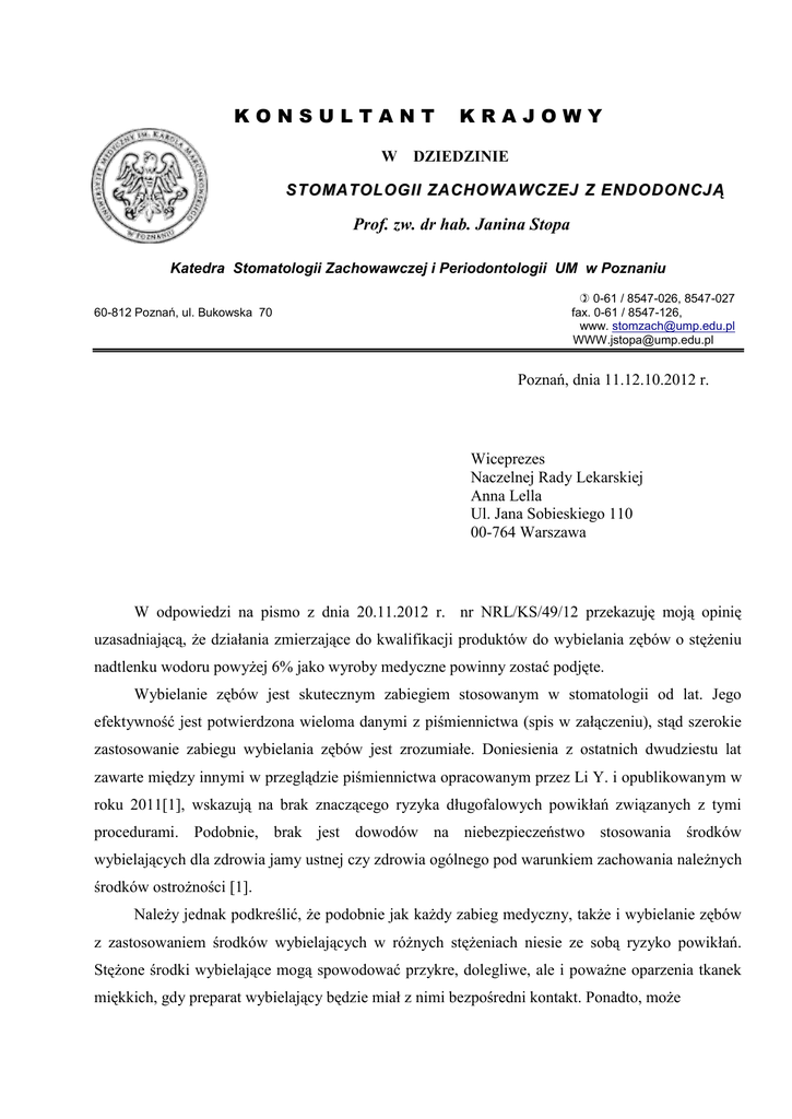KONSULTANT W KRAJOWY DZIEDZINIE STOMATOLOGII ZACHOWAWCZEJ Z ENDODONCJĄ Prof. zw. dr hab. Janina Stopa Katedra Stomatologii Zachowawczej i Periodontologii UM w Poznaniu 60-812 Poznań, ul. Bukowska 70 0-61 / 8547-026, 8547-027 fax. 0-61 / 8547-126, www. [email protected] [email protected] Poznań, dnia 11.12.10.2012 r. Wiceprezes Naczelnej Rady Lekarskiej Anna Lella Ul. Jana Sobieskiego 110 00-764 Warszawa W odpowiedzi na pismo z dnia 20.11.2012 r. nr NRL/KS/49/12 przekazuję moją opinię uzasadniającą, że działania zmierzające do kwalifikacji produktów do wybielania zębów o stężeniu nadtlenku wodoru powyżej 6% jako wyroby medyczne powinny zostać podjęte. Wybielanie zębów jest skutecznym zabiegiem stosowanym w stomatologii od lat. Jego efektywność jest potwierdzona wieloma danymi z piśmiennictwa (spis w załączeniu), stąd szerokie zastosowanie zabiegu wybielania zębów jest zrozumiałe. Doniesienia z ostatnich dwudziestu lat zawarte między innymi w przeglądzie piśmiennictwa opracowanym przez Li Y. i opublikowanym w roku 2011[1], wskazują na brak znaczącego ryzyka długofalowych powikłań związanych z tymi procedurami. Podobnie, brak jest dowodów na niebezpieczeństwo stosowania środków wybielających dla zdrowia jamy ustnej czy zdrowia ogólnego pod warunkiem zachowania należnych środków ostrożności [1]. Należy jednak podkreślić, że podobnie jak każdy zabieg medyczny, także i wybielanie zębów z zastosowaniem środków wybielających w różnych stężeniach niesie ze sobą ryzyko powikłań. Stężone środki wybielające mogą spowodować przykre, dolegliwe, ale i poważne oparzenia tkanek miękkich, gdy preparat wybielający będzie miał z nimi bezpośredni kontakt. Ponadto, może wystąpić miejscowy stan zapalny, obrzęk, uszkodzenie naczyń a nawet rozległa martwica naskórka [2]. Wybielanie zębów może również powodować powstanie przejściowej wrażliwości pozabiegowej [3,4,5]. Opisywane są również przypadki zmian w strukturze powierzchniowej szkliwa [6,7,8,9], obniżenia siły wiązania materiałów kompozytowych do wybielanych tkanek [10,11] czy tendencji do zwiększonej kolonizacji bakterii próchnicotwórczych [12,13,14,15]. Powikłania zabiegowe mają jednak charakter przejściowy a dobra ich znajomość oraz zastosowanie odpowiednich środków ostrożności czy odpowiednich zabiegów leczniczych mogą skutecznie redukować ich występowanie oraz minimalizować ich znaczenie kliniczne. Uważam, że stanowisko wyrażone przez Komisją Europejską i uznanie, że produkty do wybielania zębów należy kwalifikować wyłącznie jako kosmetyki jest niesłuszne. Dopuszczenie do obrotu jako kosmetyki powinno dotyczyć wyłącznie produktów o zawartości nadtlenku wodoru pomiędzy 0,1 a 6%. Produkty do wybielania zębów zawierające stężenie nadtlenku wodoru przekraczające 6% powinny być kwalifikowane jako wyroby medyczne tak, aby były dostępne dla lekarzy dentystów. Należy zatem, w mojej opinii, podjąć działania zmierzające do jednoznacznego określenia stanu prawnego produktów o stężeniu nadtlenku wodoru przekraczającym 6% i uznania ich jako wyrób medyczny. To prawdopodobnie gwarantowałoby wykluczenie możliwości stosowania tych środków przez nieuprawnione osoby oraz zapewniałoby skuteczność i bezpieczeństwo zabiegów wybielania. Z poważaniem Konsultant Krajowy w dziedzinie stomatologii zachowawczej z endodoncją Prof. zw.dr hab. Janina Stopa Piśmiennictwo [1] Li Y.: Safety controversies in tooth bleaching. Dent Clin North Am. 2011 Apr.55(2), 255-63. [2] Minoux M., Serfaty R.: Vital tooth bleaching: Biologic adverse effects – A review. Quintessence Int 2008, 39, 645-659. [3] Leonard R.H. Jr, Bentley C., Eagle J.C., Garland G.E., Knight M.C., Phillips C.: Nightguard vital bleaching: A long-term study on efficacy, shade retention, side effects, and patients’ perceptions. J Esthet Restor Dent 2001, 13, 357-369. [4] Jorgensen M.G., Carroll W.B.: Incidence of tooth sensitivity after home whitening treatment. J Am Dent Assoc 2002, 133, 1076-1082. [5] Pohjola R.M., Browning W.D., Hackman S.T., Myers M.L., Downey M.C.: Sensitivity and tooth whitening agents. J Esthet Restor Dent 2002, 14, 85-91. [6] Ernst CP, Marroquin BB, Willershausen-Zonnchen B.: Effects of hydrogen peroxide-containing bleaching agents on the morphology of human enamel. Quintessence Int 1996, 27, 53—56. [7] Ben-Amar A, Liberman R, Gorfil C, Bernstein Y.: Effect of mouthguard bleaching on enamel surface. Am J Dent 1995, 8, 29-32. [8] Spalding M, Taveira LA, de Assis GF.: Scanning electron microscopy study of dental enamel surface exposed to 35% hydrogen peroxide: Alone, with saliva, and with 10% carbamide peroxide. J Esthet Restor Dent 2003, 15, 154-164. [9] Yeh ST, Su Y, Lu YC, Lee SY.: Surface changes and acid dissolution of enamel after carbamide peroxide bleach treatment. Oper Dent 2005, 30, 507-515 [10] Titley K.C., Torneck C.D. Ruse N.D., Krmec D.: Adhesion of resin composite to bleached and unbleached human enamel. J Endod 1993, 19, 112-115 [11] Torneck C.D., Titley K.C., Smith D.C., Adibfar A.: The influence of time of hydrogen peroxide exposure on the adhesion of composite resin to bleached bovine enamel. J Endod 1990, 16, 123-128. [12] Akal N, Over H, Olmez A, Bodur H.: Effects of carbamide peroxide containing bleaching agents on the morphology and subsurface hardness of enamel. J Clin Pediatr Dent 2001, 25, 293—6. [13] Mor C, Steinberg D, Dogan H, Rotstein I.: Bacterial adherence to bleached surfaces of composite resin in vitro. Oral Surg Oral Med Oral Pathol Oral Radiol Endod 1998, 86, 582—586. [14] Steinberg D, Mor C, Dogan H, Zacks B, Rotstein I.: Effect of salivary biofilm on the adherence of oral bacteria to bleached and non-bleached restorative material. Dent Mater 1999, 15, 14—20. [15] Gurgan S, Bolay S, Alacam R.: In vitro adherence of bacteria to bleached or unbleached enamel surfaces. J Oral Rehabil 1997, 