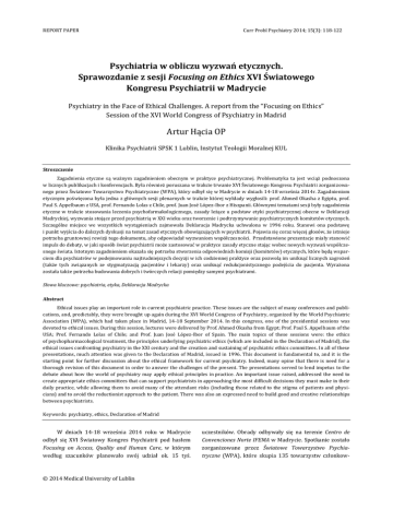 REPORT PAPER Curr Probl Psychiatry 2014; 15(3): 118-122 Psychiatria w obliczu wyzwań etycznych. Sprawozdanie z sesji Focusing on Ethics XVI Światowego Kongresu Psychiatrii w Madrycie Psychiatry in the Face of Ethical Challenges. A report from the “Focusing on Ethics” Session of the XVI World Congress of Psychiatry in Madrid Artur Hącia OP Klinika Psychiatrii SPSK 1 Lublin, Instytut Teologii Moralnej KUL Streszczenie Zagadnienia etyczne są ważnym zagadnieniem obecnym w praktyce psychiatrycznej. Problematyka ta jest wciąż podnoszona w licznych publikacjach i konferencjach. Była również poruszana w trakcie trwanie XVI Światowego Kongresu Psychiatrii zorganizowanego przez Światowe Towarzystwo Psychiatryczne (WPA), który odbył się w Madrycie w dniach 14-18 września 2014r. Zagadnieniom etycznym poświęcona była jedna z głównych sesji plenarnych w trakcie której wykłady wygłosili: prof. Ahmed Okasha z Egiptu, prof. Paul S. Appelbaum z USA, prof. Fernando Lolas z Chile, prof. Juan José López-Ibor z Hiszpanii. Głównymi tematami sesji były zagadnienia etyczne w trakcie stosowania leczenia psychofarmakologicznego, zasady leżące u podstaw etyki psychiatrycznej obecne w Deklaracji Madryckiej, wyzwania stojące przed psychiatrią w XXI wieku oraz tworzenie i podtrzymywanie psychiatrycznych komitetów etycznych. Szczególne miejsce we wszystkich wystąpieniach zajmowała Deklaracja Madrycka uchwalona w 1996 roku. Stanowi ona podstawę i punkt wyjścia do dalszych dyskusji na temat zasad etycznych obowiązujących w psychiatrii. Pojawia się coraz więcej głosów, że istnieje potrzeba gruntownej rewizji tego dokumentu, aby odpowiadał wyzwaniom współczesności. Przedstawione prezentacje miały stanowić impuls do debaty, w jaki sposób świat psychiatrii może zastosować w praktyce zasady etyczne stając wobec nowych wyzwań współczesnego świata. Istotnym zagadnieniem okazała się potrzeba stworzenia odpowiednich komisji (komitetów) etycznych, które będą wsparciem dla psychiatrów w podejmowaniu najtrudniejszych decyzji w ich codziennej praktyce oraz pozwolą im uniknąć licznych zagrożeń (także tych związanych ze stygmatyzacją pacjentów i lekarzy) oraz uniknąć redukcjonistycznego podejścia do pacjenta. Wyrażona została także potrzeba budowania dobrych i twórczych relacji pomiędzy samymi psychiatrami. Słowa kluczowe: psychiatria, etyka, Deklaracja Madrycka Abstract Ethical issues play an important role in current psychiatric practice. These issues are the subject of many conferences and publications, and, predictably, they were brought up again during the XVI World Congress of Psychiatry, organized by the World Psychiatric Association (WPA), which had taken place in Madrid, 14-18 September 2014. In this congress, one of the presidential sessions was devoted to ethical issues. During this session, lectures were delivered by Prof. Ahmed Okasha from Egypt; Prof. Paul S. Appelbaum of the USA; Prof. Fernando Lolas of Chile; and Prof. Juan José López-Ibor of Spain. The main topics of these sessions were: the ethics of psychopharmacological treatment, the principles underlying psychiatric ethics (which are included in the Declaration of Madrid), the ethical issues confronting psychiatry in the XXI century and the creation and sustaining of psychiatric ethics committees. In all of these presentations, much attention was given to the Declaration of Madrid, issued in 1996. This document is fundamental to, and it is the starting point for further discussion about the ethical framework for current psychiatry. Indeed, many opine that there is need for a thorough revision of this document in order to answer the challenges of the present. The presentations served to lend impetus to the debate about how the world of psychiatry may apply ethical principles in practice. An important issue raised, addressed the need to create appropriate ethics committees that can support psychiatrists in approaching the most difficult decisions they must make in their daily practice, while allowing them to avoid many of the attendant risks (including those related to the stigma of patients and physicians) and to avoid the reductionist approach to the patient. There was also an expressed need to build good and creative relationships between psychiatrists. Keywords: psychiatry, ethics, Declaration of Madrid W dniach 14-18 września 2014 roku w Madrycie odbył się XVI Światowy Kongres Psychiatrii pod hasłem Focusing on Access, Quality and Human Care, w którym według szacunków planowało swój udział ok. 15 tyś. © 2014 Medical University of Lublin uczestników. Obrady odbywały się na terenie Centro de Convenciones Norte IFEMA w Madrycie. Spotkanie zostało zorganizowane przez Światowe Towarzystwo Psychiatryczne (WPA), które skupia 135 towarzystw członkow- Psychiatria w obliczu wyzwań etycznych. Sprawozdanie z sesji Focusing on Ethics XVI… skich (m.in. Polskie Towarzystwo Psychiatryczne) ze 117 krajów i liczy ponad 200 tyś członków. Kongres dawał możliwość uczestniczenia w licznych spotkaniach w ramach 65 sekcji naukowych mając na celu wymianę wiedzy i doświadczeń pomiędzy psychiatrami różnych specjalności zdobytymi w ciągu ostatnich trzech lat (od ostatniego Kongresu w Buenos Aires w Argentynie w 2011 roku). W trakcie obrad w ramach seminariów, wykładów, sympozjów, warsztatów i wykładów plenarnych szczególne miejsce zajmowała tematyka etyczna i bioetyczna. Właśnie tym zagadnieniom poświęcona była pierwsza sesja plenarna (jedna z czterech tzw. Presidential Session) poprowadzona przez prof. Pedro Ruiza (USA) przewodniczącego WPA oraz przez prof. Ahmeda Okashę (Egipt). W trakcie sesji wykłady wygłosili: prof. Ahmed Okasha (Egipt) - „Focusing on ethics of psychopharmacological treatment”, prof. Paul S. Appelbaum (USA) - „Principles underlying psychiatric ethics: Declaration of Dadrid”, prof. Fernando Lolas (Chile) - „Eth