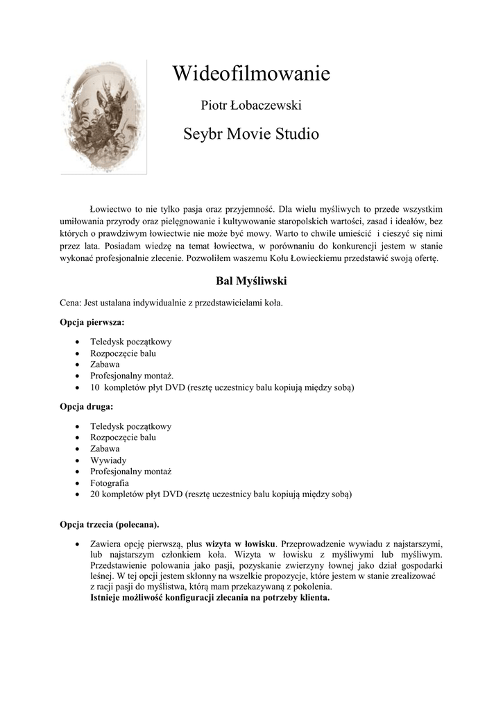 Wideofilmowanie Piotr Łobaczewski Seybr Movie Studio Łowiectwo to nie tylko pasja oraz przyjemność. Dla wielu myśliwych to przede wszystkim umiłowania przyrody oraz pielęgnowanie i kultywowanie staropolskich wartości, zasad i ideałów, bez których o prawdziwym łowiectwie nie może być mowy. Warto to chwile umieścić i cieszyć się nimi przez lata. Posiadam wiedzę na temat łowiectwa, w porównaniu do konkurencji jestem w stanie wykonać profesjonalnie zlecenie. Pozwoliłem waszemu Kołu Łowieckiemu przedstawić swoją ofertę. Bal Myśliwski Cena: Jest ustalana indywidualnie z przedstawicielami koła. Opcja pierwsza: Teledysk początkowy Rozpoczęcie balu Zabawa Profesjonalny montaż. 10 kompletów płyt DVD (resztę uczestnicy balu kopiują między sobą) Opcja druga: Teledysk początkowy Rozpoczęcie balu Zabawa Wywiady Profesjonalny montaż Fotografia 20 kompletów płyt DVD (resztę uczestnicy balu kopiują między sobą) Opcja trzecia (polecana). Zawiera opcję pierwszą, plus wizyta w łowisku. Przeprowadzenie wywiadu z najstarszymi, lub najstarszym członkiem koła. Wizyta w łowisku z myśliwymi lub myśliwym. Przedstawienie polowania jako pasji, pozyskanie zwierzyny łownej jako dział gospodarki leśnej. W tej opcji jestem skłonny na wszelkie propozycje, które jestem w stanie zrealizować z racji pasji do myślistwa, którą mam przekazywaną z pokolenia. Istnieje możliwość konfiguracji zlecania na potrzeby klienta. Imprezy jubileuszowe Cena: Jest ustalana indywidualnie z przedstawicielami koła Opcja pierwsza: Teledysk początkowy Msza Święta Rozpoczęcie balu Zabawa Profesjonalny montaż. 10 kompletów płyt DVD (resztę uczestnicy balu kopiują między sobą) Opcja druga: Teledysk początkowy Msza Święta. Rozpoczęcie balu Zabawa Wywiady Profesjonalny montaż Fotografia (około 100 zdjęć dostarczonych w postaci cyfrowej). 20 kompletów płyt DVD (resztę uczestnicy balu kopiują między sobą) Opcja trzecia (polecana). Zawiera opcję pierwszą, plus wizyta w łowisku. Przeprowadzenie wywiadu z najstarszymi, lub najstarszym członkiem koła. Wizyta w łowisku z myśliwymi lub myśliwym. Przedstawienie polowania jako pasji, pozyskanie zwierzyny łownej jako dział gospodarki leśnej. W tej opcji jestem skłonny na wszelkie propozycje, które jestem w stanie zrealizować z racji pasji do myślistwa, którą mam przekazywaną z pokolenia. Polowania Hubertowskie, zbiorowe, dewizowe. Propozycja zawartości filmu: Teledysk początkowy Rozpoczęcie polowania Polowanie Rozmowa z myśliwymi Śniadanie, obiad. Pomysły własne (po akceptacji prowadzącego polowanie, członków koła). Pomysły członków, prowadzącego polowanie. Fotografia (opcja na życzenie). Cena: Jest ustalana indywidualnie z przedstawicielami koła Istnieje możliwość konfiguracji zlecania na potrzeby klienta. Dane kontaktowe: Piotr Łobaczewski Tel: 504-483-206 Mail: [email protected] [email protected] Strona: www.seybr-movie.pl