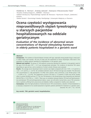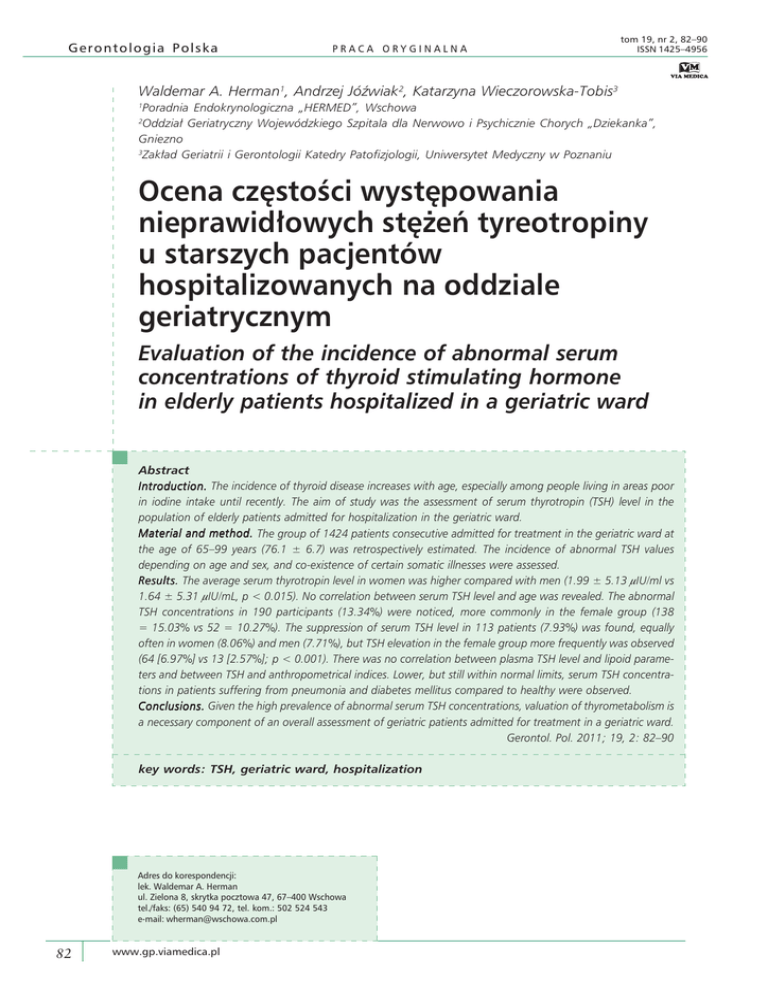Gerontologia Polska PRACA ORYGINALNA tom 19, nr 2, 82–90 ISSN 1425–4956 Waldemar A. Herman1, Andrzej Jóźwiak2, Katarzyna Wieczorowska-Tobis3 1 Poradnia Endokrynologiczna „HERMED”, Wschowa Oddział Geriatryczny Wojewódzkiego Szpitala dla Nerwowo i Psychicznie Chorych „Dziekanka”, Gniezno 3 Zakład Geriatrii i Gerontologii Katedry Patofizjologii, Uniwersytet Medyczny w Poznaniu 2 Ocena częstości występowania nieprawidłowych stężeń tyreotropiny u starszych pacjentów hospitalizowanych na oddziale geriatrycznym Evaluation of the incidence of abnormal serum concentrations of thyroid stimulating hormone in elderly patients hospitalized in a geriatric ward Abstract Introduction. The incidence of thyroid disease increases with age, especially among people living in areas poor in iodine intake until recently. The aim of study was the assessment of serum thyrotropin (TSH) level in the population of elderly patients admitted for hospitalization in the geriatric ward. Material and method. The group of 1424 patients consecutive admitted for treatment in the geriatric ward at the age of 65–99 years (76.1 ± 6.7) was retrospectively estimated. The incidence of abnormal TSH values depending on age and sex, and co-existence of certain somatic illnesses were assessed. Results. The average serum thyrotropin level in women was higher compared with men (1.99 ± 5.13 mIU/ml vs 1.64 ± 5.31 mIU/mL, p < 0.015). No correlation between serum TSH level and age was revealed. The abnormal TSH concentrations in 190 participants (13.34%) were noticed, more commonly in the female group (138 = 15.03% vs 52 = 10.27%). The suppression of serum TSH level in 113 patients (7.93%) was found, equally often in women (8.06%) and men (7.71%), but TSH elevation in the female group more frequently was observed (64 [6.97%] vs 13 [2.57%]; p < 0.001). There was no correlation between plasma TSH level and lipoid parameters and between TSH and anthropometrical indices. Lower, but still within normal limits, serum TSH concentrations in patients suffering from pneumonia and diabetes mellitus compared to healthy were observed. Conclusions. Given the high prevalence of abnormal serum TSH concentrations, valuation of thyrometabolism is a necessary component of an overall assessment of geriatric patients admitted for treatment in a geriatric ward. Gerontol. Pol. 2011; 19, 2: 82–90 key words: TSH, geriatric ward, hospitalization Adres do korespondencji: lek. Waldemar A. Herman ul. Zielona 8, skrytka pocztowa 47, 67–400 Wschowa tel./faks: (65) 540 94 72, tel. kom.: 502 524 543 e-mail: [email protected] 82 www.gp.viamedica.pl Waldemar A. Herman i wsp., TSH u hospitalizowanych na oddziale geriatrii Wstęp Zmiany towarzyszące procesowi starzenia się, zarówno fizjologiczne (off aging), jak i będące wyrazem wielu patologii (in aging), dotyczą wszystkich narządów. Jednakże za najważniejsze, determinujące szybkość starzenia uważa się zmiany zachodzące w układach neurologicznym, immunologicznym [1] oraz dokrewnym [2] (neuroimmunoendosenescence). W obrębie układu dokrewnego bardzo istotne z punktu widzenia klinicznego są procesy zachodzące w obrębie osi podwzgórze–przysadka–tarczyca. W procesie starzenia się organizmu dochodzi do ubytku rezerwy wydzielniczej podwzgórza [tyreoliberyna (TRH, thyrotropin-releasing hormone)] oraz przysadki [tyreotropina (TSH, thyroid-stimulating hormone)]. Wskutek procesu nieenzymatycznej glikacji cząsteczka tyreotropiny może wykazywać słabszą aktywność biologiczną, choć zachowuje swoje właściwości immunoreaktywne [3]. Nocne przyrosty stężenia TSH wykazują odwrotną korelację z wiekiem, natomiast odpowiedź na stymulację TRH (mierzoną przyrostem stężenia TSH i prolaktyny) jest wyraźnie osłabiona u najstarszych osób [4]. Ponadto wraz z wiekiem obserwuje się zmiany strukturalne w gruczole tarczowym (włóknienie, nacieki limfocytarne) oraz czynnościowe (zmniejszenie aktywności symportera jodowo-sodowego NIS) [5]. Dodatkowo wskutek upośledzenia funkcji dejodynaz dochodzi do zaburzenia obwodowej konwersji tyroksyny (T4) w trójjodotyroninę (T3) [6]. Zapadalność na schorzenia tarczycy jest wysoka u osób w starszym wieku, zwłaszcza wśród ludności zamieszkałej na terenach do niedawna ubogich w jod. Długo trwający niedobór tego mikroelementu, oprócz działania wolotwórczego, wpływa na rozwój wola guzkowego (stymulacja TSH) oraz na zwiększoną zapadalność na raka pęcherzykowego tarczycy [7]. Za najczęstsze schorzenie tarczycy wśród osób w starszym wieku uznaje się niedoczynność tarczycy spowodowaną przewlekłym limfocytarnym zapaleniem typu Hashimoto [8]. Starsze osoby wykazują też zwiększoną zapadalność na nieautoimmunologiczne tyreotoksykozy (wole wieloguzkowe toksyczne — choroba Plummera oraz pojedynczy guzek toksyczny — choroba Goetscha), zachorowalność na chorobę Gravesa-Basedowa zaś wyraźnie się u nich zmniejsza [9]. Nowotwory tarczycy częściej również występują u osób w podeszłym wieku, natomiast ich przebieg jest zwykle bardziej agresywny (zwłaszcza u mężczyzn). Dość często spotyka się — rzadkie u młodszych — nowotwory anaplastyczne tarczycy oraz chłonia- ki. Zaburzenia hormonalne nierzadko występują również w przebiegu schorzeń nowotworowych tarczycy, a tyreotoksykoza bynajmniej nie wyklucza obecności złośliwego nowotworu. Zaburzenia funkcji tarczycy mogą maskować lub modyfikować przebieg innych schorzeń, szczególnie zespołu otępiennego [10]. Biorąc pod uwagę odrębną symptomatologię schorzeń tarczycy u starszych osób, do rozpoznania ewentualnej patologii tego gruczołu stosuje się badania dodatkowe, przede wszystkim laboratoryjne. Ze względów ekonomicznych oraz z powodu powszechnej dostępności oznaczenia TSH diagnostykę osi podwzgórze–przysadka–tarczyca, przynajmniej we wstępnym okresie, ogranicza się często do rutynowego oznaczenia stężeni