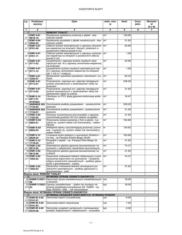 KOSZTORYS ŚLEPY Lp. Podstawa wyceny Opis Jedn. mia