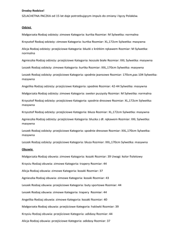 Drodzy Rodzice! SZLACHETNA PACZKA od 15 lat daje potrzebującym impuls do zmiany i łączy Polaków. Odzież Małgorzata Rodzaj odzieży: zimowe Kategoria: kurtka Rozmiar: M Sylwetka: normalna Krzysztof Rodzaj odzieży: zimowe Kategoria: kurtka Rozmiar: XL,172cm Sylwetka: masywna Alicja Rodzaj odzieży: przejściowe Kategoria: bluzki z krótkim rękawem Rozmiar: M Sylwetka: normalna Agnieszka Rodzaj odzieży: przejściowe Kategoria: koszule białe Rozmiar: XXL Sylwetka: masywna Leszek Rodzaj odzieży: zimowe Kategoria: kurtka Rozmiar: XXL,170cm Sylwetka: masywna Leszek Rodzaj odzieży: przejściowe Kategoria: spodnie jeansowe Rozmiar: 170cm,pas 104 Sylwetka: masywna Angelika Rodzaj odzieży: przejściowe Kategoria: spodnie Rozmiar: 42-44 Sylwetka: masywna Małgorzata Rodzaj odzieży: zimowe Kategoria: sweter puszysty Rozmiar: M Sylwetka: normalna Krzysztof Rodzaj odzieży: przejściowe Kategoria: spodnie dresowe Rozmiar: XL,172cm Sylwetka: masywna Krzysztof Rodzaj odzieży: przejściowe Kategoria: bluza Rozmiar: XL,172cm Sylwetka: masywna Agnieszka Rodzaj odzieży: przejściowe Kategoria: bluzka z dł. rękawem Rozmiar: XXL Sylwetka: masywna Leszek Rodzaj odzieży: przejściowe Kategoria: spodnie dresowe Rozmiar: XXL,170cm Sylwetka: masywna Leszek Rodzaj odzieży: przejściowe Kategoria: bluza Rozmiar: XXL,170cm Sylwetka: masywna Obuwie Małgorzata Rodzaj obuwia: zimowe Kategoria: kozaki Rozmiar: 39 Uwagi: kolor fioletowy Krzysiu Rodzaj obuwia: zimowe Kategoria: trapery Rozmiar: 44 Alicja Rodzaj obuwia: zimowe Kategoria: kozaki Rozmiar: 37 Agnieszka Rodzaj obuwia: zimowe Kategoria: kozaki Rozmiar: 43 Leszek Rodzaj obuwia: przejściowe Kategoria: buty sportowe Rozmiar: 44 Leszek Rodzaj obuwia: zimowe Kategoria: trapery Rozmiar: 44 Angelika Rodzaj obuwia: zimowe Kategoria: kozaki Rozmiar: 40 Małgorzata Rodzaj obuwia: przejściowe Kategoria: halówki Rozmiar: 39 Krzysiu Rodzaj obuwia: przejściowe Kategoria: adidasy Rozmiar: 44 Alicja Rodzaj obuwia: przejściowe Kategoria: adidasy Rozmiar: 37