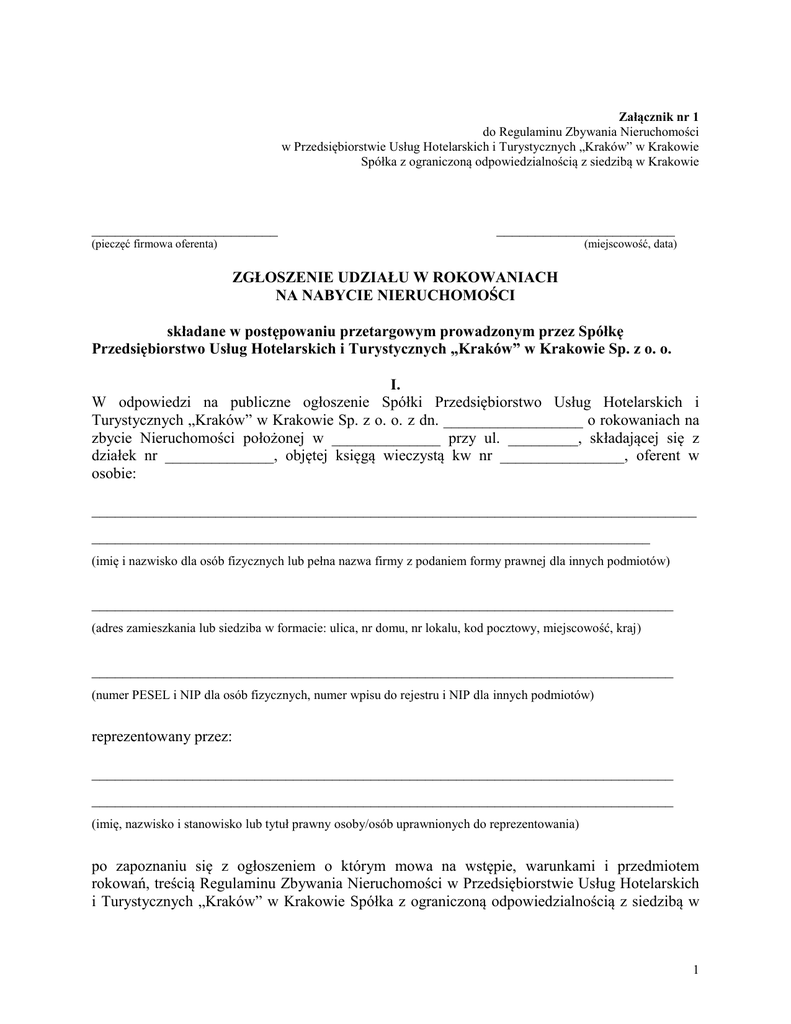 Załącznik nr 1 do Regulaminu Zbywania Nieruchomości w Przedsiębiorstwie Usług Hotelarskich i Turystycznych „Kraków” w Krakowie Spółka z ograniczoną odpowiedzialnością z siedzibą w Krakowie ________________________ _______________________ (pieczęć firmowa oferenta) (miejscowość, data) ZGŁOSZENIE UDZIAŁU W ROKOWANIACH NA NABYCIE NIERUCHOMOŚCI składane w postępowaniu przetargowym prowadzonym przez Spółkę Przedsiębiorstwo Usług Hotelarskich i Turystycznych „Kraków” w Krakowie Sp. z o. o. I. W odpowiedzi na publiczne ogłoszenie Spółki Przedsiębiorstwo Usług Hotelarskich i Turystycznych „Kraków” w Krakowie Sp. z o. o. z dn. __________________ o rokowaniach na zbycie Nieruchomości położonej w ______________ przy ul. _________, składającej się z działek nr ______________, objętej księgą wieczystą kw nr ________________, oferent w osobie: ______________________________________________________________________________ ________________________________________________________________________ (imię i nazwisko dla osób fizycznych lub pełna nazwa firmy z podaniem formy prawnej dla innych podmiotów) ___________________________________________________________________________ (adres zamieszkania lub siedziba w formacie: ulica, nr domu, nr lokalu, kod pocztowy, miejscowość, kraj) ___________________________________________________________________________ (numer PESEL i NIP dla osób fizycznych, numer wpisu do rejestru i NIP dla innych podmiotów) reprezentowany przez: ___________________________________________________________________________ ___________________________________________________________________________ (imię, nazwisko i stanowisko lub tytuł prawny osoby/osób uprawnionych do reprezentowania) po zapoznaniu się z ogłoszeniem o którym mowa na wstępie, warunkami i przedmiotem rokowań, treścią Regulaminu Zbywania Nieruchomości w Przedsiębiorstwie Usług Hotelarskich i Turystycznych „Kraków” w Krakowie Spółka z ograniczoną odpowiedzialnością z siedzibą w 1 Krakowie przyjętego Uchwałą Zarządu Spółki nr ___/2012 z dnia ______.2012r., oświadcza iż przyjmuje powyższe warunki bez zastrzeżeń oraz składa zgłoszenie udziału w rokowaniach. II. Oferent w osobie: ______________________________________________________________________________ ________________________________________________________________________ (imię i nazwisko dla osób fizycznych lub pełna nazwa firmy z podaniem formy prawnej dla innych podmiotów) proponuje niniejszym nabycie Nieruchomości położonej w ______________ przy ul. _________, składającej się z działek nr ______________, objętej księgą wieczystą kw nr ________________, o której mowa ogłoszeniu o przetargu na zbycie Nieruchomości z dn. ____________, za cenę w kwocie: ______________________________________________________________________________ ____________________________________________ netto plus należny podatek VAT. (kwota cyfrą oraz słownie) Zapłata ceny nastąpi najpóźniej na jeden dzień przed zawarciem umowy wywołującej skutek rzeczowy zbycia Nieruchomości, przelewem na rachunek bankowy spółki Przedsiębiorstwo Usług Hotelarskich i Turystycznych „Kraków” w Krakowie Spółka z ograniczoną odpowiedzialnością z siedzibą w Krakowie, przy czym przez dokonanie zapłaty rozumie się uznanie środków pieniężnych na rachunku bankowym Spółki. III. Proponowany sposób realizacji dodatkowych warunków rokowań: ______________________________________________________________________________ ______________________________________________________________________________ ______________________________________________________________________________ (opisać, jeżeli brak dodatkowych warunków przetargu – skreślić. _______________________________________________________ (podpis/y oferenta bądź osób uprawnionych do reprezentowania oferenta) Załączniki: 1) dowód wniesienia zaliczki 2) pełnomocnictwo (jeżeli oferenta reprezentuje osoba trzecia) 2