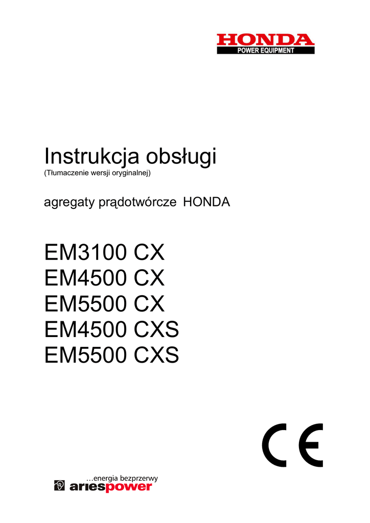 Instrukcja obsługi (Tłumaczenie wersji oryginalnej) agregaty prądotwórcze HONDA EM3100 CX EM4500 CX EM5500 CX EM4500 CXS EM5500 CXS SPIS TREŚCI WPROWADZENIE .................................................................................................................................. 3 1. WYMAGANIA BEZPIECZEŃSTWA ............................................................................................. 4 2. UMIESZCZENIE NAKLEJEK BEZPIECZEŃSTWA ..................................................................... 5 3. OPIS URZĄDZENIA ..................................................................................................................... 6 4. SPRAWDZENIE PRZED URUCHOMIENIEM.............................................................................. 9 5. URUCHAMIANIE SILNIKA ......................................................................................................... 12 6. EKSLOATACJA AGREGATU..................................................................................................... 19 7. ZATRZYMANIE SILNIKA ........................................................................................................... 22 8. PRZEGLĄDY I KONSERWACJA ............................................................................................... 23 9. TRANSPORT I PRZECHOWYWANIE ....................................................................................... 29 10. DANE TECHICZNE .................................................................................................................... 33 11. INSTALACJA ELEMENTÓW STANDARDOWYCH I OPCJI ..................................................... 36 12. SCHEMATY ELEKTRYCZNE .................................................................................................... 41 13. LISTA AUTORYZOWANYCH PUNKTÓW SERWISOWYCH .................................................... 44 2 WPROWADZENIE Szanowny Kliencie!! Dziękując za okazane nam zaufanie, gratulujemy jednocześnie udanego zakupu i trafnego wyboru urządzenia z bogatej oferty naszych wyrobów. Zostałeś właścicielem markowego agregatu prądotwórczego HONDA. Mamy nadzieję, że użytkowanie tego nowego urządzenia spełni Twoje oczekiwania, przynosząc pełną satysfakcję. Napisaliśmy tą instrukcję abyś mógł bezproblemowo i bezawaryjnie użytkować urządzenie. Prosimy o jej dokładne przeczytanie przed pierwszym uruchomieniem agregatu, abyś był świadomy jakie środki ostrożności należy przedsięwziąć w trakcie jego użytkowania. Instrukcja zawiera także kompendium wiedzy przydatnej przy wykonywaniu okresowych przeglądów technicznych. Pragniemy zwrócić uwagę, że instrukcja stanowi integralną część Twojego urządzenia, powinna być zatem trzymana pod ręką, tak aby zawsze można było z niej skorzystać. Prosimy o przekazanie jej nowemu użytkownikowi w przypadku odsprzedaży urządzenia. Proponujemy również zapoznać się z Warunkami Gwarancji, byś wiedział jakie przysługują Ci prawa i jakie są Twoje obowiązki jako Użytkownika. Karta Gwarancyjna jest osobnym dokumentem wydawanym przez Sprzedawcę w momencie sprzedaży. W przypadku niewłaściwego użytkowania wyrobu producent nie będzie ponosił odpowiedzialności z tytułu gwarancji za powstałe uszkodzenia. Wszystkie informacje zawarte w tej publikacji, oparte są na aktualnych danych o produkcie, dostępnych w chwili drukowania. ARIES Power Equipment Sp. z o.o. zastrzega sobie stałe prawo do wprowadzania zmian bez informowania o tym użytkownika i bez zaciągania jakichkolwiek zobowiązań. Żaden fragment tej publikacji nie może być powielany bez naszej pisemnej zgody. Bezpieczeństwo Twoje i innych jest dla nas sprawą priorytetową. W instrukcji i na urządzeniu umieściliśmy ważne informacje o zagrożeniach. Ostrzegają i informują one o potencjalnym niebezpieczeństwie, które może przynieść szkodę użytkownikowi i osobom trzecim. Niektóre punkty niniejszej instrukcji niosą szczególnie ważną informację dotyczącą bezpieczeństwa podczas eksploatacji i są odpowiednio oznaczone: Niezastosowanie się do zaleceń oznaczonych tym znakiem spowoduje poważne obrażenia ciała lub śmierć operatora lub osób postronnych. Niezastosowanie się do zaleceń oznaczonych tym znakiem może spowodować obrażenia ciała operatora lub innych osób. Tak oznaczono informacje przydatne w czasie użytkowania agregatu. Jeśli masz problem lub pytania dotyczące AGREGATU PRĄDOTRWÓRCZEGO z autoryzowanym dealerem HONDA, lub najbliższym autoryzowanym serwisem. 3 - skontaktuj się 1. WYMAGANIA BEZPIECZEŃSTWA Generatory Honda zaprojektowane są dla zapewnienia pełnej satysfakcji z ich użycia, pod warunkiem jednak, że obsługiwane są zgodnie z informacjami zamieszczonymi w niniejszej instrukcji. Dokładnie przeczytaj instrukcję przed uruchomieniem generatora. Zaniechanie tej czynności może być powodem poważnych obrażeń lub uszkodzenia generatora. Spaliny zawierają tlenek węgla – CO, który jest trującym, bezwonnym gazem. Nigdy nie pomieszczeniach. uruchamiaj Jeśli generatora uruchamiasz generator w zamkniętych w zamkniętym pomieszczeniu to zapewnij mu odpowiednią wentylację. Podczas pracy silnika tłumik nagrzewa się do bardzo wysokiej temperatury. Uważaj aby nie dotykać go dopóki jest gorący. Przed umieszczeniem generatora w zamkniętym pomieszczeniu pozwól silnikowi wystygnąć. System wylotowy spalin nagrzewa się podczas pracy silnika i pozostaje gorący jakiś czas po wyłączeniu silnika. By uniknąć oparzeń, zwróć szczególną uwagę na ostrzegające oznaczenia umieszczone na agregacie. • Zatrzymaj silnik zanim rozpoczniesz uzupełnianie paliwa Benzyna jest wysoce łatwopalna, a w pewnych warunkach wybuchowa. Uzupełniaj benzynę w dobrze wentylowanym miejscu i przy zatrzymanym silniku. • Podczas uzupełniania paliwa nie dopuść do zbliżenia otwartego ognia lub iskrzących urządzeń. • Rozlane pa
