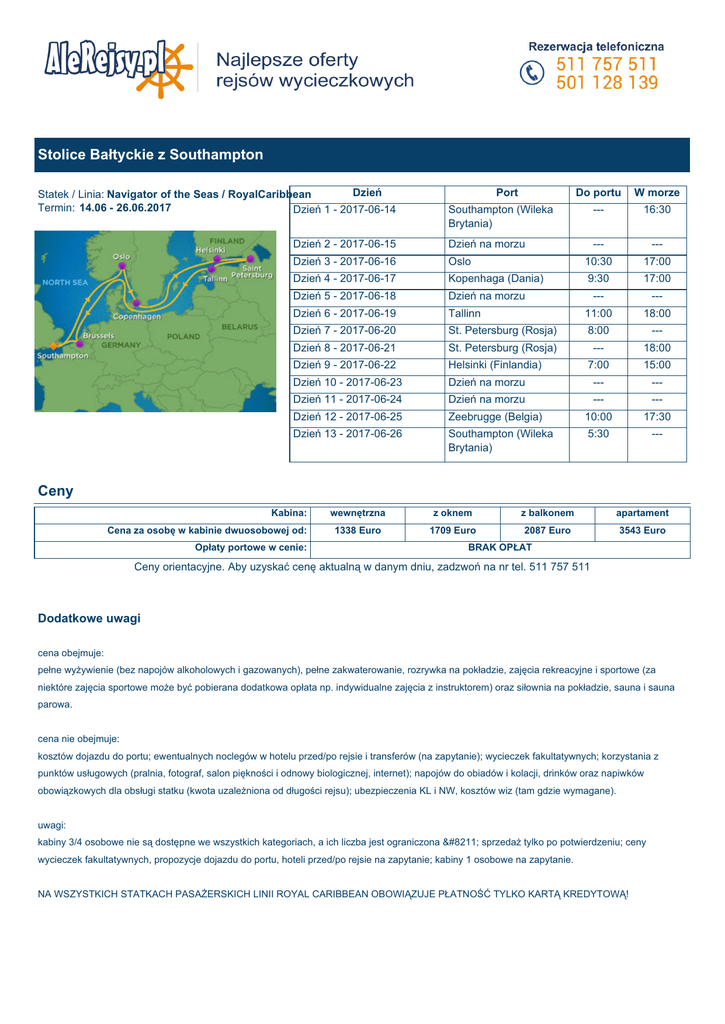 Stolice Bałtyckie z Southampton Dzień Statek / Linia: Navigator of the Seas / RoyalCaribbean Termin: 14.06 - 26.06.2017 Dzień 1 - 2017-06-14 Do portu W morze Southampton (Wileka Brytania) Port --- 16:30 Dzień 2 - 2017-06-15 Dzień na morzu --- --- Dzień 3 - 2017-06-16 Oslo 10:30 17:00 Dzień 4 - 2017-06-17 Kopenhaga (Dania) 9:30 17:00 Dzień 5 - 2017-06-18 Dzień na morzu --- --- Dzień 6 - 2017-06-19 Tallinn 11:00 18:00 Dzień 7 - 2017-06-20 St. Petersburg (Rosja) 8:00 --- Dzień 8 - 2017-06-21 St. Petersburg (Rosja) Dzień 9 - 2017-06-22 Helsinki (Finlandia) Dzień 10 - 2017-06-23 Dzień 11 - 2017-06-24 Dzień 12 - 2017-06-25 Dzień 13 - 2017-06-26 --- 18:00 7:00 15:00 Dzień na morzu --- --- Dzień na morzu --- --- Zeebrugge (Belgia) 10:00 17:30 Southampton (Wileka Brytania) 5:30 --- Ceny Kabina: Cena za osobę w kabinie dwuosobowej od: Opłaty portowe w cenie: wewnętrzna z oknem z balkonem apartament 1338 Euro 1709 Euro 2087 Euro 3543 Euro BRAK OPŁAT Ceny orientacyjne. Aby uzyskać cenę aktualną w danym dniu, zadzwoń na nr tel. 511 757 511 Dodatkowe uwagi cena obejmuje: pełne wyżywienie (bez napojów alkoholowych i gazowanych), pełne zakwaterowanie, rozrywka na pokładzie, zajęcia rekreacyjne i sportowe (za niektóre zajęcia sportowe może być pobierana dodatkowa opłata np. indywidualne zajęcia z instruktorem) oraz siłownia na pokładzie, sauna i sauna parowa. cena nie obejmuje: kosztów dojazdu do portu; ewentualnych noclegów w hotelu przed/po rejsie i transferów (na zapytanie); wycieczek fakultatywnych; korzystania z punktów usługowych (pralnia, fotograf, salon piękności i odnowy biologicznej, internet); napojów do obiadów i kolacji, drinków oraz napiwków obowiązkowych dla obsługi statku (kwota uzależniona od długości rejsu); ubezpieczenia KL i NW, kosztów wiz (tam gdzie wymagane). uwagi: kabiny 3/4 osobowe nie są dostępne we wszystkich kategoriach, a ich liczba jest ograniczona – sprzedaż tylko po potwierdzeniu; ceny wycieczek fakultatywnych, propozycje dojazdu do portu, hoteli przed/po rejsie na zapytanie; kabiny 1 osobowe na zapytanie. NA WSZYSTKICH STATKACH PASAŻERSKICH LINII ROYAL CARIBBEAN OBOWIĄZUJE PŁATNOŚĆ TYLKO KARTĄ KREDYTOWĄ! Navigator of the Seas Rok budowy 2002Liczba pokładów 14Liczba kabin 1557Liczba pasażerów 3114 osóbLiczba załogi 1181 osóbSzerokość 48 metrówDługość 311 metrówWyporność 138000 tonPrędkość 24 węzłów Statki klasy Voyager to coś więcej niż duże wycieczkowce, to prawdziwe cuda inzynierii morskiej. Statki klasy Voyager są o 30% większe niż pozostałe statki, a wprowadzone innowacje w tej klasie umożliwiają gościom rejs w luksusowych warunkach. Navigator of the Seas to jeden ze statków klasy Voyager, które zrewolucjonizowały rynek rejsów wycieczkowych pod względem atrakcji na pokładzie. Ścianka do wspinaczki, boiska sportowe, pole do mini golfa, baseny, rewie na lodzie, aleja handlowa, nowoczesne spa oraz restauracje i bary tematyczne to tylko część atrakcji tego statku. WYPOSAżENIE KABINYKabiny ok. 15 m2 - 130 m2, w zaleznosci od kategorii / 2 pojedyńcze łóżka mogą być na zamówienie połączone w 1 podwójne / Łazienka z prysznicem/ WC / Płaszcze kąpielowe / Suszarka do włosów / TV / Internet (odpłatnie) / Telefon / Serwis kabinowy 24-h / Klimatyzacja / Sejf / Kabiny dla osób niepełnosprawnych - 26OPIEKA LEKARSKAcentrum medycznePOKłADY/WINDY15 / 14SKLEPYPromenada królewska "Royal Promenade" - ruchliwy bulwar pełen sklepów, restauracji i centrum rozrywkiBARY & LOUNGESViking Crown Lounge / 19th Hole / Jazz Club Nightclub / Sky Bar / Pool Bar / Solarium Bar / Champagne Bar / Vintages Weinbar / Wig and Gavel-Irish Pub / Café Promenade Bar / Connoisseur Club- lounge / Lotus Lounge / Boleros / Casino Bar / Schooner Bar / The Savoy Theater / Studio B / Dragons LairRESTAURACJE-Rhapsody in Blue Dining Room (restauracja główna) w cenie -Top Hat And Tails Dining Room (restauracja główna) w cenie -The Sound Of Music Dining Room (restauracja główna) w cenie -Windjammer Café (restauracja bufetowa) w cenie -Jade (restauracja azjatycka) dodatkowo płatna -Portofino (restauracja włoska) dodatkowo płatna -Chops Grille (steakhouse) dodatkowo platna -Johnny Rockets (restauracja amerykańska) dodatkowo płatna -Café Promenade (przekąski) w cenieDODATKOWOKaplica / Lodowisko / Pokój do gry w karty / Galeria sztuki / Centrum konferencyjne / Galeria Fotografii / Biblioteka / Kafejka internetowaKreditkartenVISA, MasterCard, American Express, Diner's ClubROZRYWKAKino / Lodowisko / Dyskoteka / Klub nocny / Kasyno / TeatrSPORT I REKREACJATrasy do jazdy na łyżworolkach / Siatkówka / Ścianka wspinaczkowa / Boisko do gry w koszykówke / Mini golf / Symulator do gry w golfa / Plac sportowy / Centrum fitness / Jogging-ParcoursBASEN3JACUZZI6WELLNESSWellness & Spa , SolariumDZIECIKlub dla dzieci "Aqua Babies" ( 0,5-1,5 lat) Klub dla dzieci "Aqua Tots" ( 1,5-3 lat) Klub dla dzieci "Aquanauts" ( 3-5 lat) Klub dla dzieci "Explorers" ( 6-8 lat) Klub dla dzieci "Voyagers" ( 9-11 lat) Klub dla dzieci "Navigators" ( 12-14 lat) Klub młodzieżowy "Teens" ( 15-17 lat)