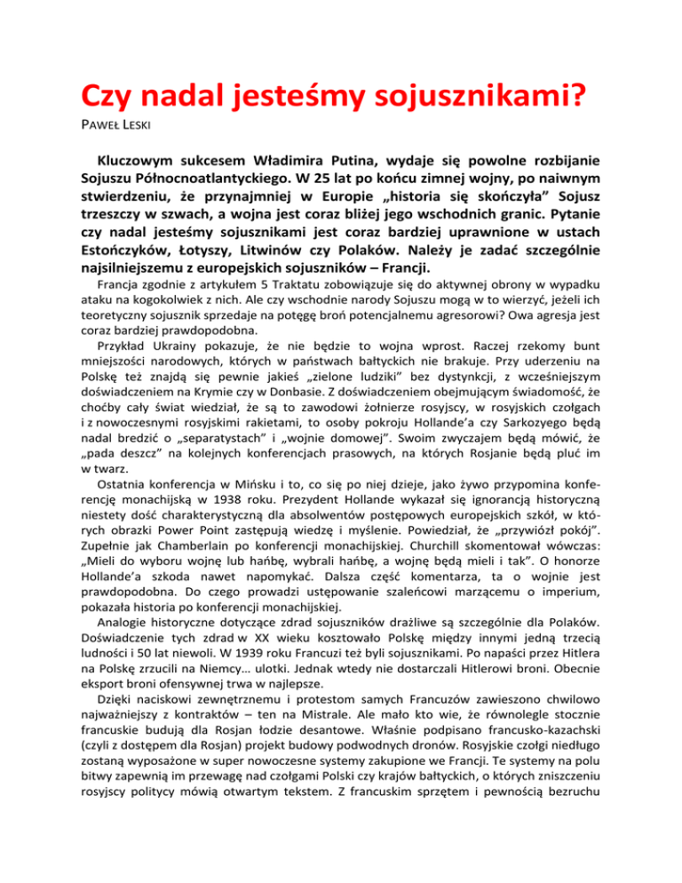 Czy nadal jesteśmy sojusznikami? PAWEŁ LESKI Kluczowym sukcesem Władimira Putina, wydaje się powolne rozbijanie Sojuszu Północnoatlantyckiego. W 25 lat po końcu zimnej wojny, po naiwnym stwierdzeniu, że przynajmniej w Europie „historia się skończyła” Sojusz trzeszczy w szwach, a wojna jest coraz bliżej jego wschodnich granic. Pytanie czy nadal jesteśmy sojusznikami jest coraz bardziej uprawnione w ustach Estończyków, Łotyszy, Litwinów czy Polaków. Należy je zadać szczególnie najsilniejszemu z europejskich sojuszników – Francji. Francja zgodnie z artykułem 5 Traktatu zobowiązuje się do aktywnej obrony w wypadku ataku na kogokolwiek z nich. Ale czy wschodnie narody Sojuszu mogą w to wierzyć, jeżeli ich teoretyczny sojusznik sprzedaje na potęgę broń potencjalnemu agresorowi? Owa agresja jest coraz bardziej prawdopodobna. Przykład Ukrainy pokazuje, że nie będzie to wojna wprost. Raczej rzekomy bunt mniejszości narodowych, których w państwach bałtyckich nie brakuje. Przy uderzeniu na Polskę też znajdą się pewnie jakieś „zielone ludziki” bez dystynkcji, z wcześniejszym doświadczeniem na Krymie czy w Donbasie. Z doświadczeniem obejmującym świadomość, że choćby cały świat wiedział, że są to zawodowi żołnierze rosyjscy, w rosyjskich czołgach i z nowoczesnymi rosyjskimi rakietami, to osoby pokroju Hollande’a czy Sarkozyego będą nadal bredzić o „separatystach” i „wojnie domowej”. Swoim zwyczajem będą mówić, że „pada deszcz” na kolejnych konferencjach prasowych, na których Rosjanie będą pluć im w twarz. Ostatnia konferencja w Mińsku i to, co się po niej dzieje, jako żywo przypomina konferencję monachijską w 1938 roku. Prezydent Hollande wykazał się ignorancją historyczną niestety dość charakterystyczną dla absolwentów postępowych europejskich szkół, w których obrazki Power Point zastępują wiedzę i myślenie. Powiedział, że „przywiózł pokój”. Zupełnie jak Chamberlain po konferencji monachijskiej. Churchill skomentował wówczas: „Mieli do wyboru wojnę lub hańbę, wybrali hańbę, a wojnę będą mieli i tak”. O honorze Hollande’a szkoda nawet napomykać. Dalsza część komentarza, ta o wojnie jest prawdopodobna. Do czego prowadzi ustępowanie szaleńcowi marzącemu o imperium, pokazała historia po konferencji monachijskiej. Analogie historyczne dotyczące zdrad sojuszników drażliwe są szczególnie dla Polaków. Doświadczenie tych zdrad w XX wieku kosztowało Polskę między innymi jedną trzecią ludności i 50 lat niewoli. W 1939 roku Francuzi też byli sojusznikami. Po napaści przez Hitlera na Polskę zrzucili na Niemcy… ulotki. Jednak wtedy nie dostarczali Hitlerowi broni. Obecnie eksport broni ofensywnej trwa w najlepsze. Dzięki naciskowi zewnętrznemu i protestom samych Francuzów zawieszono chwilowo najważniejszy z kontraktów – ten na Mistrale. Ale mało kto wie, że równolegle stocznie francuskie budują dla Rosjan łodzie desantowe. Właśnie podpisano francusko-kazachski (czyli z dostępem dla Rosjan) projekt budowy podwodnych dronów. Rosyjskie czołgi niedługo zostaną wyposażone w super nowoczesne systemy zakupione we Francji. Te systemy na polu bitwy zapewnią im przewagę nad czołgami Polski czy krajów bałtyckich, o których zniszczeniu rosyjscy politycy mówią otwartym tekstem. Z francuskim sprzętem i pewnością bezruchu sojuszników niedawne deklaracje Rosjan, że „dojdą do Warszawy w jeden dzień”, brzmią szczególnie złowrogo. Nie widzę, żeby w krajach zachodnich uzbrajanie Rosji w broń ofensywną powodowało obiekcje polityków – choćby takie jak kilka lat temu, kiedy Polska negocjowała amerykańską tarczę antyrakietową – broń defensywną niezagrażającą nikomu, kto nie chce jej zaatakować. Jednocześnie Francja – główny producent broni, z której być może w niedalekiej przyszłości ktoś zabije mnie i tysiące moich rodaków, stara się, jak gdyby nigdy nic, o obronny „kontrakt stulecia” w Polsce. Do zarobienia 10 miliardów euro. Przy tradycyjnym frajerstwie Polaków doprawionym umiejętnym lobbingiem i łapówkami Francja może wygrać z głównym konkurentem z Ameryki, mimo równoległego dozbrajania potencjalnego agresora. W tej sytuacji uprawnione wydaje się pytanie – czy kody źródłowe francuskiego sprzętu sprzedanego Polsce przekazane zostaną również Putinowi? Dlaczego nie? Przecież biznes jest biznes. Nikt nie chce stracić możliwości zarobku… nie mówiąc o „umieraniu za Gdańsk”… pawelleski.blog.pl
