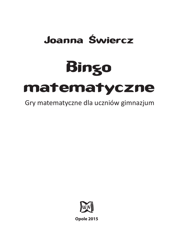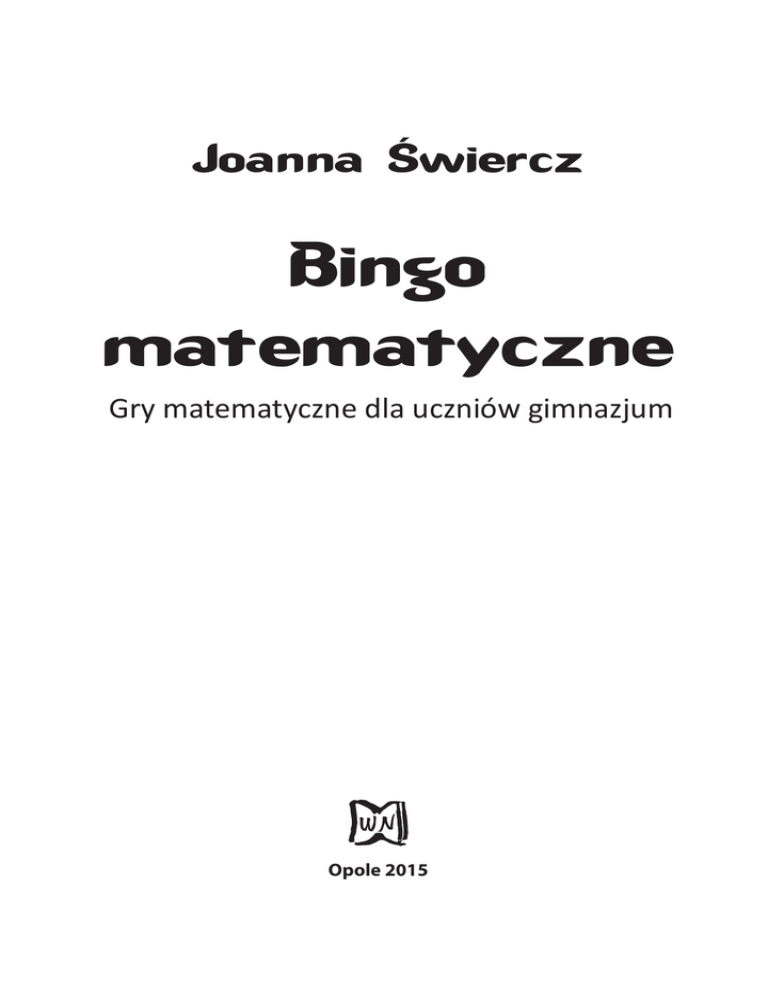 Joanna Świercz Bingo matematyczne Gry matematyczne dla uczniów gimnazjum Opole 2015 © Copyright by Wydawnictwo Nowik Sp.j. 2015 Wydawnictwo Nowik Sp.j. 45-061 Opole, ul. Katowicka 39/104 Wydanie pierwsze, Opole 2015 ISBN: 978-83-62687-65-7 OPRACOWANIE REDAKCYJNE: Wydawnictwo SKŁAD I ŁAMANIE: Wydawnictwo GRAFIKA NA OKŁADCE: Beata Motyka Wszelkie prawa zastrzeżone. Rozpowszechnianie bez zgody Wydawcy całości publikacji lub jej fragmentów w jakiejkolwiek postaci jest zabronione. Kopiowanie metodą kserograficzną, fotograficzną, umieszczanie na nośnikach magnetycznych, optycznych i innych narusza prawa autorskie niniejszej publikacji. Kserowanie zabija książki! Szanowny Czytelniku, jeżeli chcesz wyrazić swoją opinię na temat tej publikacji, prosimy o kontakt mailowy [email protected] lub wypełnienie formularza na naszej stronie www.nowik.com.pl Wydrukowane w Polsce Szczegółowe informacje o naszych publikacjach na www.nowik.com.pl ___________________________________________________________ Dystrybucja: Wydawnictwo Nowik Sp.j. Biuro Handlowe: 45-061 Opole, ul. Katowicka 39/104 Tel./fax 77 454 36 04 http://www.nowik.com.pl e-mail: [email protected] Spis treści Wstęp. . . . . . . . . . . . . . . . . . . . . . . . . . . . . . . . . . . . . . . . . . . . . . . . . . . . . . . . . . . . . . . . . . . . . . . . . . . . . . . . . . . . . 5 Instrukcja. . . . . . . . . . . . . . . . . . . . . . . . . . . . . . . . . . . . . . . . . . . . . . . . . . . . . . . . . . . . . . . . . . . . . . . . . . . . . . . . . 7 I. Wyrażenia algebraiczne 1. 2. 3. 4. 5. 6. Obliczanie wartości liczbowej wyrażeń algebraicznych. . . . . . . . . . . . . . . . . . . . . . . . . . . . . . . . . . . . . . . . . 9 Redukcja wyrazów podobnych w sumie algebraicznej. . . . . . . . . . . . . . . . . . . . . . . . . . . . . . . . . . . . . . . . 10 Dodawanie i odejmowanie sum algebraicznych. . . . . . . . . . . . . . . . . . . . . . . . . . . . . . . . . . . . . . . . . . . . . . . 11 Wyłączanie wspólnego czynnika z wyrazów sumy algebraicznej przed nawias. . . . . . . . . . . . . . . . 12 Wyznaczanie wskazanej wielkość z podanych wzorów, w tym geometrycznych i fizycznych. . . 14 Mnożenie jednomianów, sum algebraicznych przez jednomian, sum algebraicznych. . . . . . . . . 16 II. Równania 1. 2. 3. 4. 5. Rozwiązywanie równań stopnia pierwszego z jedną niewiadomą. . . . . . . . . . . . . . . . . . . . . . . . . . . . . 17 Rozwiązywanie układów równań stopnia pierwszego z dwiema niewiadomymi. . . . . . . . . . . . . . 18 Rozwiazywanie za pomocą równania zadań osadzonych w kontekście praktycznym. . . . . . . . . . 19 Rozwiazywanie za pomocą układów równań zadań osadzonych w kontekście praktycznym. . 20 Proporocjonalność. . . . . . . . . . . . . . . . . . . . . . . . . . . . . . . . . . . . . . . . . . . . . . . . . . . . . . . . . . . . . . . . . . . . . . . . . . . 22 III. Potęgi 1. 2. 3. 4. 5. Działania na potęgach. . . . . . . . . . . . . . . . . . . . . . . . . . . . . . . . . . . . . . . . . . . . . . . . . . . . . . . . . . . . . . . . . . . . . . . . 23 Obliczanie potęg liczb wymiernych o wykładnikach naturalnych. . . . . . . . . . . . . . . . . . . . . . . . . . . . . . 24 Obliczanie potęg liczb wymiernych o wykładnikach całkowitych. . . . . . . . . . . . . . . . . . . . . . . . . . . . . . 26 Zapisywanie w postaci jednej potęgi liczby 2, 3 lub 5. . . . . . . . . . . . . . . . . . . . . . . . . . . . . . . . . . . . . . . . . 28 Zapisywanie liczb w notacji wykładniczej. . . . . . . . . . . . . . . . . . . . . . . . . . . . . . . . . . . . . . . . . . . . . . . . . . . . . 28 IV. Pierwiastki 1. 2. 3. 4. Wyłączanie czynnika przed znak pierwiastka oraz włączanie czynnika pod znak pierwiastka . . . . . . . . 30 Mnożenie i dzielenie pierwiastków drugiego i trzeciego stopnia. . . . . . . . . . . . . . . . . . . . . . . . . . . . . . . . 32 Działania na pierwiastkach. . . . . . . . . . . . . . . . . . . . . . . . . . . . . . . . . . . . . . . . . . . . . . . . . . . . . . . . . . . . . . . . . . . . 34 Obliczanie wartości pierwiastków drugiego i trzeciego stopnia z liczb, które są odpowiednio kwadratami lub sześcianami liczb całkowitych. . . . . . . . . . . . . . . . . . . . . . . . . . . . . . . . . . . . . . . . . . . . . . . . 36 V. Procenty 1. 2. 3. 4. Obliczanie procentu danej liczby. . . . . . . . . . . . . . . . . . . . . . . . . . . . . . . . . . . . . . . . . . . . . . . . . . . . . . . . . . . . . . 37 Przedstawianie część pewnej wielkości, jako procent lub promil tej wielkości i odwrotnie. . . . . 38 Obliczenia procentowe, rozwiązywanie problemów osadzonych w kontekście praktycznym. . 40 Obliczanie liczby na podstawie danego jej procentu. . . . . . . . . . . . . . . . . . . . . . . . . . . . . . . . . . . . . . . . . . 41 VI.Liczby wymierne dodatnie 1. Liczby w systemie rzymskim w zakresie do 3000. . . . . . . . . . . . . . . . . . . . . . . . . . . . . . . . . . . . . . . . . . . . . . 42 2. Zaokrąglanie rozwinięć dziesiętnych liczb. . . . . . . . . . . . . . . . . . . . . . . . . . . . . . . . . . . . . . . . . . . . . . . . . . . . . 44 3. Dodawanie i odejmowanie ułamków zwykłych. . . . . . . . . . . . . . . . . . . . . . . . . . . . . . . . . . . . . . . . . . . . . . . 46 4. 5. 6. 7. 8. Mnożenie i dzielenie ułamków zwykłych. . . . . . . . . . . . . . . . . . . . . . . . . . . . . . . . . . . . . . . . . . . . . . . . . . . . . . 48 Obliczanie wartości nieskomplikowanych wyrażeń arytmetycznych zawierających ułamki zwykłe. . . 50 Zamiana ułamków zwykłych na ułamki dziesiętne i odwrotnie. . . . . . . . . . . . . . . . . . . . . . . . . . . . . . . . 52 Dodawanie, odejmowanie, mnożenie i dzielenie ułamków dziesiętnych skończonych. . . . . . . . . 54 Obliczanie wartości nieskomplikowanych wyrażeń arytmetycznych zawierających ułamki zwykłe i dziesiętne. . . . . . . . . . . . . . . . . . . . . . . . . . .