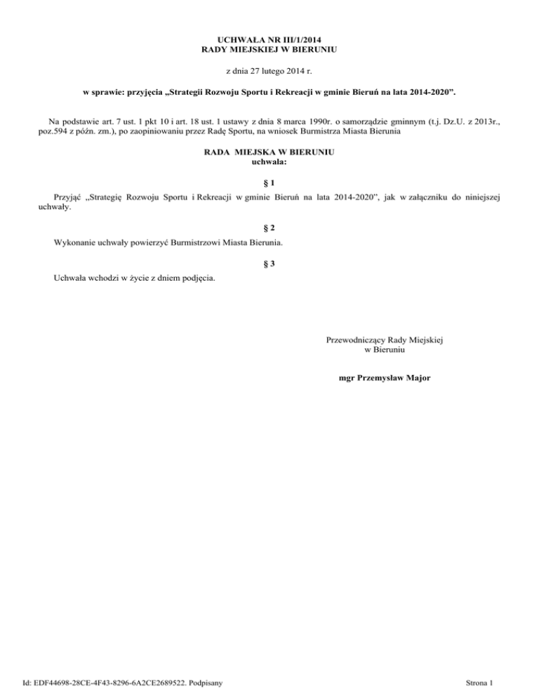 UCHWAŁA NR III/1/2014 RADY MIEJSKIEJ W BIERUNIU z dnia 27 lutego 2014 r. w sprawie: przyjęcia „Strategii Rozwoju Sportu i Rekreacji w gminie Bieruń na lata 2014-2020”. Na podstawie art. 7 ust. 1 pkt 10 i art. 18 ust. 1 ustawy z dnia 8 marca 1990r. o samorządzie gminnym (t.j. Dz.U. z 2013r., poz.594 z późn. zm.), po zaopiniowaniu przez Radę Sportu, na wniosek Burmistrza Miasta Bierunia RADA MIEJSKA W BIERUNIU uchwala: §1 Przyjąć „Strategię Rozwoju Sportu i Rekreacji w gminie Bieruń na lata 2014-2020”, jak w załączniku do niniejszej uchwały. §2 Wykonanie uchwały powierzyć Burmistrzowi Miasta Bierunia. §3 Uchwała wchodzi w życie z dniem podjęcia. Przewodniczący Rady Miejskiej w Bieruniu mgr Przemysław Major Id: EDF44698-28CE-4F43-8296-6A2CE2689522. Podpisany Strona 1 Załącznik do Uchwały Nr III/1/2014 Rady Miejskiej w Bieruniu z dnia 27.02.2014r. STRATEGIA ROZWOJU SPORTU I REKREACJI W GMINIE BIERUŃ NA LATA 2014-2020 Bieruń, 2014 rok 1 Id: EDF44698-28CE-4F43-8296-6A2CE2689522. Podpisany Strona 1 SPIS TREŚCI Dział I: Wprowadzenie - Wprowadzenie i podstawowe definicje - Podstawy prawne funkcjonowania sportu i rekreacji - Rola i zadania stawiane przed samorządem oraz znaczenie sportu i rekreacji - Powiązanie strategii rozwoju sportu i rekreacji w Bieruniu z dokumentami strategicznymi - Metodologia dokumentu Dział II: Diagnoza stanu obecnego sportu i rekreacji w gminie Bieruń 1.Organizacja sportu i rekreacji w Bieruniu 1.1. Bieruński Ośrodek Sportu i Rekreacji oraz imprezy sportowo rekreacyjne 1.2. Kluby sportowe, uks i stowarzyszenia 1.3. Wychowanie fizyczne i sport szkolny 1.4. Sport i rekreacja osób niepełnosprawnych 2. Baza sportowo-rekreacyjna w Bieruniu 2.1. Obiekty zarządzane przez BOSiR 2.2. Obiekty zarządzane przez gminne jednostki oświatowe 2.3. Obiekty zarządzane przez powiat bieruńsko-lędziński 2.4. Gminne tereny rekreacyjne i ścieżki rowerowe 2.5 Propozycje inwestycji i modernizacji obiektów 3. Finansowanie sportu i rekreacji w gminie Dział III: Analiza SWOT - Mocne i słabe strony oraz szanse i zagrożenia Dział IV: Strategia rozwoju sportu i rekreacji w Bieruniu - Wizja - Cele strategiczne i kierunki działań - Karty realizacji zadań - Analiza realizacji strategii rozwoju sportu i rekreacji w Bieruniu - Wykaz dokumentów podlegających zmianie w związku z realizacją strategii Dział V: Realizacja, monitowanie i ewaluacja strategii rozwoju sportu i rekreacji w Bieruniu 2 Id: EDF44698-28CE-4F43-8296-6A2CE2689522. Podpisany Strona 2 DZIAŁ I - Wprowadzenie Wprowadzenie i podstawowe definicje Celem opracowania dokumentu jest przedstawienie aktualnego stanu sportu i rekreacji w Bieruniu, analiza zebranych informacji oraz wskazanie kierunków działania miasta i organizacji pozarządowych na lata 2014-2020 w oparciu o zidentyfikowane mocne i słabe strony, a także istniejące trendy rozwojowe sportu w Polsce. Wprowadzenie strategii do realizacji ma na celu: maksymalną popularyzację sportu i rekreacji wśród mieszkańców miasta, promocję świadomości na temat korzyści płynących z aktywności fizycznej, osiągnięcie wysokiego poziomu kultury fizycznej, opracowanie polityki w zakresie szkolenia dzieci i młodzieży uzdolnionych sportowo oraz sportu wyczynowego osiągnięcie wyższej pozycji w rywalizacji sportowej, określenie kierunków budowy i modernizacji obiektów sportowo-rekreacyjnych, lepsze zaspokajanie potrzeb mieszkańców i przyjezdnych, zwiększenie możliwości uprawiania sportu i rekreacji przez osoby niepełnosprawne, promocję miasta. Definicje: Sport - wszelkie formy aktywności fizycznej, które przez uczestnictwo doraźne lub zorganizowane wpływają na wypracowanie lub poprawienie kondycji fizycznej i psychicznej, rozwój stosunków społecznych lub osiągnięcie wyników sportowych na wszelkich poziomach. Rekreacja - aktywny wypoczynek, forma aktywności umysłowej lub fizycznej podejmowana poza obowiązkami zawodowymi, społecznymi, domowymi i nauką. Stosowana w celu odpoczynku i rozrywki. Sport wyczynowy - forma działalności człowieka, podejmowana dobrowolnie w drodze rywalizacji dla uzyskania maksymalnych wyników sportowych. Sport szkolny - uzupełnienie zajęć wychowania fizycznego. Zajęcia sportowe mają wspierać rozwój fizyczny i poszerzać potencjał zdrowotny uczniów, przygotowywać ich do dokonywania w życiu wyborów korzystnych dla zdrowia. Realizowane są w grupach zainteresowań, według wyboru uczniów. Sport profesjonalny - rodzaj sportu wyczynowego uprawianego w celach zarobkowych. Sport profesjonalny nie jest zadaniem gminy. Polski związek sportowy - utworzony w celu organizowania i prowadzenia współzawodnictwa w danym sporcie. Podstawy prawne funkcjonowania sportu i rekreacji Władze publiczne zobowiązane są do popierania rozwoju kultury fizycznej będącej częścią kultury narodowej. Podstawy prawne dotyczące funkcjonowania sportu i rekreacji uregulowane są n/w ustawami i uchwałami samorządowymi: 1. Konstytucja Rzeczpospolitej Polskiej w art. 68 mówi: Władze publiczne popierają rozwój kultury fizycznej, zwłaszcza wśród dzieci i młodzieży. 2. Ustawa z dnia 8 marca 1990r. o samorządzie gminnym (t.j. Dz.U. z 2013r.,poz.594 z późn. zm.) jako podstawowy akt określający zadania jednostki samorządu terytorialnego w art. 7 w zadaniach własnych obejmujących zaspokajanie zbiorowych potrzeb wspólnoty wskazuje sprawy kultury fizycznej i turystyki, w tym terenów rekreacyjnych i urządzeń sportowych. 3 Id: EDF44698-28CE-4F43-8296-6A2CE2689522. Podpisany Strona 3 3. Ustawa o działalności pożytku publicznego i o wolontariacie z dnia 24 kwietnia 2003r. (t.j. Dz.U. z 2010r., Nr 234, poz.1536 z późn. zm.) w art. 4 określa sfery i zasady współpracy jednostek samorządowych z organizacjami pozarządowymi w realizacji m.in. następujących zadań publicznych: a) upowszechnianie kultury fizycznej i sportu, b) ochrony i promocji zdrowia, c) działalno