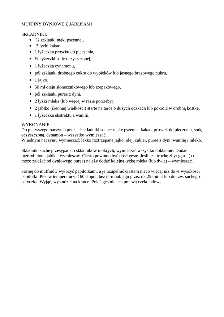 MUFFINY DYNIOWE Z JABŁKAMI SKŁADNIKI: ¾ szklanki mąki pszennej, 3 łyżki kakao, 1 łyżeczka proszku do pieczenia, ½ łyżeczki sody oczyszczonej, 1 łyżeczka cynamonu, pół szklanki drobnego cukru do wypieków lub jasnego brązowego cukru, 1 jajko, 50 ml oleju słonecznikowego lub rzepakowego, pół szklanki puree z dyni, 2 łyżki mleka (lub więcej w razie potrzeby), 2 jabłko (średniej wielkości) starte na tarce o dużych oczkach lub pokroić w drobną kostkę, 1 łyżeczka ekstraktu z wanilii, WYKONANIE: Do pierwszego naczynia przesiać składniki suche: mąkę pszenną, kakao, proszek do pieczenia, sodę oczyszczoną, cynamon – wszystko wymieszać. W jednym naczyniu wymieszać: lekko roztrzepane jajko, olej, cukier, puree z dyni, wanilię i mleko. Składniki suche przesypać do składników mokrych, wymieszać wszystko dokładnie. Dodać rozdrobnione jabłka, wymieszać. Ciasto powinno być dość gęste. Jeśli jest trochę zbyt gęste ( co może zależeć od dyniowego puree) należy dodać kolejną łyżkę mleka (lub dwie) – wymieszać. Formę do muffinów wyłożyć papilotkami, a je uzupełnić ciastem nieco więcej niż do ¾ wysokości papilotki. Piec w temperaturze 160 stopni, bez termoobiegu przez ok.25 minut lub do tzw. suchego patyczka. Wyjąć, wystudzić na kratce. Polać gęstniejącą polewą czekoladową.