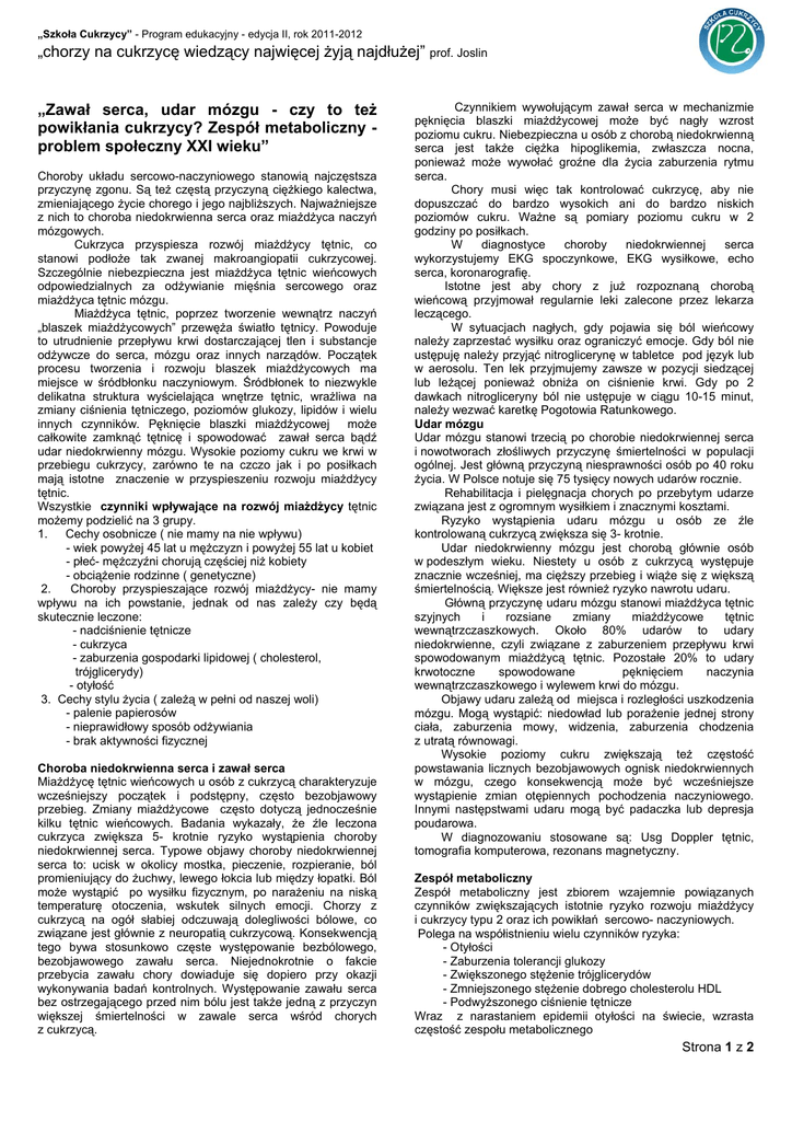 „Szkoła Cukrzycy” - Program edukacyjny - edycja II, rok 2011-2012 „chorzy na cukrzycę wiedzący najwięcej żyją najdłużej” prof. Joslin „Zawał serca, udar mózgu - czy to też powikłania cukrzycy? Zespół metaboliczny problem społeczny XXI wieku” Choroby układu sercowo-naczyniowego stanowią najczęstsza przyczynę zgonu. Są też częstą przyczyną ciężkiego kalectwa, zmieniającego życie chorego i jego najbliższych. Najważniejsze z nich to choroba niedokrwienna serca oraz miażdżyca naczyń mózgowych. Cukrzyca przyspiesza rozwój miażdżycy tętnic, co stanowi podłoże tak zwanej makroangiopatii cukrzycowej. Szczególnie niebezpieczna jest miażdżyca tętnic wieńcowych odpowiedzialnych za odżywianie mięśnia sercowego oraz miażdżyca tętnic mózgu. Miażdżyca tętnic, poprzez tworzenie wewnątrz naczyń „blaszek miażdżycowych” przewęża światło tętnicy. Powoduje to utrudnienie przepływu krwi dostarczającej tlen i substancje odżywcze do serca, mózgu oraz innych narządów. Początek procesu tworzenia i rozwoju blaszek miażdżycowych ma miejsce w śródbłonku naczyniowym. Śródbłonek to niezwykle delikatna struktura wyścielająca wnętrze tętnic, wrażliwa na zmiany ciśnienia tętniczego, poziomów glukozy, lipidów i wielu innych czynników. Pęknięcie blaszki miażdżycowej może całkowite zamknąć tętnicę i spowodować zawał serca bądź udar niedokrwienny mózgu. Wysokie poziomy cukru we krwi w przebiegu cukrzycy, zarówno te na czczo jak i po posiłkach mają istotne znaczenie w przyspieszeniu rozwoju miażdżycy tętnic. Wszystkie czynniki wpływające na rozwój miażdżycy tętnic możemy podzielić na 3 grupy. 1. Cechy osobnicze ( nie mamy na nie wpływu) - wiek powyżej 45 lat u mężczyzn i powyżej 55 lat u kobiet - płeć- mężczyźni chorują częściej niż kobiety - obciążenie rodzinne ( genetyczne) 2. Choroby przyspieszające rozwój miażdżycy- nie mamy wpływu na ich powstanie, jednak od nas zależy czy będą skutecznie leczone: - nadciśnienie tętnicze - cukrzyca - zaburzenia gospodarki lipidowej ( cholesterol, trójglicerydy) - otyłość 3. Cechy stylu życia ( zależą w pełni od naszej woli) - palenie papierosów - nieprawidłowy sposób odżywiania - brak aktywności fizycznej Choroba niedokrwienna serca i zawał serca Miażdżycę tętnic wieńcowych u osób z cukrzycą charakteryzuje wcześniejszy początek i podstępny, często bezobjawowy przebieg. Zmiany miażdżycowe często dotyczą jednocześnie kilku tętnic wieńcowych. Badania wykazały, że źle leczona cukrzyca zwiększa 5- krotnie ryzyko wystąpienia choroby niedokrwiennej serca. Typowe objawy choroby niedokrwiennej serca to: ucisk w okolicy mostka, pieczenie, rozpieranie, ból promieniujący do żuchwy, lewego łokcia lub między łopatki. Ból może wystąpić po wysiłku fizycznym, po narażeniu na niską temperaturę otoczenia, wskutek silnych emocji. Chorzy z cukrzycą na ogół słabiej odczuwają dolegliwości bólowe, co związane jest głównie z neuropatią cukrzycową. Konsekwencją tego bywa stosunkowo częste występowanie bezbólowego, bezobjawowego zawału serca. Niejednokrotnie o fakcie przebycia zawału chory dowiaduje się dopiero przy okazji wykonywania badań kontrolnych. Występowanie zawału serca bez ostrzegającego przed nim bólu jest także jedną z przyczyn większej śmiertelności w zawale serca wśród chorych z cukrzycą. Czynnikiem wywołującym zawał serca w mechanizmie pęknięcia blaszki miażdżycowej może być nagły wzrost poziomu cukru. Niebezpieczna u osób z chorobą niedokrwienną serca jest także ciężka hipoglikemia, zwłaszcza nocna, ponieważ może wywołać groźne dla życia zaburzenia rytmu serca. Chory musi więc tak kontrolować cukrzycę, aby nie dopuszczać do bardzo wysokich ani do bardzo niskich poziomów cukru. Ważne są pomiary poziomu cukru w 2 godziny po posiłkach. W diagnostyce choroby niedokrwiennej serca wykorzystujemy EKG spoczynkowe, EKG wysiłkowe, echo serca, koronarografię. Istotne jest aby chory z już rozpoznaną chorobą wieńcową przyjmował regularnie leki zalecone przez lekarza leczącego. W sytuacjach nagłych, gdy pojawia się ból wieńcowy należy zaprzestać wysiłku oraz ograniczyć emocje. Gdy ból nie ustępuję należy przyjąć nitroglicerynę w tabletce pod język lub w aerosolu. Ten lek przyjmujemy zawsze w pozycji siedzącej lub leżącej ponieważ obniża on ciśnienie krwi. Gdy po 2 dawkach nitrogliceryny ból nie ustępuje w ciągu 10-15 minut, należy wezwać karetkę Pogotowia Ratunkowego. Udar mózgu Udar mózgu stanowi trzecią po chorobie niedokrwiennej serca i nowotworach złośliwych przyczynę śmiertelności w populacji ogólnej. Jest główną przyczyną niesprawności osób po 40 roku życia. W Polsce notuje się 75 tysięcy nowych udarów rocznie. Rehabilitacja i pielęgnacja chorych po przebytym udarze związana jest z ogromnym wysiłkiem i znacznymi kosztami. Ryzyko wystąpienia udaru mózgu u osób ze źle kontrolowaną cukrzycą zwiększa się 3- krotnie. Udar niedokrwienny mózgu jest chorobą głównie osób w podeszłym wieku. Niestety u osób z cukrzycą występuje znacznie wcześniej, ma cięższy przebieg i wiąże się z większą śmiertelnością. Większe jest również ryzyko nawrotu udaru. Główną przyczynę udaru mózgu stanowi miażdżyca tętnic szyjnych i rozsiane zmiany miażdżycowe tętnic wewnątrzczaszkowych. Około 80% udarów to udary niedokrwienne, czyli związane z zaburzeniem przepływu krwi spowodowanym miażdżycą tętnic. Pozostałe 20% to udary krwotoczne spowodowane pęknięciem naczynia wewnątrzczaszkowego i wylewem krwi do mózgu. Objawy udaru zależą od miejsca i rozległości uszkodzenia mózgu. Mogą wystąpić: niedowład lub porażenie jednej strony ciała, zaburzenia mowy, widzenia, zaburzenia chodzenia z utratą równowagi. Wysokie poziomy cukru zwiększają też często