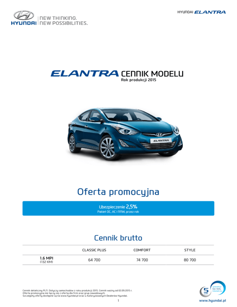 HYUNDAI CENNIK MODELU Rok produkcji 2015 Oferta promocyjna Ubezpieczenie 2,5% Pakiet OC, AC i NNW, przez rok Cennik brutto 1.6 MPI (132 KM) CLASSIC PLUS COMFORT STYLE 64 700 74 700 80 700 Cennik detaliczny PLN. Dotyczy samochodów z roku produkcji 2015. Cennik ważny od 02.09.2015 r. Oferta promocyjna nie łączy się z ofertą dla firm oraz grup zawodowych. Szczegóły oferty dostępne są na www.hyundai.pl oraz u Autoryzowanych Dealerów Hyundai. 1 www.hyundai.pl HYUNDAI BEZPIECZEŃSTWO CLASSIC PLUS COMFORT Przednie poduszki bezpieczeństwa + + STYLE + Boczne poduszki bezpieczeństwa - przód + + + Kurtynowe poduszki bezpieczeństwa + + + Mocowanie fotelików dziecięcych + + + 4/2 Ilość tarcz hamulcowych / wentylowane 4/2 4/2 ESC / VSM - systemy kontroli trakcji i stabilizacji pojazdu + + + ABS z asystentem hamowania + + + Blokada drzwi tylnych + + + Immobilizer + + + Sygnalizacja braku zapięcia pasów bezpieczeństwa kierowcy + + + + + + + + + + + KOMFORT Elektryczne wspomaganie kierownicy System Flex Steer (trzy tryby pracy wspomagania kierownicy) + Przednie szyby elektryczne Tylne szyby elektryczne Szyby elektr. z czujnikiem zabezpieczającym przed przyciśnięciem po stronie kierowcy Klimatyzacja manualna + + Dwustrefowa klimatyzacja elektroniczna z jonizatorem i systemem odszraniania Kierownica regulowana na wysokość + + + Kierownica regulowana w dwóch płaszczyznach + + Skórzana kierownica i gałka skrzyni biegów + + Podgrzewane koło kierownicy + Wyświetlacz kamery cofania + Czujnik parkowania z tyłu + Lampki do czytania z przodu ze schowkiem na okulary + + + System Bluetooth + + Podświetlone lusterko do makijażu + + Czujnik deszczu + + Tempomat + Pilot centralnego zamka +* Składany kluczyk z pilotem i alarmem Wygłuszenie maski Automatyczna skrzynia biegów + + + + + 4 000 PLN 4 000 PLN 4 000 PLN 195/65 R15 205/55 R16 205/55 R16 + + ZEWNĘTRZNE Rozmiar opon i kół Aluminiowe obręcze kół Dojazdowe koło zapasowe + Pełnowymiarowe aluminiowe koło zapasowe Przednie światła przeciwmgielne + + + + + Światła automatyczne + + Światła do jazdy dziennej + + Światła przednie typu projekcyjnego Elektryczne i podgrzewane lusterka boczne w kolorze nadwozia + + + + + WYPOSAŻENIE Lusterka ze zintegrowanymi kierunkowskazami + Elektrycznie składane lusterka + Klamki zewnętrzne w kolorze nadwozia + + + Listwa chromowana pod bocznymi szybami + + Ozdobna listwa progowa + + Wycieraczka wykonana w technologii płaskiego pióra Lakier metalik/perłowy + + + 2 000 PLN 2 000 PLN 2 000 PLN WEWNĘTRZNE Materiałowa tapicerka siedzeń + Materiałowa tapicerka na drzwiach + + + + Elektrycznie podgrzewane siedzenia przednie / tylne + Elektrycznie sterowany fotel kierowcy + Czujnik ciśnienia w oponach (TPMS) + + + Regulacja wysokości siedzenia kierowcy + + + Kieszenie w opaciach siedzeń przednich + + + Dzielone oparcie tylnego siedzenia 60:40 + + + Podłokietnik przedni i tylny + + + Komputer pokładowy + + + Regulacja podświetlenia tablicy rozdzielczej + + + Uchwyty na kubki z przodu i z tyłu + Zamykany i chłodzony schowek w konsoli centralnej + + + + Siatka zabezpieczająca bagaż + AUDIO Radio + CD + MP3 + + + + + 4 głośniki + 2 tweetery 4 głośniki + 2 tweetery 4 głośniki +2 tweetery + + + Radio + CD + MP3 z wyświetlaczem 4,3" LCD + Zdalnie sterowanie audio na kierownicy Liczba głośników Podłączenie AUX, USB * Element wyposażenia montowany lokalnie i objęty osobną gwarancją. 2 www.hyundai.pl HYUNDAI PRZYSZŁOŚĆ JEST PEWNA W nowym Hyundaiu Elantra nie ma miejsca tylko na jedno: niepewność. Poprzez godną zaufania obsługę gwarancyjną dajemy kierowcom pełen spokój ducha. 5 lat gwarancji bez limitu kilometrów wyraża nasze zaangażowanie w oferowanie najwyższej jakości i świetnej obsługi. Dzięki temu będziesz cieszyć się jazdą przez długie lata. 5 lat gwarancji bez limitu kilometrów* wyraża nasze zaangażowanie w oferowanie najwyższej jakości i świetnej obsługi. Dzięki temu będziesz cieszyć się jazdą przez długie lata. Gwarancja obejmuje również: 5 lat Assistance | Pięcioletnia usługa pomocy drogowej obejmuje próbę naprawienia pojazdu na miejscu. W zależności od sytuacji zapewniamy: holowanie do najbliższego dealera Hyundaia, pojazd zastępczy, transport pasażerów lub zakwaterowanie. Szczegółowe warunki u dealerów. 5 lat bezpłatnej kontroli stanu technicznego | Raz w roku użytkownik ma prawo do wykonania w ASO bezpłatnego sprawdzenia pięciu punktów kontrolnych samochodu. Usługa jest wykonywana poza przeglądami wynikającymi z harmonogramu przeglądów okresowych. Kolory nadwozia HYUNDAI YAC CREAMY WHITE (Bez dopłaty) P3W MUSHROOMS (Perłowy) N3S SLEEK SILVER (Metalik) S3N SATIN AMBER (Metalik) XN5 COFFEE BEAN (Perłowy) NKA PHANTOM BLACK (Perłowy) ZU3 DAZZLING BLUE (Perłowy) TU6 TROPICAL SEA BLUE (Perłowy) SU9 STONE BLUE (Metalik) YR7 BRILLIANT RED (Perłowy) N5S HYPER SILVER (Metalik) * Powyższe informację nie określają wszystkich warunków gwarancji. W przypadku, gdy zakup samochodu nastąpił w celu prowadzenia jednej z następujących działalności gospodarczych: taksówka, wypożyczalnia, płatny przewóz osób, gwarancja mechaniczna wynosi 3 lata (36 miesięcy) z limitem 100 000 km kilometrów w zależności, co wystąpi wcześniej, podobne ograniczenia dotyczą innych elementów gwarancji. Szczegóły u Dealerów. Podane dane mają charakter informacyjny. Szczegółowe warunki gwarancji znajdują się w Książce Gwarancyjnej. 3 www.hyundai.pl HYUNDAI SILNIK Typ silnika Gamma 1.6 D- CVVT MPI Skrzynia biegów 6MT / 6AT Rodzaj paliwa benzyna bezołowiowa 95 Norma spalin EURO V Pojemność silnika (cm³) 1591 Średnica x skok tłoka 77,0 x 85,44 Układ paliwowy wielopunktowy Regulacja zaworów mechaniczna Liczba cylindrów/ układ cylindrów 4/rzędowy Stopień sprężania 10,5:1 Moc maksymalna (KM/przy obr./min) 132/6300 Maksymalny moment obrotowy (Nm przy obr./min) 158/4850 Pojemność zbior