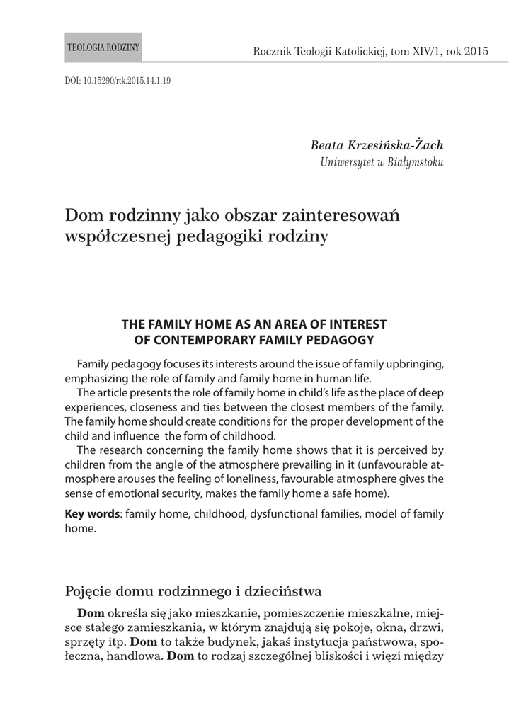 TEOLOGIA RODZINY Rocznik Teologii Katolickiej, tom XIV/1, rok 2015 DOI: 10.15290/rtk.2015.14.1.19 Beata Krzesińska-Żach Uniwersytet w Białymstoku Dom rodzinny jako obszar zainteresowań współczesnej pedagogiki rodziny THE FAMILY HOME AS AN AREA OF INTEREST OF CONTEMPORARY FAMILY PEDAGOGY Family pedagogy focuses its interests around the issue of family upbringing, emphasizing the role of family and family home in human life. The article presents the role of family home in child’s life as the place of deep experiences, closeness and ties between the closest members of the family. The family home should create conditions for the proper development of the child and influence the form of childhood. The research concerning the family home shows that it is perceived by children from the angle of the atmosphere prevailing in it (unfavourable atmosphere arouses the feeling of loneliness, favourable atmosphere gives the sense of emotional security, makes the family home a safe home). Key words: family home, childhood, dysfunctional families, model of family home. Pojęcie domu rodzinnego i dzieciństwa Dom określa się jako mieszkanie, pomieszczenie mieszkalne, miejsce stałego zamieszkania, w którym znajdują się pokoje, okna, drzwi, sprzęty itp. Dom to także budynek, jakaś instytucja państwowa, społeczna, handlowa. Dom to rodzaj szczególnej bliskości i więzi między 286 Teologia rodziny Beata Krzesińska-Żach ludźmi. Znaczenie domu jest niepodważalne, i niczym nie zastąpione. Jest to przestrzeń, w której zamyka się egzystencja wspólnoty rodzinnej1. Życie człowieka jest ściśle związane z rodziną i domem. Dom jest dla niego najważniejszym miejscem na ziemi. Kto nie ma domu, ten nie ma bliskich sercu osób, nie ma głębokich przeżyć, nie ma cudownych wspomnień, nie ma korzeni, nie ma do kogo i do czego wracać2. Dom jest też synonimem pewnego standardu życiowego. Spełnia niezastąpione funkcje3: a) funkcję ochrony – staje się miejscem zakorzenienia przez spełnianie potrzeby bezpieczeństwa i opieki; b) funkcję odprężenia – w sytuacji, gdy większa część zajęć wykonywana jest poza domem, w nim można wypocząć i zregenerować siły; c) funkcję emocjonalną – dom jest synonimem ciepła, w którym do głosu dochodzi życie uczuciowe człowieka; d) funkcję komunikowania – dom jest miejscem do wymiany myśli, zwierzeń, do wpływania wzajemnie na siebie; e) funkcję rozdzielania – w sensie pozytywnym; zdrowie psychiczne wymaga zachowania własnej autonomii, więc gdy w domu można mieć własny kącik, można na jakiś czas być tylko ze sobą. Dom znajduje się w środku ludzkiego życia. I w domu każdy czuje się tak, jakby znajdował się w środku świata, więcej, dom – to symbol całego świata, swoiste centrum, w którym krzyżują się różne światy i wymiary. Symbolika domu jest bogata, bo człowiek na różne sposoby wiąże z nim swoją twórczość. Dom rodzinny zawsze czeka otwarty, oczekuje na tych, którzy pragną do niego wrócić. Nie budynek, lecz ludzie, którzy w nim żyją, którzy go wypełniają i tworzą. Każdy w rodzinie ma swoje miejsce. Rodzina określa tożsamość swoich członków, jest gwarantem ciągłości dającej trwałą świadomość samej siebie. Dom rodzinny:... to cała harmonia złączonych serc babci, wujka, rodziców i dzieci. To atmosfera wyciskająca i zostawiająca ślad, który nosi się w sobie przez całe życie i dzieli się nią z innymi4. Mówiąc o domu rodzinnym mamy na uwadze dziecko, warunki jego rozwoju, stosunek do niego domowników czy sposób spędzania czasu wolnego. Rodzina kształtuje także te wszystkie cechy i dyspozycje 1 J. Wilk, Pedagogika rodziny. Zagadnienia wybrane, Lublin 2002. 2 3 J. Wilk, Pedagogika…, op. cit. s. 64-65. 4 L. Dyczewski, Rodzina twórcą i przekazicielem kultury, Lublin 2003, s 51. W. Kubik (red.), Jaka jesteś rodzino?, Kraków 1999, s. 78-79. Dom rodzinny jako obszar zainteresowań współczesnej pedagogiki rodziny 287 dziecka, które decydować będą o jego przyszłości. To w rodzinie dziecko poddawane jest oddziaływaniu wychowawczemu, zatem rodzina kieruje procesem poznawania przez dziecko świata, przyrody i kultury, procesem rozumienia zjawisk i faktów otaczającego świata5. Z domu rodzinnego wynosimy ład moralny, normy, zasady, prawdy, które stają się fundamentem życia każdego człowieka. Doświadczenie zdobyte w domu rodzinnym zostawia ślad w psychice, pamięci i duszy człowieka. Dziecko w rodzinie zaspokaja potrzebę przynależności, miłości i bezpieczeństwa, wszystko wyniesione z rodziny uważa za swoje, za dziedzictwo przodków i identyfikację z obecnym pokoleniem. Charakterystyczny stan bliskości i mocne poczucie więzów między dzieckiem a rodzicami i otaczającymi ludźmi uznaje się za elementy tworzące sytuację właściwą i pożądaną. Na fundamencie więzi z bli- Teologia skimi osobami buduje się u dorastającego dziecka znajomość świata. rodziny Bliskość dziecka z jego rodzicami konkretyzuje się w życiu rodzinnym przyjmującym postać domu, w życiu którego uczestniczy dziecko. Dziecko ujawnia niedostrzegany, gdyż wcześniej nie skonkretyzowany sens domu rodzinnego; tym samym ubogaca świat domowych wartości6. Dom to miejsce dziecka i dzieciństwa. To miejsce niepowtarzalnych przeżyć i formujących człowieka doświadczeń. Z domu wychodzi się na spotkanie drugiego człowieka, żyjącego „gdzieś”, w innym domu, w świecie. Człowiek, który wyszedł w świat, swoją postawą zaświadcza o jakości wewnętrznego życia domu. Świadczy o domu ujawniając swoją tożsamość7. Dzieciństwo jest rzeczywistością, która ma swoje własne znaczenie (jest pełnowartościowym stadium ludzkiej egzystencji z własnym znaczeniem i z własną wartością). Człowiek aktualizuje już jako dziecko swoje własne, sobie właściwe i na swój sposób wartościowe postacie życia i poprzez te postacie 