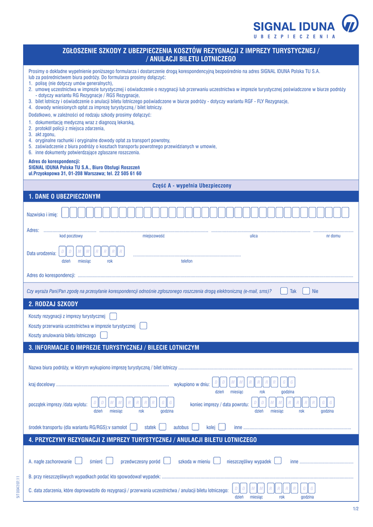 ZGŁOSZENIE SZKODY Z UBEZPIECZENIA KOSZTÓW REZYGNACJI Z IMPREZY TURYSTYCZNEJ / / ANULACJI BILETU LOTNICZEGO Prosimy o dokładne wypełnienie poniższego formularza i dostarczenie drogą korespondencyjną bezpośrednio na adres SIGNAL IDUNA Polska TU S.A. lub za pośrednictwem biura podróży. Do formularza prosimy dołączyć: 1.polisę (nie dotyczy umów generalnych), 2.umowę uczestnictwa w imprezie turystycznej i oświadczenie o rezygnacji lub przerwaniu uczestnictwa w imprezie turystycznej poświadczone w biurze podróży - dotyczy wariantu RG Rezygnacje / RGS Rezygnacje, 3.bilet lotniczy i oświadczenie o anulacji biletu lotniczego poświadczone w biurze podróży - dotyczy wariantu RGF - FLY Rezygnacje, 4.dowody wniesionych opłat za imprezę turystyczną / bilet lotniczy. Dodatkowo, w zależności od rodzaju szkody prosimy dołączyć: 1. dokumentację medyczną wraz z diagnozą lekarską, 2.protokół policji z miejsca zdarzenia, 3.akt zgonu, 4.oryginalne rachunki i oryginalne dowody opłat za transport powrotny, 5.zaświadczenie z biura podróży o kosztach transportu powrotnego przewidzianych w umowie, 6.inne dokumenty potwierdzające zgłaszane roszczenia. Adres do korespondencji: SIGNAL IDUNA Polska TU S.A., Biuro Obsługi Roszczeń ul.Przyokopowa 31, 01-208 Warszawa; tel. 22 505 61 60 Część A - wypełnia Ubezpieczony 1. DANE O UBEZPIECZONYM Nazwisko i imię: Adres: .......................................... ....................................................................................... ............................................................................... ................................ kod pocztowy Data urodzenia: miejscowość D D M M dzień miesiąc R R R R ulica nr domu ...................................................................................... rok telefon Adres do korespondencji: ............................................................................................................................................................................................................................ Tak Czy wyraża Pani/Pan zgodę na przesyłanie korespondencji odnośnie zgłoszonego roszczenia drogą elektroniczną (e-mail, sms)? Nie 2. RODZAJ SZKODY Koszty rezygnacji z imprezy turystycznej Koszty przerwania uczestnictwa w imprezie turystycznej Koszty anulowania biletu lotniczego 3. INFORMACJE O IMPREZIE TURYSTYCZNEJ / BILECIE LOTNICZYM Nazwa biura podróży, w którym wykupiono imprezę turystyczną / bilet lotniczy ........................................................................................................................................... kraj docelowy .......................................................................................... wykupiono w dniu: początek imprezy /data wylotu: D D M M dzień miesiąc środek transportu (dla wariantu RG/RGS):v samolot R R R R rok statek G G D D M M dzień miesiąc koniec imprezy / data powrotu: godzina autobus kolej R R R R G G rok godzina D D M M dzień miesiąc R R R R rok G G godzina inne ...................................................................................... 4. PRZYCZYNY REZYGNACJI Z IMPREZY TURYSTYCZNEJ / ANULACJI BILETU LOTNICZEGO SIT 0047/0?.11 A. nagłe zachorowanie śmierć przedwczesny poród szkoda w mieniu nieszczęśliwy wypadek inne ........................................... B. przy nieszczęśliwych wypadkach podać kto spowodował wypadek: ......................................................................................................................................................... C. data zdarzenia, które doprowadziło do rezygnacji / przerwania uczestnictwa / anulacji biletu lotniczego: D D M M dzień miesiąc R R rok R R G G godzina 1/2 D. Data pisemnego zgłoszenia rezygnacji / przerwania uczestnictwa / anulacji biletu lotniczego w biurze podróży: D D M M dzień miesiąc R R rok R R G G godzina E. Jeżeli zgłoszenie rezygnacji / przerwanie uczestnictwa / anulacja biletu lotniczego nie nastąpiła w ciągu 2 dni od daty zdarzenia, prosimy o podanie powodu: ............................................................................................................................................................................................................................................................... F. Kogo dotyczy zdarzenie? • Ubezpieczonego? tak nie nazwisko i imię: .................................................................................................................................................. • Osoby bliskiej nie biorącej udziału w imprezie? tak nie stopień pokrewieństwa z uczestnikiem imprezy / lotu? ...................................................................................................................................................................... nazwisko i imię: ..................................................................................................................................................... data urodzenia: .................................................. adres zamieszkania: .......................................................................................................................................................................................................................... • Osoby towarzyszącej w wyjeździe? tak nie nazwisko i imię: .................................................................................................................................................... data urodzenia: ................................................... adres zamieszkania: .......................................................................................................................................................................................................................... OŚWIADCZENIE 1. Oświadczam, że powyższe informacje zostały przeze mnie udzielone zgodnie z prawdą i według najlepszej wiedzy. 2. Zwalniam lekarzy lec