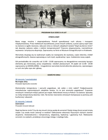 PROGRAM DLA DZIECI 6-9 LAT STREFA ZIMY Bywa sroga, mroźna i nieprzejednana. Potrafi sparaliżować ruch uliczny i transport międzymiastowy. Przez niektórych wyczekiwana, przez innych unikana, a przez sporą część ludzi na świecie w ogóle nieznana. Jaka jest zima w różnych zakątkach świata? Skąd się bierze mróz? Jak dawniej radzono sobie z niskimi temperaturami? Fizyczne eksperymenty, rzemieślnicze wyzwania i artystyczna ekspresja. Zapraszamy na ferie w Muzeum Etnograficznym w Krakowie. Warsztaty skupiają się na wybranym wątku (w nawiązaniu do wystawy, części zbiorów, źródeł etnograficznych). Zawsze wprawiają w ruch myśl, wyobraźnię i ręce. Codziennie nowy wątek. Od poniedziałku do czwartku od 11:00 - 13:00 zapraszamy na dwugodzinne warsztaty łączące elementy gry terenowej, pracy zespołowej i działań plastycznych. W piątki od 11:00 - 14:00 zapraszamy na MODELARNIĘ – trzygodzinne warsztaty konstruktorsko-plastyczne, wprawiające w ruch nie tylko ręce ale i głowę. DZIEŃ PO DNIU 30 stycznia / poniedziałek Na tropie zimy Prowadzi Agnieszka Lisowska Ekstremalne temperatury i warunki pogodowe. Jak sobie z nimi radzić? Podpatrywanie mieszkańców najzimniejszych zakątków świata. Co to jest anomalia pogodowa? Tropienie mroźnych i śnieżnych miejsc palcem po mapie. Rekordowe mrozy w Polsce i na świecie. Sposoby na niską temperaturę dawniej i dziś. Na koniec tworzenie zimowych kompozycji za pomocą soli kuchennej i akwareli. 31 stycznia / wtorek Zamrożeni Prowadzi Urszula Sobczyk Skąd się bierze mróz? Czy da się zmusić zimną wodę do wrzenia? Kiedy śnieg chroni przed stratą ciepła i czy woda może zatonąć w wodzie? Odkrywanie własności fizycznych różnych stanów skupienia. Doświadczenia z temperaturą, objętością, lepkością i gęstością H2O. Malowanie szronem na szybach, produkcja sztucznego śniegu i ciepłego lodu. Muzeum Etnograficzne im. Seweryna Udzieli w Krakowie I www.etnomuzeum.eu I [email protected] I 12 430 60 23 1 lutego / środa Zimowa olimpiada czyli złoto dla zuchwałych Prowadzi Agnieszka Lisowska Kto słyszał o oficjalnych zawodach sportowych w zjeździe na łopacie? Czy łyżwa może być wykonana z drewna? Kto wymyślił pierwsze sanki? Zaskakujące dyscypliny sportu. Dawny sprzęt sportowy. Gwiazdy sportu dzisiaj i sprzed lat. Spacer w rakietach śnieżnych na czas, najdłuższy piruet, skok w dal z telemarkiem- zabawy i konkurencje alternatywnej olimpiady zimowej. Projektowanie własnych medali - czyli sięgamy po złoto. 2 lutego / czwartek Wełna do zadań specjalnych Prowadzi Urszula Sobczyk Chroni przed mrozem, oczyszcza powietrze, działa przeciwbólowo, pomaga w walce ze stresem, zimową chandrą i przeziębieniami. Wymarzona na ferie i… znana od wieków! Wędrówka przez kontynenty i epoki szlakiem (niemal) złotego runa. Sekrety średniowiecznych sukienników, prządek, wiejskich foluszników, twórców szlachetnego kaszmiru. Eksperymenty w muzealnym laboratorium włókienniczym. Pierwsze kroki w filcowaniu na mokro. 3 lutego / piątek MODELARNIA (11:00-14:00) Prowadzi Katarzyna Dorota Jak wykorzystać długie zimowe wieczory, gdy pogoda nie zachęca do wyjścia na spacer i szybko robi się ciemno? Czy dawniej zima była czasem odpoczynku? A może tylko pozornego? Warsztaty będą okazją do poznania podstaw dawnych technik związanych z tkaniem, szyciem i wyplataniem. Wykorzystamy ten potencjał do stworzenia wyjątkowych połączeń i kompozycji. Zimowe zajęcia dawnych mieszkańców wsi staną się punktem wyjścia do wykonania własnych poduszek, ozdobionych haftem, pomponami i tradycyjnymi wzorami. Najcierpliwsi będą mogli spróbować swoich sił w tkaniu krajki na bardku. 6 lutego / poniedziałek Zima – instrukcja obsługi Prowadzi Nina Kulik W jaki sposób przetrwać mróz bez kaloryfera? Skąd wziąć jedzenie kiedy brak supermarketu? Jak ze śnieżną zawieruchą radzą sobie zwierzęta? Zimowy survival sprzed stu lat. Podglądanie zwierzęcych sposobów na ciężką zimę. Szukanie mądrych sposobów na dokarmianie ptaków i tworzenie specjalnych mieszanek obiadowych dla łabędzi mieszkających niedaleko Muzeum. Muzeum Etnograficzne im. Seweryna Udzieli w Krakowie I www.etnomuzeum.eu I [email protected] I 12 430 60 23 7 lutego / wtorek Inuici i baśnie o wiecznej zimie Prowadzi Mateusz Żebrowski Kim są i skąd dokładnie pochodzą mieszkańcy północnych krańców ziemi? Jak przetrwać w groźnych warunkach dalekich krain? Czy w tym zadaniu lepiej pomogą dawne mity, czy może obserwacja natury? Historie i legendy Inuitów. Świat wierzeń i życia ludów koła podbiegunowego. Przygotowania do zimowej zamieci: konstruowanie gogli chroniących od śnieżnej zawieruchy. 8 lutego / środa Baśniowa zima Prowadzi Nina Kulik Czy łatwo uzyskać dźwięk pękającego pod stopami lodu? Jakim kolorem można namalować mróz? Czy padający śnieg rzuca cień? Sztuka opowiadania baśni za pomocą obrazu, dźwięku i ruchu. Testowanie różnych zmysłów. Teatr cieni, ilustracja i radiowe słuchowisko - niekonwencjonalne sposoby snucia opowieści na długie zimowe wieczory. 9 lutego / czwartek Kierunek - Północ! Prowadzi Mateusz Żebrowski Kiedy zaczęto odkrywać północ? Jak zdobywano zlodowaciałe bezkresy? Opowieść i gra, która pozwoli wcielić się w członków załogi norweskiego lodołamacza, próbującego dostać się na daleką północ. Podział obowiązków i zadań, warunki życia na statku, ale i niecodzienność widoków za oknem. Spotkania z północnymi zwierzętami i wyzwaniami, rzucanymi przez złowieszcze warunki pogodowe. To wszystko spotka śmiałków chcących zgłębić tajniki arktycznych wędrówek. 10 lutego / piątek MODELARNIA (11:00 – 14:00) Prowadzi Katarzyna Dorota Do czego może przydać się słoma, groch i papier? Czy da się z nich zrobić niepowtarzalną ozdobę, której nie powstydziłby się żaden architekt wnętrz? Podczas warsztat