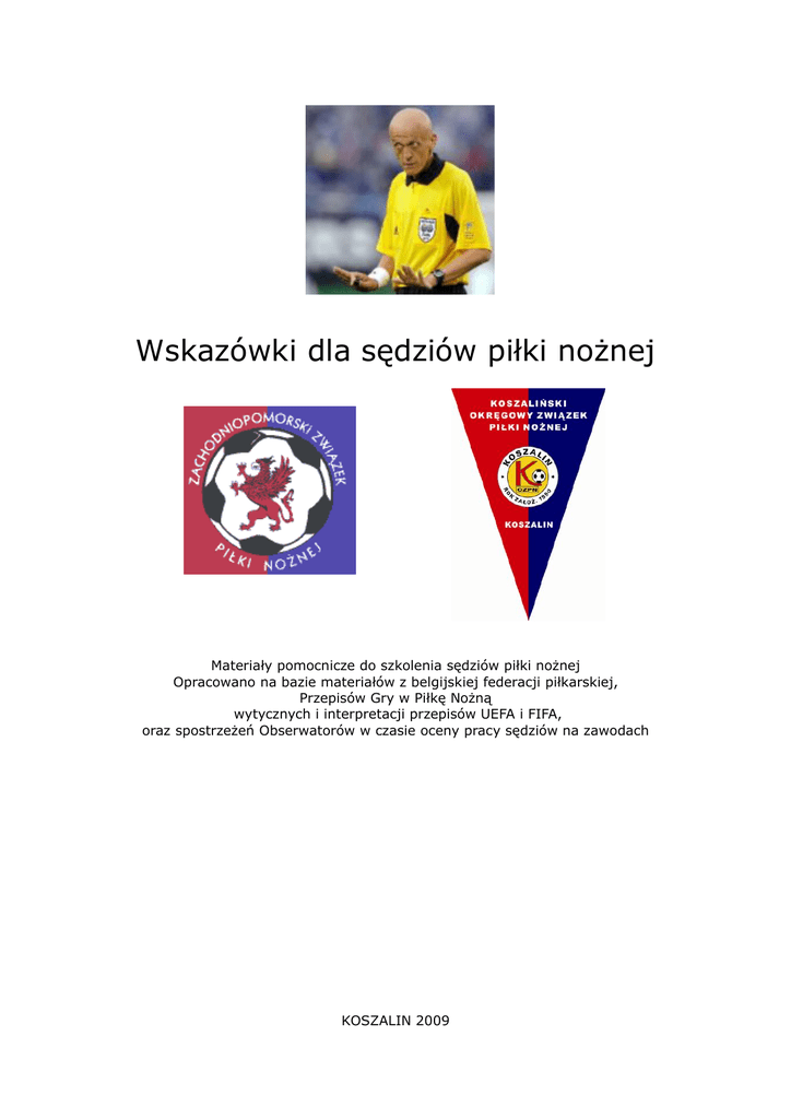 Wskazówki dla sędziów piłki nożnej Materiały pomocnicze do szkolenia sędziów piłki nożnej Opracowano na bazie materiałów z belgijskiej federacji piłkarskiej, Przepisów Gry w Piłkę Nożną wytycznych i interpretacji przepisów UEFA i FIFA, oraz spostrzeżeń Obserwatorów w czasie oceny pracy sędziów na zawodach KOSZALIN 2009 SPIS TREŚCI Osobowość.....................................................................................................................2 Sygnalizacja...................................................................................................................3 Sygnał gwizdka..............................................................................................................4 Ustawienie.....................................................................................................................5 Przemieszczanie się.......................................................................................................6 Zastosowanie korzyści...................................................................................................8 Współpraca z asystentami.............................................................................................9 Władza.........................................................................................................................11 Różne...........................................................................................................................13 1 Osobowość Przed spotkaniem: 1. Przyjedź na stadion odpowiednio wcześnie, by móc dobrze przygotować się do meczu 2. Bądź ubrany schludnie i odpowiednio do sytuacji 3. Przygotuj odpowiednio sprzęt do meczu (wybierz kolory koszulek, przypnij odpowiednią odznakę) 4. Wybierz odpowiedni sposób kontaktowania się z kierownictwem i graczami 5. Rozpocznij zawody dokładnie o wyznaczonej porze 6. Odpowiednio poinstruuj sędziów asystentów Podczas spotkania Czy twoje zachowanie wykazuje brak: 1. Zdecydowania 2. Kompetencji 3. Spokoju 4. Charakteru 5. Motywacji 6. Skromności 7. Elastyczności 8. Taktu 9. „Obecności” 10. Pewności siebie 11. Analizy rozwoju spotkania 12. Analizy zachowania zawodników W swoim zachowaniu powinieneś unikać: 1. 2. 3. 4. 5. 6. 7. Przybierania prowokującej postawy Używania niestosownych do sytuacji gestów Zbytniej poufałości Zbytniego napięcia Zbytniej impulsywności czy stanowczości Dyskusji Ulegania wpływom Po spotkaniu: 1. Osobiste problemy, choroba lub kontuzja nie powinny być dla Ciebie wymówką za słabo poprowadzony mecz 2. Unikaj przesadnych kontaktów z przedstawicielami klubów 3. Bądź dyskretny i rzeczowy wobec przedstawicieli klubów 4. Bądź otwarty podczas omawiania zawodów 2 Sygnalizacja Ogólnie: 1. Daj znak do wznowienia gry poprzez gest lub sygnał gwizdka 2. Przyspieszaj gestem wznawianie gry 3. Wskaż od razu kierunek wznowienia i, jeśli to konieczne, miejsce wznowienia używając tej samej ręki 4. Nie bądź zbyt wylewny podczas wyjaśniania swoich decyzji i nie używaj nadmiernej ekspresji przy naśladowaniu fauli 5. Biorąc pod uwagę warunki, używaj lewej lub prawej ręki Czy twoja sygnalizacja nie jest czasami: 1. 2. 3. 4. 5. 6. 7. 8. Spóźniona Nieodpowiednia do wytycznych Niejasna Przesadzona Niedostatecznie energiczna Niedostatecznie zgrabna Nie ma jej w ogóle Niedopracowana Przy rzucie wolnym pośrednim: 1. Podnieś rękę dopiero, gdy dasz sygnał na wykonanie rzutu 2. Trzymaj rękę w górze, dopóki piłka nie dotknie jakiegokolwiek zawodnika lub nie wyjdzie z gry Przy wrzucie: 1. Kierunek wrzutu powinien być pokazany od razu 2. Wskazanie miejsca wrzutu nie jet potrzebne, chyba że zawodnik o to prosi Podczas przyznawania korzyści: 1. Sygnalizacja korzyści jest niezbędna w momencie, gdy korzyść rzeczywiście została przyznana 2. Sygnalizacja korzyści jest zabroniona, kiedy nie popełniono faulu lub by usprawiedliwić nieodgwizdany faul Podczas wymiany lub po chwilowym opuszczeniu pola gry przez zawodnika: 1. Zawodnik musi otrzymać sygnał zezwalający mu na powrót na boisko 3 Sygnał gwizdka Czy Twój gwizdek jest: 1. 2. 3. 4. 5. 6. 7. 8. Monotonny Spóźniony Nie na miejscu Nadmierny Zbyt agresywny Zbyt słaby Nie różnicuje powagi fauli Zbyt częsty Sygnał gwizdka jest wymagany przy: 1. 2. 3. 4. 5. 6. 7. 8. Rozpoczęciu gry Zasygnalizowaniu przewinienia Wznowieniu gry z rzutów wolnych, kiedy sędzia zarządzi odsunięcie „muru” Przerwaniu gry Rzucie karnym Udzielonej karze indywidualnej Dokonanej wymianie zawodników Końcu każdej części gry Sygnał gwizdka nie jest wymagany: 1. 2. 3. 4. 5. Zdobycia bramki Rzutu od bramki Rzutu z rogu Wrzutu Rzutu wolnego 4 Ustawienie Ogólne: 1. Twoje ustawienie powinno pozwolić Ci, w każdym momencie gry, mieć w polu widzenia jak największą liczbę zawodników, szczególnie tych, znajdujących się w polu karnym 2. Twoje ustawienie powinno pozwolić Ci, w każdym momencie gry, mieć w polu widzenia piłkę 3. Dostosowuj swoje ustawienie do warunków (czasu, pojedynków jeden na jeden, kontuzji, stanu murawy) Czy Twoje ustawienie jest prawidłowe przy: 1. 2. 3. 4. 5. 6. 7. 8. 9. Rozpoczęciu gry (od strony lewej ręki zaczynającego) Rzucie od bramki Rzucie z rogu Wrzucie Rzucie sędziowskim Wznowieniu gry Wybiciu piłki przez bramkarza Rzucie wolnym w środkowej strefie pola gry Rzucie wolnym w pobliżu pola karnego Ustawienie względem sędziów asystentów: 1. Nie stój na wysokości sędziego asystenta podczas wznowienia gry 2. Kontroluj jednak raz na jakiś czas sędziego asystenta i spalonego 3. Nie odwracaj się tyłem do asystentami 5 Przemieszczanie się Ogólnie: 1. Nie stój w kole środkowym; jeśli już musisz się w nim znaleźć, staraj się, żeby ta obecność była jak najkrótsza 2. Żeby poprawić swoje ustawienie, korzystaj z każdej przerwy w grze, by przewidzieć co będzie się działo na boisku i odpowiednio się ustawić 3. Nie biegnij