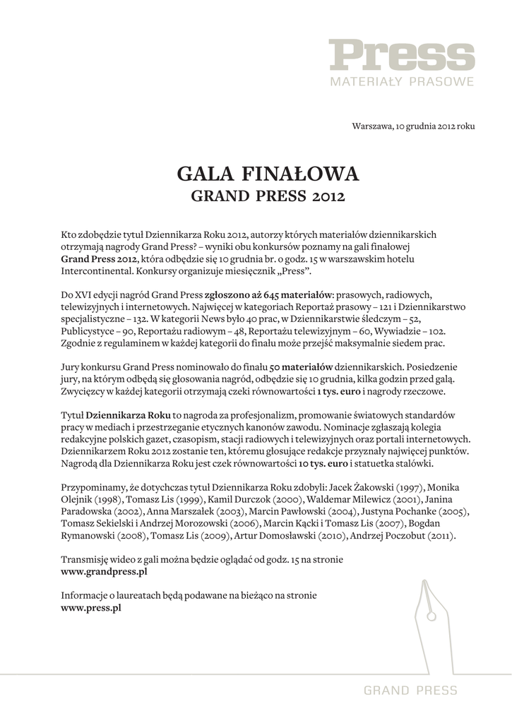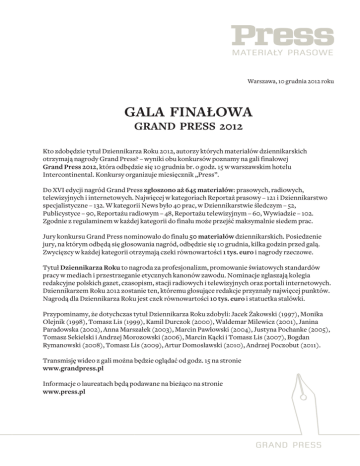 MATERIAŁY PRASOWE Warszawa, 10 grudnia 2012 roku GALA FINAŁOWA GRAND PRESS 2012 Kto zdobędzie tytuł Dziennikarza Roku 2012, autorzy których materiałów dziennikarskich otrzymają nagrody Grand Press? – wyniki obu konkursów poznamy na gali finałowej Grand Press 2012, która odbędzie się 10 grudnia br. o godz. 15 w warszawskim hotelu Intercontinental. Konkursy organizuje miesięcznik „Press”. Do XVI edycji nagród Grand Press zgłoszono aż 645 materiałów: prasowych, radiowych, telewizyjnych i internetowych. Najwięcej w kategoriach Reportaż prasowy – 121 i Dziennikarstwo specjalistyczne – 132. W kategorii News było 40 prac, w Dziennikarstwie śledczym – 52, Publicystyce – 90, Reportażu radiowym – 48, Reportażu telewizyjnym – 60, Wywiadzie – 102. Zgodnie z regulaminem w każdej kategorii do finału może przejść maksymalnie siedem prac. Jury konkursu Grand Press nominowało do finału 50 materiałów dziennikarskich. Posiedzenie jury, na którym odbędą się głosowania nagród, odbędzie się 10 grudnia, kilka godzin przed galą. Zwycięzcy w każdej kategorii otrzymają czeki równowartości 1 tys. euro i nagrody rzeczowe. Tytuł Dziennikarza Roku to nagroda za profesjonalizm, promowanie światowych standardów pracy w mediach i przestrzeganie etycznych kanonów zawodu. Nominacje zgłaszają kolegia redakcyjne polskich gazet, czasopism, stacji radiowych i telewizyjnych oraz portali internetowych. Dziennikarzem Roku 2012 zostanie ten, któremu głosujące redakcje przyznały najwięcej punktów. Nagrodą dla Dziennikarza Roku jest czek równowartości 10 tys. euro i statuetka stalówki. Przypominamy, że dotychczas tytuł Dziennikarza Roku zdobyli: Jacek Żakowski (1997), Monika Olejnik (1998), Tomasz Lis (1999), Kamil Durczok (2000), Waldemar Milewicz (2001), Janina Paradowska (2002), Anna Marszałek (2003), Marcin Pawłowski (2004), Justyna Pochanke (2005), Tomasz Sekielski i Andrzej Morozowski (2006), Marcin Kącki i Tomasz Lis (2007), Bogdan Rymanowski (2008), Tomasz Lis (2009), Artur Domosławski (2010), Andrzej Poczobut (2011). Transmisję wideo z gali można będzie oglądać od godz. 15 na stronie www.grandpress.pl Informacje o laureatach będą podawane na bieżąco na stronie www.press.pl GRAND PRESS MATERIAŁY PRASOWE NOMINACJE DO NAGRÓD GRAND PRESS 2012 Kategoria NEWS 1/ Cykl „Taśmy PSL” – opublikowane przez Piotra Nisztora („Puls Biznesu”) nagrania rozmów działaczy PSL odsłaniających nepotyzm i machlojki w spółkach związanych z resortem rolnictwa. W efekcie minister rolnictwa Marek Sawicki ustąpił ze stanowiska, a sprawę zaczęły badać prokuratura i CBA. 2/ „Sensacyjne nagrania w sprawie Amber Gold” – tekst Samuela Pereiry („Gazeta Polska Codziennie”) powstały w wyniku dziennikarskiej prowokacji Pawła Mitera, która dowiodła, że prezes Sądu Okręgowego w Gdańsku chciał uzgadniać z rzekomym urzędnikiem kancelarii premiera termin posiedzenia sądu w sprawie aresztowanego właściciela Amber Gold Marcina P. 3/ „Kościołowi ile się da” – tekst Marcina Pietraszewskiego („Gazeta Wyborcza”) ujawniający, że istnieje rządowy raport o pracy Komisji Majątkowej opisujący nieprawidłowości, w wyniku których straty ponosił skarb państwa. 4/ „Rzeczpospolita, unijne centrum inwigilacji ludzi” – tekst Roberta Zielińskiego („Dziennik Gazeta Prawna”) udowadniający, że jesteśmy najbardziej inwigilowanym krajem w Europie. 5/ „Zabrali matkę w nocy na oczach jej dzieci” – news Mireli Mazurkiewicz („Nowa Trybuna Opolska”) o policjantach, którzy w nocy zabrali z domu kobietę, ponieważ nie zapłaciła 2,3 tys. zł grzywny, a jej dwoje małych dzieci umieścili w pogotowiu opiekuńczym. 6/ „Sławomir Petelicki nie żyje” – informacja Romana Osicy (RMF FM) o tym, że generał Sławomir Petelicki nie żyje oraz że prawdopodobnie było to samobójstwo. 7/ Informacja Kingi Kessler-Malinowskiej („Info Serwis” TVP Info) o tym, że w Szczekocinach na Śląsku doszło do wypadku kolejowego. Kategoria DZIENNIKARSTWO ŚLEDCZE 1/ Cykl tekstów Sylwestra Latkowskiego i Michała Majewskiego („Wprost”), którzy – próbując wyjaśnić kulisy afery Amber Gold – odkryli, że syn premiera Michał Tusk pracował równocześnie dla portu lotniczego i OLT Express, popadając w konflikt interesów. 2/ „Murzyni pana Mirka” – tekst Wojciecha Cieśli („Newsweek Polska”) i materiał Mariusza Gierszewskiego (Radio Zet) ujawniające, że działacz Platformy Obywatelskiej Mirosław Skorupski bez licencji sprowadza piłkarzy z Afryki, co zdaniem Fundacji La Strada pachnie handlem żywym towarem. 3/ „Afera solna” – materiał Tomasza Patory („Uwaga!” TVN) będący efektem śledztwa, które ujawniło, że na rynek spożywczy trafiała sól wypadowa nadająca się wyłącznie do celów przemysłowych. 4/ Cykl tekstów Artura Grabka („Rzeczpospolita”) ujawniających nieprawidłowości przy konkursie na e-podręczniki – wielomilionowe zlecenia trafiały do firm i ludzi z otoczenia wiceministra edukacji. 5/ „W imieniu Kościoła” – materiał Bertolda Kittela, Jarosława Jabrzyka i Michała Stankiewicza („Superwizjer” TVN), w którym dzięki dziennikarskiej prowokacji wykazano, że państwo mogło płacić za mienie oddawane Kościołowi na podstawie zawyżonych wycen sporządzonych przez rzeczoznawców pracujących dla osób z Komisji Majątkowej. GRAND PRESS MATERIAŁY PRASOWE 6/ „Spuchnięta głowa króla kokainy” – tekst Marka Górlikowskiego i Romana Daszczyńskiego („Gazeta Wyborcza”) odkrywający dziwne okoliczności śmierci łącznika karteli narkotykowych Artura B. po tym, jak trafił do więzienia w Sztumie. 7/ Cykl „Tak się kręci film na giełdzie” Karola Jedlińskiego („Puls Biznesu”) ujawniający, że współpracownik prezesa Giełdy Papierów Wartościowych w Warszawie wspierał produkcję filmu, w który zaangażowana je