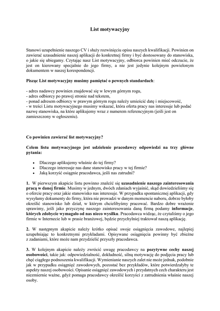 List motywacyjny Stanowi uzupełnienie naszego CV i służy rozwinięciu opisu naszych kwalifikacji. Powinien on zawierać uzasadnienie naszej aplikacji do konkretnej firmy i być dostosowany do stanowiska, o jakie się ubiegamy. Czytając nasz List motywacyjny, odbiorca powinien mieć odczucie, że jest on kierowany specjalnie do jego firmy, a nie jest jedynie kolejnym powielonym dokumentem w naszej korespondencji. Pisząc List motywacyjny musimy pamiętać o pewnych standardach: - adres nadawcy powinien znajdować się w lewym górnym rogu, - adres odbiorcy po prawej stronie nad tekstem, - ponad adresem odbiorcy w prawym górnym rogu należy umieścić datę i miejscowość, - w treści Listu motywacyjnego musimy wskazać, która oferta pracy nas interesuje lub podać nazwę stanowiska, na które aplikujemy wraz z numerem referencyjnym (jeśli jest on zamieszczony w ogłoszeniu). Co powinien zawierać list motywacyjny? Celem listu motywacyjnego jest udzielenie pracodawcy odpowiedzi na trzy główne pytania: Dlaczego aplikujemy właśnie do tej firmy? Dlaczego interesuje nas dane stanowisko pracy w tej firmie? Jaką korzyść osiągnie pracodawca, jeśli nas zatrudni? 1. W pierwszym akapicie listu powinno znaleźć się uzasadnienie naszego zainteresowania pracą w danej firmie. Musimy w jednym, dwóch zdaniach wyjaśnić, skąd dowiedzieliśmy się o ofercie pracy oraz jakie stanowisko nas interesuje. W przypadku spontanicznej aplikacji, gdy wysyłamy dokumenty do firmy, która nie prowadzi w danym momencie naboru, dobrze byłoby określić stanowisko lub dział, w którym chcielibyśmy pracować. Bardzo dobre wrażenie sprawimy, jeśli jako przyczynę naszego zainteresowania daną firmą podamy informacje, których zdobycie wymagało od nas nieco wysiłku. Pracodawca widząc, że czytaliśmy o jego firmie w Internecie lub w prasie branżowej, będzie przychylniej traktował naszą aplikację. 2. W następnym akapicie należy krótko opisać swoje osiągnięcia zawodowe, najlepiej uzupełniając to konkretnymi przykładami. Opisywane osiągnięcia powinny być zbieżne z zadaniami, które może nam przydzielić przyszły pracodawca. 3. W kolejnym akapicie należy zwrócić uwagę pracodawcy na pozytywne cechy naszej osobowości, takie jak: odpowiedzialność, dokładność, silną motywację do podjęcia pracy lub chęć ciągłego podnoszenia kwalifikacji. Wymienianie naszych zalet nie może jednak, podobnie jak w przypadku osiągnięć zawodowych, pozostać bez przykładów, które potwierdzałyby te aspekty naszej osobowości. Opisanie osiągnięć zawodowych i przydatnych cech charakteru jest niezmiernie ważne, gdyż pomaga pracodawcy określić korzyści z zatrudnienia właśnie naszej osoby. 4. List motywacyjny można zakończyć stwierdzeniem, że chcielibyśmy się osobiście zaprezentować przyszłemu pracodawcy podczas rozmowy kwalifikacyjnej. 5. List kończymy grzecznościową formą, np.: „Łączę wyrazy szacunku” lub „Z poważaniem”, a poniżej złożyć własnoręczny podpis. O czym trzeba pamiętać? Tekst Listu motywacyjnego powinien być podzielony na akapity, całość powinna być czytelna i przejrzysta, wydrukowana na papierze dobrej jakości. List powinien być napisany na komputerze czytelną czcionką. W Liście motywacyjnym nie można kłamać, gdyż nawet jeśli zrobimy dobre wrażenie i zostaniemy zaproszeni na rozmowę kwalifikacyjną, to podczas bezpośredniego kontaktu wszelkie nieścisłości zostaną wyłapane, co fatalnie wpłynie na opinię pracodawcy o nas. Na końcu listu motywacyjnego umieszczamy listę załączników: CV, kserokopię świadectwa lub dyplomu ukończenia studiów, świadectwa ukończonych kursów itd. Najczęściej popełniane błędy: Używanie sformułowań dających pracodawcy poczucie, że jesteśmy zdesperowani; ton listu powinien być spokojny i rzeczowy, a nie mieć charakteru błagalnej prośby. Zapominanie o umieszczeniu numeru referencyjnego, tytułu prasowego oraz daty publikacji ogłoszenia w przypadku ubiegania się o konkretne stanowisko z ogłoszenia. Powtarzanie wiadomości zamieszczonych w CV. Przekraczanie objętości listu ponad jedną stronę formatu A4. Przesyłanie Listu motywacyjnego zawierającego błędy ortograficzne, gramatyczne lub stylistyczne. Brak własnoręcznego podpisu na końcu listu. Używanie skrótów lub sloganów niezrozumiałych dla czytającego. Posługiwanie się tym samym Listem motywacyjnym przy ubieganiu się o różne stanowiska. Pomyłka w nazwie stanowiska, o jakie się ubiegamy. Pomyłka w imionach i nazwiskach osób, do których kierujemy dokumenty. Zamieszczanie w Liście osobistych informacji, typu: sytuacja rodzinna, trudna sytuacja finansowa itd. Kserowanie Listu motywacyjnego i wysyłanie tej samej wersji do wielu firm. Zbyt nachalne pisanie o swoich zaletach. Jakiekolwiek skreślenia i poprawki w przypadku, gdy wymagane jest odręczne napisanie listu.