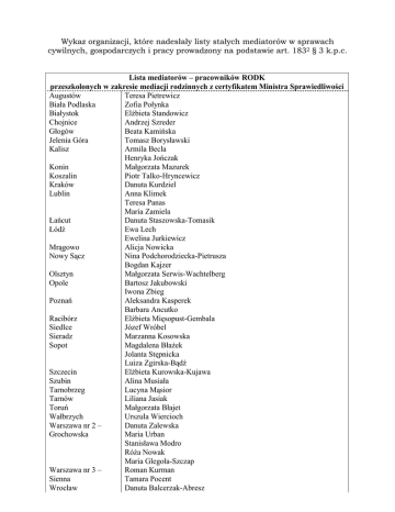 Wykaz organizacji, które nadesłały listy stałych mediatorów w sprawach cywilnych, gospodarczych i pracy prowadzony na podstawie art. 1832 § 3 k.p.c. Lista mediatorów – pracowników RODK przeszkolonych w zakresie mediacji rodzinnych z certyfikatem Ministra Sprawiedliwości Augustów Teresa Pietrewicz Biała Podlaska Zofia Połynka Białystok Elżbieta Standowicz Chojnice Andrzej Szreder Głogów Beata Kamińska Jelenia Góra Tomasz Borysławski Kalisz Armila Becla Henryka Jończak Konin Małgorzata Mazurek Koszalin Piotr Talko-Hryncewicz Kraków Danuta Kurdziel Lublin Anna Klimek Teresa Panas Maria Zamiela Łańcut Danuta Staszowska-Tomasik Łódź Ewa Lech Ewelina Jurkiewicz Mrągowo Alicja Nowicka Nowy Sącz Nina Podchorodziecka-Pietrusza Bogdan Kajzer Olsztyn Małgorzata Serwis-Wachtelberg Opole Bartosz Jakubowski Iwona Zbieg Poznań Aleksandra Kasperek Barbara Ancutko Racibórz Elżbieta Mięsopust-Gembala Siedlce Józef Wróbel Sieradz Marzanna Kosowska Sopot Magdalena Błażek Jolanta Stępnicka Luiza Zgirska-Bądź Szczecin Elżbieta Kurowska-Kujawa Szubin Alina Musiała Tarnobrzeg Lucyna Mąsior Tarnów Liliana Jasiak Toruń Małgorzata Błajet Wałbrzych Urszula Wiercioch Warszawa nr 2 – Danuta Zalewska Grochowska Maria Urban Stanisława Modro Róża Nowak Maria Glegoła-Szczap Warszawa nr 3 – Roman Kurman Sienna Tamara Pocent Wrocław Danuta Balcerzak-Abresz Marzena Stodólska Anna Oleszczuk-Sawoniewicz Elżbieta Topornicka-Chmura Zawiercie Elżbieta Noszczyk Zduńska Wola Danuta Piotrowska Krajowe Stowarzyszenie Mediatorów z/s w Poznaniu www.mediacje.republika.pl Centrum Mediacji Gospodarczej BUSINESS MEDIATION CENTRE ul. Górnickiego 3 m 10a 02-063 Warszawa www.pssp.org.pl; www.fpp.org.pl Ewa Gmurzyńska Krzysztof Falkiewicz Violetta Huryn Piotr Nowaczyk Sylwester Pieckowski Łukasz Rozdeiczer Maciej Tański Tomasz Zbiegień Magdalena Życzkowska-Jóźwiak Ośrodek Mediacji przy Okręgowej Izby Radców Prawnych w Warszawie ul. Żytnia 18 lok.I 01-014 Warszawa t. 0 22 8626607 fax 0 22 8624173 Zakopane Zamość Nazwisko i imię Bąk Katarzyna Bodek Magdalena Boruc Marzenna Cybart Barbara Draganiak-Kania Marzena Falkiewicz Krzysztof Faruga Piotr Ryszard Iwańczuk Tomasz Jabłoński Waldemar Jankowska-Piskorska Bożena Jasiński Krzysztof Jaszczyńska Anna Kozieł Agnieszka Ładecka Krystyna Łubieński Tomasz Maksjan-Wócik Agata Miszkin-Wojciechowska Malgorzata Nowaczyk Piotr Orłowska Irena Orłowski Krzysztof Potocka Joanna Romanowska Anna Spandowska Weronika Stando-Sasiak Grażyna Stejblis Marek Szymański Kamil Tarasiuk-Flodrowska Anna Specjalizacja prawo telekomunikacyjne, rynek IT, ochrona walności intelektualnej własność lokali, spóldzielcza, cywilne prawo autorskie, ochrona własności intelektualnej gospodarcze, cywilne gospodarcze w szczególności prawo medialne cywilne, gospodarcze dialog społeczny, gospodarcze prawo autorskie, wyznaniowe, rozwody gospodarcze, bankowe, cywilne, rodzinne ubezpieczenia umów finansowe, bankowe, dewizowe gospodarcze, cywilne, handlowe cywilne, handlowe gospodarcza prawo pracy, cywilne, gospodarcze gospodarcze, pracy budowlane, własność intelektualna, kontrakty handlowe cywilne cywilne, gospodarcze, finansowe cywilne, gospodarcze rynek kapitałowy, papiery wartościowe, kodeks spółek handlowych spadkowe, cywilne, rodzinne autorskie, cywilne gospodarcze, finansowe prawo pracy, rodzinne prawo ubezpieczeń gospodarczych, prawo cywilne transport publiczny Tataj-Kuć Hanna administracyjne Tyszkiewicz Danuta gospodarcze Urbańska Barbara prawo budowlane, obrót gospodarczy (umowy agencyjne, IT) Wysok Violetta ubezpieczenia majątkowe, cywilne Zawadzka Elżbieta gospodarcze, handlowe, pracy Żarczyński Adam cywilne, pracy, gospodarcze, budowlane Życzkowska Anna Siedlecki Oddział Polskiego Centrum Mediacji ul. Podmiejska 3 08-110 Siedlce Grodzicki Artur Borkowski Leszek Cieszak Sławomir Wyrzykowski Mariusz Jaszczołt Waldemar Gul Jarosław Kulik Adam Chalecka Wiesława Gadomska Krystyna Gadomska Magdalena Wyrzykowska-Dudek Urszula Bryńczak Bożena Stowarzyszenie Syndyków, Rzeczoznawców i Doradców Gospodarczych Polska-Europa ul. Skwer Kard.Wyszyńskiego 5 lok. 14 01-015 Warszawa Banaszkiewicz Katarzyna Barancewicz Henryk Barszcz Bogdan Bieńkowski Marek Bulikowski Piotr Chudzik Zbigniew Czerniowski Dariusz Diduch Stanisław Fijałkowski Tomasz Flis Artur Golinia Anetta Grodzicka Maria Jarzynka Józef Jończyk Aneta Kaleta Mirosław Kalinowski Andrzej Kalinowski Krzysztof Kamiński Mariusz Kardas-Gołębiowska Małgorzata Koper Barbara Kowalczyk Agnieszka Lechmańska Halina Leśniewska Dorota Łopatka Barbara Łuczyńska Grażyna Mariak Jerzy Musiałowska Alina Okuniewicz Zbigniew Piechurski Dariusz Piotrowska Ewa Pisarski Rajmund Płochocka Regina Robak Kamila Szulgacz Joanna Szulgacz Sylwester Szuszkiewicz Janina Trojanowska Barbara Typrowicz Zbigniew Wojcieszek Bogusława Zarębski Grzegorz Ziembiński Marek Ziółkowska-Markiewicz Anna KRAJOWY SĄD ARBITRAŻOWY W WARSZAWIE ul. Bukowiecka 92 03-893 Warszawa sprawy cywilne i gospodarcze stan na 25.11.2011 roku wyższe Magister Nauk Adamus Przemysław 03-893 Warszawa Prawnych ul. Bukowiecka 92 wyższe Magister Nauk Ceglarek Natalia 03-893 Warszawa Prawnych ul. Bukowiecka 92 wyższe Magister Nauk Czepik Aleksiej 02-495 Warszawa Prawnych i Administracji ul. Skoroszewska 1b m 98 wyższe Magister Nauk Domagalski Maciej 02-796 Warszawa Prawnych ul. Zaruby 11 m 133 wyższe Magister Socjologii 20-418 Lublin Gałęzowski Tomasz ul. Nowy Świat 36A/21 wyższe Magister Nauk Jagodzińska-Bajkowska 03-044 Warszawa Prawnych Anna ul. Płochocińska 107P wyższe Magister Nauk Kamieńska Joanna Kancelaria Radców Prawnych S.C. Prawnych 15-084 Białystok ul. E. Orzeszkowej 32 lok.502 wyższe magister Executive 03-893 Warszawa Kucharska-Szydelska MBA Małgorzata ul. Bukowiecka 92 wyższe Magister Nauk Lenarczyk Michał Kancelaria Prawnicza Prawnych Lenar&Lawyers 00-539 Warszawa ul.
