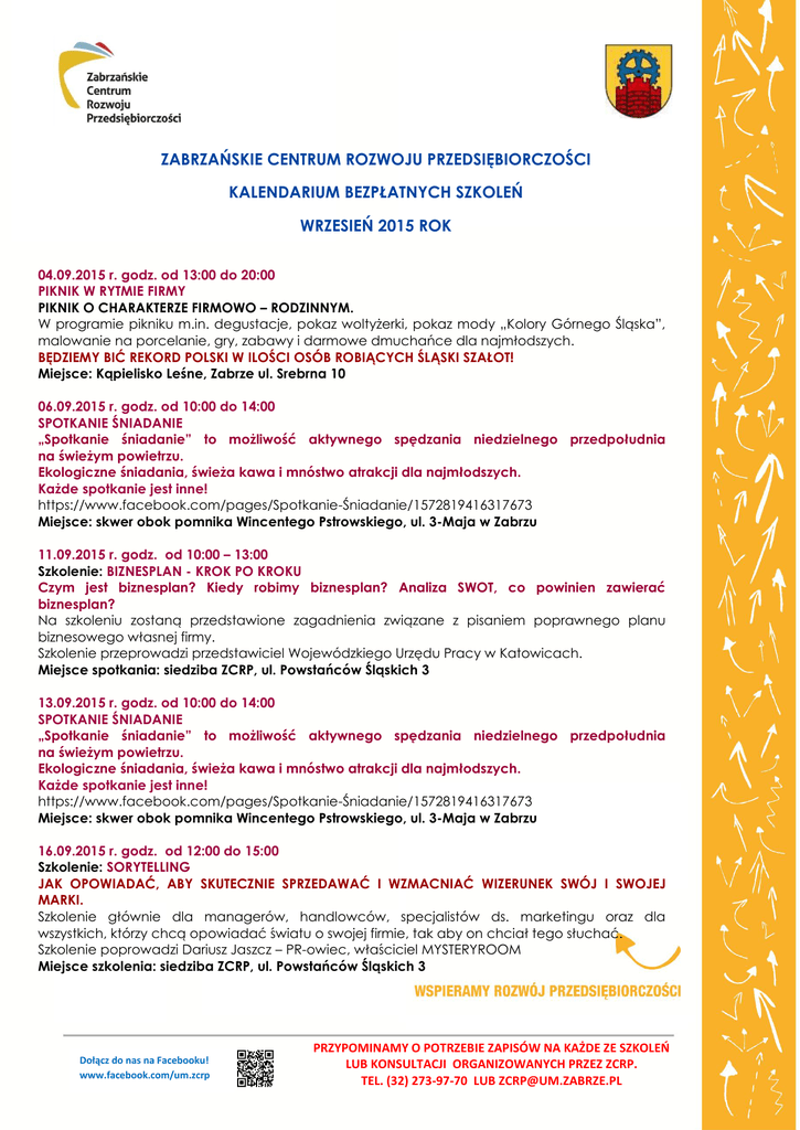 ZABRZAŃSKIE CENTRUM ROZWOJU PRZEDSIĘBIORCZOŚCI KALENDARIUM BEZPŁATNYCH SZKOLEŃ WRZESIEŃ 2015 ROK 04.09.2015 r. godz. od 13:00 do 20:00 PIKNIK W RYTMIE FIRMY PIKNIK O CHARAKTERZE FIRMOWO – RODZINNYM. W programie pikniku m.in. degustacje, pokaz woltyżerki, pokaz mody „Kolory Górnego Śląska”, malowanie na porcelanie, gry, zabawy i darmowe dmuchańce dla najmłodszych. BĘDZIEMY BIĆ REKORD POLSKI W ILOŚCI OSÓB ROBIĄCYCH ŚLĄSKI SZAŁOT! Miejsce: Kąpielisko Leśne, Zabrze ul. Srebrna 10 06.09.2015 r. godz. od 10:00 do 14:00 SPOTKANIE ŚNIADANIE „Spotkanie śniadanie” to możliwość aktywnego spędzania niedzielnego przedpołudnia na świeżym powietrzu. Ekologiczne śniadania, świeża kawa i mnóstwo atrakcji dla najmłodszych. Każde spotkanie jest inne! https://www.facebook.com/pages/Spotkanie-Śniadanie/1572819416317673 Miejsce: skwer obok pomnika Wincentego Pstrowskiego, ul. 3-Maja w Zabrzu 11.09.2015 r. godz. od 10:00 – 13:00 Szkolenie: BIZNESPLAN - KROK PO KROKU Czym jest biznesplan? Kiedy robimy biznesplan? Analiza SWOT, co powinien zawierać biznesplan? Na szkoleniu zostaną przedstawione zagadnienia związane z pisaniem poprawnego planu biznesowego własnej firmy. Szkolenie przeprowadzi przedstawiciel Wojewódzkiego Urzędu Pracy w Katowicach. Miejsce spotkania: siedziba ZCRP, ul. Powstańców Śląskich 3 13.09.2015 r. godz. od 10:00 do 14:00 SPOTKANIE ŚNIADANIE „Spotkanie śniadanie” to możliwość aktywnego spędzania niedzielnego przedpołudnia na świeżym powietrzu. Ekologiczne śniadania, świeża kawa i mnóstwo atrakcji dla najmłodszych. Każde spotkanie jest inne! https://www.facebook.com/pages/Spotkanie-Śniadanie/1572819416317673 Miejsce: skwer obok pomnika Wincentego Pstrowskiego, ul. 3-Maja w Zabrzu 16.09.2015 r. godz. od 12:00 do 15:00 Szkolenie: SORYTELLING JAK OPOWIADAĆ, ABY SKUTECZNIE SPRZEDAWAĆ I WZMACNIAĆ WIZERUNEK SWÓJ I SWOJEJ MARKI. Szkolenie głównie dla managerów, handlowców, specjalistów ds. marketingu oraz dla wszystkich, którzy chcą opowiadać światu o swojej firmie, tak aby on chciał tego słuchać. Szkolenie poprowadzi Dariusz Jaszcz – PR-owiec, właściciel MYSTERYROOM Miejsce szkolenia: siedziba ZCRP, ul. Powstańców Śląskich 3 Dołącz do nas na Facebooku! www.facebook.com/um.zcrp PRZYPOMINAMY O POTRZEBIE ZAPISÓW NA KAŻDE ZE SZKOLEO LUB KONSULTACJI ORGANIZOWANYCH PRZEZ ZCRP. TEL. (32) 273-97-70 LUB [email protected] 17.09.2015 r. godz. od 14:00 do 16:00 Szkolenie: STRATEGICZNE PROJEKTY ROZWOJOWE W PRZEDSIĘBIORSTWIE Podczas szkolenia „Strategiczne projekty rozwojowe w przedsiębiorstwie” poruszone będą kwestie takie jak: strategia innowacji przedsiębiorstwa, czy uwarunkowania przeprowadzenia procesów rozwojowych od pomysłu do wdrożenia na rynku. Spotkanie będzie prowadzone przez Luka Palmena, eksperta z wieloletnim doświadczeniem, trenera i coacha, w zakresie zarządzania strategicznego oraz zarządzania innowacjami. Miejsce szkolenie: siedziba ZCRP, ul. Powstańców Śląskich 3 18.09.2015 r. godz. od 10:00 do 13:00 Szkolenie: SAMOZATRUDNIENIE KROK PO KROKU Uczestnicy szkolenia otrzymają wiedzę jak krok po kroku należy przygotować się do rozpoczęcia działalności gospodarczej. Jakie niezbędne dokumenty należy złożyć, jakie są możliwe formy opodatkowania działalności gospodarczej oraz wiele innych niezbędnych informacji. Szkolenie poprowadzi przedstawiciel Wojewódzkiego Urzędu Pracy w Katowicach. Miejsce szkolenia: siedziba ZCRP, ul. Powstańców Śląskich 3 20.09.2015 r. godz. od 10:00 do 14:00 SPOTKANIE ŚNIADANIE „Spotkanie śniadanie” to możliwość aktywnego spędzania niedzielnego przedpołudnia na świeżym powietrzu. Ekologiczne śniadania, świeża kawa i mnóstwo atrakcji dla najmłodszych. Każde spotkanie jest inne! https://www.facebook.com/pages/Spotkanie-Śniadanie/1572819416317673 Miejsce: skwer obok pomnika Wincentego Pstrowskiego, ul. 3-Maja w Zabrzu 21.09.2015 r. godz. od 13:00 do 15:00 Szkolenie multimedialne: SYSTEM ELEKTRONICZNEJ KOMUNIKACJI ADMINISTRACJI PUBLICZNEJ SEKAP Projekt ten umożliwia mieszkańcom załatwienie e-usług publicznych w formie online, 24 godz. na dobę, 7 dni w tygodniu, bez wychodzenia z domu. Szkolenie poprowadzi przedstawiciel Urzędu Miejskiego w Zabrzu. miejsce szkolenia: siedziba ZCRP, ul. Powstańców Śląskich 3 22.09.2015 r. godz. od 13:00 do 15:00 Szkolenie: ZASADY WYPEŁNIANIA DOKUMENTÓW UBEZPIECZENIOWYCH DLA OSÓB PROWADZĄCYCH DZIAŁALNOŚĆ POZAROLNICZĄ Podczas szkolenia omówione zostaną ogólne zasady wypełniania dokumentów zgłoszeniowych i rozliczeniowych oraz korygowanie ich nieprawidłowości przez osoby prowadzące pozarolniczą działalność gospodarczą. Przedstawione zostaną również zasady składania dokumentów ubezpieczeniowych. Szkolenie przeprowadzi przedstawiciel Zakładu Ubezpieczeń Społecznych. Miejsce szkolenia: siedziba ZCRP, ul. Powstańców Śląskich 3 24.04.2015 r. godz. od 8:30 do 14:30 KONSULTACJE NT. WSPARCIA ZE ŚRODKÓW UNII EUROPEJSKIEJ MOBILNY PUNKT INFORMACYJNY W ZABRZU Mobilne Punkty Informacyjne to nowa usługa dostępna dla mieszkańców regionu oferowana przez pracowników Punktu Informacyjnego Funduszy Europejskich w Katowicach. Konsultanci będą udzielać bezpłatnych konsultacji w zakresie możliwości uzyskania wsparcia ze środków Unii Europejskiej w nowej perspektywie finansowej 2014 – 2020. Miejsce konsultacji: siedziba ZCRP, ul. Powstańców Śląskich 3 Dołącz do nas na Facebooku! www.facebook.com/um.zcrp PRZYPOMINAMY O POTRZEBIE ZAPISÓW NA KAŻDE ZE SZKOLEO LUB KONSULTACJI ORGANIZOWANYCH PRZEZ ZCRP. TEL. (32) 273-97-70 LUB [email protected] 25.09.2015 r. godz. od 10:00 do 13:00 Szkolenie: BIZNESPLAN - KROK PO KROKU Czym jest biznesplan? Kiedy robimy biznesplan? Analiza SWOT, co powinien zawierać biznesplan? Na szkoleniu zostaną przedstawione zagadnienia związane z pisaniem poprawnego planu biznesowego własnej firmy. Szkolenie przeprowad