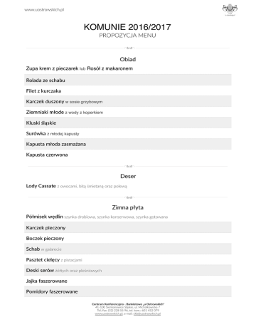 www.uostrowskich.pl KOMUNIE 2016/2017 PROPOZYCJA MENU Obiad Zupa krem z pieczarek lub Rosół z makaronem Rolada ze schabu Filet z kurczaka Karczek duszony w sosie grzybowym Ziemniaki młode z wody z koperkiem Kluski śląskie Surówka z młodej kapusty Kapusta młoda zasmażana Kapusta czerwona Deser Lody Cassate z owocami, bitą śmietaną oraz polewą Zimna płyta Półmisek wędlin szynka drobiowa, szynka konserwowa, szynka gotowana Karczek pieczony Boczek pieczony Schab w galarecie Pasztet cielęcy z pistacjami Deski serów żółtych oraz pleśniowych Jajka faszerowane Pomidory faszerowane Centrum Konferencyjno - Bankietowe „u Ostrowskich” 41-100 Siemianowice Śląskie, ul. Michałkowicka 7 Tel./fax: (32) 228 55 96, tel. kom.: 601 452 079 www.uostrowskich.pl, e-mail: [email protected] Tymbaliki drobiowe Śledź w śmietanie Śledź w zaprawie korzennej Rolmopsy Sałatki (do wyboru 2 rodzaje) Owoce Podawane na paterach Jabłka Banany Mandarynki Winogrona Owoce sezonowe Kolacja Barszcz czerwony z krokietem lub pasztecikami Dodatki Ogórki, papryka, pieczarki konserwowe, ćwikła z chrzanem, sosy zimne, chrzan, ketchup, paRsony, pieczywo, masło Napoje gorące Podawane bez ograniczeń Kawa rozpuszczalna z mlekiem do kawy Herbata z cytryną Centrum Konferencyjno - Bankietowe „u Ostrowskich” 41-100 Siemianowice Śląskie, ul. Michałkowicka 7 Tel./fax: (32) 228 55 96, tel. kom.: 601 452 079 www.uostrowskich.pl, e-mail: [email protected] Napoje zimne Podawane bez ograniczeń Napoje gazowane (Coca-Cola, Fanta, Sprite, Tonic, Kropla Beskidu) podawane w butelkach 1L Soki owocowe (jabłkowy, pomarańczowy, porzeczkowy) podawane w dzbankach 1L Woda niegazowana z cytryną i melisą podawana w dzbankach 1L MENU DO WŁASNEGO SKOMPONOWANIA Zupa (1 danie do wyboru) Rosół drobiowy z makaronem, marchewką i świeżo posiekaną natką pietruszki Zupa cebulowa z grzankami Zupa pieczarkowa z łazankami Zupa krem z pieczarek z groszkiem ptysiowym Zupa krem z porów z grzankami Zupa krem z selera Zupa krem z brokułów z płatkami migdałów Zupa pomidorowa Danie główne 2 porcje na osobę (3 dania do wyboru w proporcjach 100% - 50% - 50%) Rolada ze schabu w sosie pieprzowym Filet z kurczaka z bazylią i tymiankiem Karczek duszony z sosie grzybowym Udziec z indyka Centrum Konferencyjno - Bankietowe „u Ostrowskich” 41-100 Siemianowice Śląskie, ul. Michałkowicka 7 Tel./fax: (32) 228 55 96, tel. kom.: 601 452 079 www.uostrowskich.pl, e-mail: [email protected] Kotlet de volaille Kotlet „szwajcar” Kotlet faszerowany z pieczarkami ze schabu Schab z farszem grzybowo mięsnym Schab w sosie myśliwskim Rolada śląska wołowa Rolada drobiowa Rolada z polędwiczek wieprzowych Pieczeń wieprzowa w sosie pieczarkowym Pieczeń z karczku w sosie grzybowym Bioderko z kurczaka w sosie Dodatki do dania głównego (2 dania do wyboru) Kluski śląskie Ziemniaki z wody z koperkiem Kulki ryżowe Ziemniaki zapiekane Pure Ryż z warzywami Surówki oraz kapusty do dania głównego (3 dania do wyboru) Kapusta czerwona na ciepło Kapusta biała zasmażana z grzybami Surówka z białej kapusty Surówka z marchwi Surówka porowa Centrum Konferencyjno - Bankietowe „u Ostrowskich” 41-100 Siemianowice Śląskie, ul. Michałkowicka 7 Tel./fax: (32) 228 55 96, tel. kom.: 601 452 079 www.uostrowskich.pl, e-mail: [email protected] Surówka selerowa Warzywa z wody Buraczki lub inne wg. życzeń Klienta Desery Lody Cassate z owocami, bitą śmietaną oraz polewą Owoce Jabłka Banany Mandarynki Winogrona Owoce sezonowe Napoje zimne i gorące Podawane bez ograniczeń Kawa rozpuszczalna z mlekiem Herbata z cytryną Napoje gazowane (Coca-Cola, Fanta, Sprite, Tonic, Kropla Beskidu) Soki owocowce (jabłkowy, pomarańczowy, porzeczkowy) Woda niegazowana z cytryną i melisą II Dania Gorące - Kolacja (1 danie do wyboru) Barszcz czerwony z krokietem Barszcz czerwony z pasztecikami mięsnymi, grzybowymi lub kapuśniaczkami Beuf Strogonow Gulasz węgierski Centrum Konferencyjno - Bankietowe „u Ostrowskich” 41-100 Siemianowice Śląskie, ul. Michałkowicka 7 Tel./fax: (32) 228 55 96, tel. kom.: 601 452 079 www.uostrowskich.pl, e-mail: [email protected] Bogracz Bigos Frankfurterki płonące Szaszłyki drobiowe płonące Udko z kurczaka Żurek staropolski z jajkiem Kurczak w potrawce Flaki wołowe lub drobiowe Gulasz francuski Dodatki do kolacji Kolorowy ryż Pieczywo Ziemniaki zapiekane Kluski śląskie Ziemniaki z wody z koperkiem Frytki Zimna płyta Półmisek wędlin szynka drobiowa, szynka konserwowa, szynka gotowana Karczek pieczony Boczek pieczony Pasztet cielęcy z pistacjami Schab w galarecie Schab pieczony ze śliwkami i morelami Sztufada wołowa Kurczak faszerowany* Centrum Konferencyjno - Bankietowe „u Ostrowskich” 41-100 Siemianowice Śląskie, ul. Michałkowicka 7 Tel./fax: (32) 228 55 96, tel. kom.: 601 452 079 www.uostrowskich.pl, e-mail: [email protected] Ruloniki szynkowe w galarecie Deski serów żółtych oraz pleśniowych Jajka faszerowane Pomidory w sosie czosnkowym Pomidory z serem mozzarella Pomidory faszerowane Pałeczki drobiowe w sezamie Łosoś w galarecie (dzwonki lub całość) Ryba po grecku Tymbaliki drobiowe Śledź w śmietanie Śledź w zaprawie korzennej Rolmopsy Filet drobiowy z musem w galarecie Sałatki podawane z zimną płytą (2 dania do wyboru) Drobiowa Cymes Wiejska Jarzynowa Porowa Grecka Z kurczaka Tortelini Hawajska Wiosenna Centrum Konferencyjno - Bankietowe „u Ostrowskich” 41-100 Siemianowice Śląskie, ul. Michałkowicka 7 Tel./fax: (32) 228 55 96, tel. kom.: 601 452 079 www.uostrowskich.pl, e-mail: [email protected] Dodatki Ogórki, papryka, pieczarki, paRsony, kolby kukurydzy, cebulki konserwowe, grzyby marynowane, ćwikła z chrzanem, sosy zimne, pieczywo (różne rodzaje), masło *Wybrane potrawy dodatkowo płatne. Centrum Konferencyjno - Bankietowe „u Ostrowskich” 41-100 Siemianowice Śląskie, ul. Michałkowicka 7 Tel./fax: (32) 228 55 96, tel. kom.: 601 4