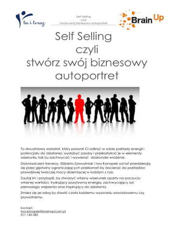 Self Selling czyli stwórz swój biznesowy autoportret Self Selling czyli stwórz swój biznesowy autoportret To dwudniowy warsztat, który pozwoli Ci odkryć w sobie pokłady energii i potencjału do działania; wydobyć zasoby i przekształcić je w elementy wizerunku tak by zachwycać i wywierać doskonale wrażenie. Doświadczeni trenerzy, Elżbieta Zawodniak i Iwo Konopek od lat przedzierają się przez gęstwiny ograniczających przekonań by docierać do pokładów prawdziwej twórczej mocy drzemiącej w każdym z nas. Zaufaj im i przybądź, by stworzyć własny wizerunek oparty na poczuciu własnej wartości, tryskający pozytywną energią, zachwycający od pierwszego wejrzenia oraz inspirujący do działania. Zmierz się ze sobą by stawić czoła każdemu wyzwaniu zawodowemu czy prywatnemu. Kontakt: Iwo.konopek@brainup/com.pl 511-145-585 Self Selling czyli stwórz swój biznesowy autoportret Obszary pracy na warsztacie: Storytelling w kreowaniu wizerunku Autodiagnoza mocnych stron i talentów Sięganie po własne zasoby Usuwanie barier i oporów wewnętrznych Określenie obszarów do dalszego rozwoju Dzięki warsztatowi: Poznasz znaczenie storytelling’u w kreowaniu własnego wizerunku Wydobędziesz swoje atuty i silne strony by móc inspirować i pociągać za sobą innych Zdobędziesz umiejętność nazywania barier i oporów by stawiać im czoło Nauczysz się diagnozować i precyzować obszary rozwoju osobistego Stworzysz swój własny, unikatowy, atrakcyjny wizerunek Gdzie? Jak? Kiedy? 29-30.05.2014r. godz. 9 - 17 Katowice, ul Hallera 18 Kontakt: [email protected]; 668-422-560 [email protected]; 511-145-585 Cena: 349zł netto Kontakt: Iwo.konopek@brainup/com.pl 511-145-585 Self Selling czyli stwórz swój biznesowy autoportret Elżbieta Zawodniak Coach, trener, licencjonowany superwizor umiejętności psychospołecznych oraz treningu interpersonalnego. Jest wierna podejściu holistycznemu, którego podstawowe założenie brzmi: „Każdy element świata ma pozytywne i negatywne strony. Dostrzegamy te i te, lecz budujemy na pozytywnych, a negatywne zamieniamy w pozytywne”. Jej ulubioną formą pracy jest prowadzenie treningów interpersonalnych i rozwojowych w nurcie coachingowym. Wspiera rozwój firm poprzez szkolenia pracowników z efektywnej obsługi klienta, motywacji i automotywacji, pracy zespołowej, twórczego rozwiązywania problemów, radzenia sobie z konfliktem, skutecznych metod radzenia sobie ze stresem, autoprezentacji czyli budowania profesjonalnego wizerunku, kierowania zespołem, wypalenia zawodowego, komunikacji relacyjnej, asertywnej i emocjonalnej oraz mobbingu. Kontakt: Iwo.konopek@brainup/com.pl 511-145-585 Self Selling czyli stwórz swój biznesowy autoportret Iwo Konopek Trener certyfikowany przez Polskie Towarzystwo Psychologiczne, coach, socjolog i pedagog. Absolwent Uniwersytetu Śląskiego w Katowicach, Politechniki Śląskiej w Gliwicach, Uniwersytetu Ekonomicznego w Katowicach oraz Akademii Trenerów Biznesu. Ponad 400 dni szkoleniowych w zakresie komunikacji interpersonalnej, rozwoju kompetencji społecznych, budowania zespołu, obsługi klienta, sprzedaży i innych umiejętności miękkich w biznesie. Kreator wizerunku, trener autoprezentacji. Doświadczenie biznesowe budował zaczynając od korporacji i firm sieciowych (Empik Sp. z o.o., Poczta Polska, Orange, Telbridge Sp. z o.o.), poprzez firmy sektora MŚP, na jednostkach sektora publicznego kończąc. Autor warsztatów rozwojowych wykorzystujących techniki parateatralne. Założyciel i lider kabaretu Pojutrze oraz teatru ulicznego Dialog. Współautor warsztatów teatru improwizacji dla trenerów. Prowokator i improwizator. Prywatnie pasjonat gotowania, teatru i żeglarstwa. Mistrz abstrakcyjnego, sarkastycznego humoru, podchwytliwych pytań i zagadek, kamiennej twarzy i mrugnięcia okiem. Kontakt: Iwo.konopek@brainup/com.pl 511-145-585