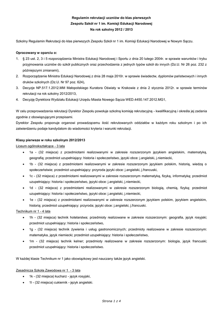 Regulamin rekrutacji uczniów do klas pierwszych Zespołu Szkół nr 1 im. Komisji Edukacji Narodowej Na rok szkolny 2012 / 2013 Szkolny Regulamin Rekrutacji do klas pierwszych Zespołu Szkół nr 1 im. Komisji Edukacji Narodowej w Nowym Sączu. Opracowany w oparciu o: 1. § 23 ust. 2, 3 i 5 rozporządzenia Ministra Edukacji Narodowej i Sportu z dnia 20 lutego 2004r. w sprawie warunków i trybu przyjmowania uczniów do szkół publicznych oraz przechodzenia z jednych typów szkół do innych (Dz.U. Nr 26 poz. 232 z późniejszymi zmianami), 2. Rozporządzenie Ministra Edukacji Narodowej z dnia 28 maja 2010r. w sprawie świadectw, dyplomów państwowych i innych druków szkolnych (Dz.U. Nr 97 poz. 624), 3. Decyzje NP.517.1.2012.MM Małopolskiego Kuratora Oświaty w Krakowie z dnia 2 stycznia 2012r. w sprawie terminów rekrutacji na rok szkolny 2012/2013, 4. Decyzję Dyrektora Wydziału Edukacji Urzędu Miasta Nowego Sącza WED.4450.147.2012.MG1, W celu przeprowadzenia rekrutacji Dyrektor Zespołu powołuje szkolną komisję rekrutacyjną - kwalifikacyjną i określa jej zadania zgodnie z obowiązującymi przepisami. Dyrektor Zespołu proponuje organowi prowadzącemu ilość rekrutowanych oddziałów w każdym roku szkolnym i po ich zatwierdzeniu podaje kandydatom do wiadomości kryteria i warunki rekrutacji. Klasy pierwsze w roku szkolnym 2012/2013 Liceum ogólnokształcące - 3 lata 1a - (32 miejsca) z przedmiotami realizowanymi w zakresie rozszerzonym językiem angielskim, matematyką, geografią; przedmiot uzupełniający: historia i społeczeństwo, języki obce: j.angielski, j.niemiecki, 1b - (32 miejsca) z przedmiotami realizowanymi w zakresie rozszerzonym językiem polskim, historią, wiedzą o społeczeństwie; przedmiot uzupełniający: przyroda języki obce: j.angielski, j.francuski, 1c - (32 miejsca) z przedmiotami realizowanymi w zakresie rozszerzonym matematyką, fizyką, informatyką; przedmiot uzupełniający: historia i społeczeństwo, języki obce: j.angielski, j.niemiecki, 1d - (32 miejsca) z przedmiotami realizowanymi w zakresie rozszerzonym biologią, chemią, fizyką; przedmiot uzupełniający: historia i społeczeństwo, języki obce: j.angielski, j.niemiecki, 1e - (32 miejsca) z przedmiotami realizowanymi w zakresie rozszerzonym językiem polskim, językiem angielskim, historią; przedmiot uzupełniający: przyroda; języki obce: j.angielski, j.francuski. Technikum nr 1 - 4 lata 1h - (32 miejsca) technik hotelarstwa; przedmioty realizowane w zakresie rozszerzonym: geografia, język rosyjski; przedmiot uzupełniający: historia i społeczeństwo, 1g - (32 miejsca) technik żywienia i usług gastronomicznych; przedmioty realizowane w zakresie rozszerzonym: matematyka, język niemiecki; przedmiot uzupełniający: historia i społeczeństwo, 1m - (32 miejsca) technik kelner; przedmioty realizowane w zakresie rozszerzonym: biologia, język francuski; przedmiot uzupełniający: historia i społeczeństwo. W każdej klasie Technikum nr 1 jako obowiązkowy jest nauczany także język angielski. Zasadnicza Szkoła Zawodowa nr 1 - 3 lata 1k - (32 miejsca) kucharz - język rosyjski, 1l - (32 miejsca) cukiernik - język angielski. Strona 1 z 4 KRYTERIA PRZYJMOWANIA UCZNIÓW KLAS PIERWSZYCH §1 O przyjęciu do klas pierwszych szkół średnich w Zespole Szkół nr 1 w Nowym Sączu decyduje łączna liczba punktów uzyskanych z: z wyników egzaminu gimnazjalnego - maksymalnie 100 punktów, z przeliczenia na punkty ocen na świadectwie ukończenia gimnazjum z języka polskiego i trzech wybranych obowiązkowych zajęć edukacyjnych oraz szczególne osiągnięcia ucznia wymienione w świadectwie ukończenia gimnazjum - 100 punktów. Razem 200 punktów. Podania uczniów, którzy uzyskali łącznie mniej niż: do V Liceum Ogólnokształcącego - 100 punktów; do Technikum nr 1 - 90 punktów; do Zasadniczej Szkoły Zawodowej nr 1 - 30 punktów nie będą rozpatrywane. W przypadku rekrutacji uzupełniającej próg punktowy może zostać obniżony. Podania uczniów, którzy powtarzają klasę pierwszą lub starają się o ponowne przyjęcie do klasy pierwszej (zmiana szkoły) w Zespole Szkól nr 1 będą rozpatrywane od 27 do 31 sierpnia 2012r. w ramach rekrutacji dodatkowej. Wspomagającymi kryteriami uwzględnianymi przy rozpatrywaniu podania będzie ocena z zachowania oraz opinia poprzedniego wychowawcy lub pedagoga szkolnego. §2 Kandydaci mogą dokonywać wyboru szkoły spośród wszystkich typów szkół w Zespole (V Liceum Ogólnokształcące, Technikum nr 1, Zasadnicza Szkoła Zawodowa nr 1) i ubiegać się o przyjęcie do różnych oddziałów zgodnie z listą preferencji. §3 1. Punkty przyznawane są za oceny z następujących przedmiotów: Liceum ogólnokształcące - 3 lata 1a j.polski, j.angielski, matematyka, geografia 1b j.polski, j.obcy, historia, geografia 1c j.polski, j.obcy, matematyka, fizyka 1d j.polski, j.obcy, biologia, chemia 1e j.polski, j.obcy, historia, geografia Technikum nr 1 - 4 lata 1h j.polski, j.obcy, matematyka, geografia 1g j.polski, j.obcy, matematyka, geografia 1m j.polski, j.obcy, matematyka, geografia Zasadnicza Szkoła Zawodowa nr 1 - 3 lata 2. 1k j.polski, j.obcy, matematyka, geografia 1l j.polski, j.obcy, matematyka, geografia Punkty obliczane są z języka polskiego i trzech wybranych zajęć edukacyjnych według następujących zasad: a) celujący 20 punktów b) bardzo dobry 18 punktów c) dobry 15 punktów d) dostateczny 10 punktów Strona 2 z 4 e) 3. dopuszczający 2 punkty Kandydatom zwolnionym z egzaminu gimnazjalnego, liczbę punktów uzyskanych z języka polskiego i trzech wybranych zajęć edukacyjnych do celów rekrutacji mnoży się przez dwa. 4. Za szczególne osiągnięcia wymienione na świadectwie ukończenia gimnazjum kandydat może uzyskać co najwyżej 20 punktów przy czym: a) za ukończenie gimnazjum z wyróżnieniem b) za udział w konkursach organizowanych przez kuratora oświaty: c) 5 punktów finalista konkursu ponadwoje