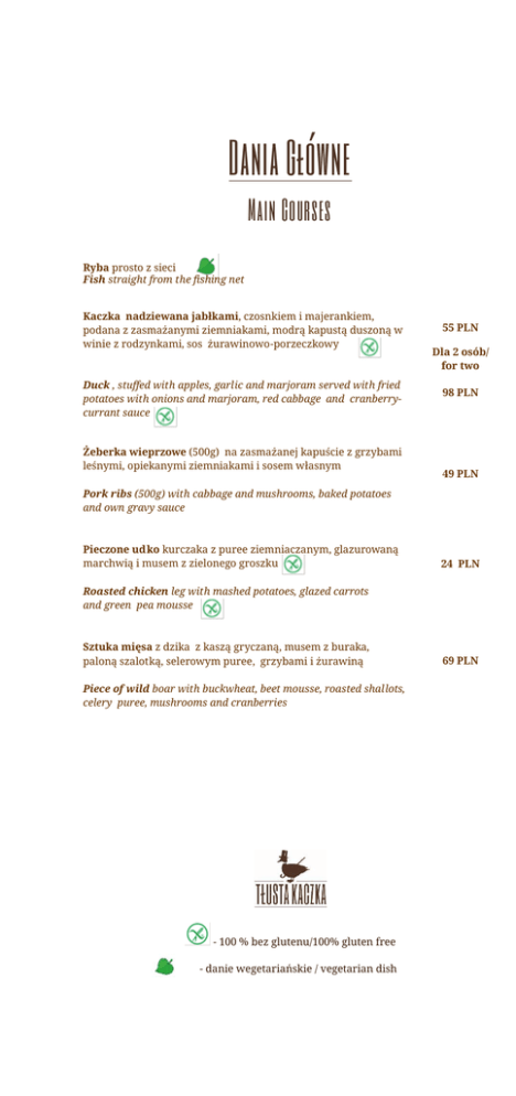 Dania Główne Main Courses Ryba prosto z sieci Fish straight from the fishing net Kaczka nadziewana jabłkami, czosnkiem i majerankiem, podana z zasmażanymi ziemniakami, modrą kapustą duszoną w winie z rodzynkami, sos żurawinowo-porzeczkowy Duck , stuffed with apples, garlic and marjoram served with fried potatoes with onions and marjoram, red cabbage and cranberrycurrant sauce Żeberka wieprzowe (500g) na zasmażanej kapuście z grzybami leśnymi, opiekanymi ziemniakami i sosem własnym 55 PLN Dla 2 osób/ for two 98 PLN 49 PLN Pork ribs (500g) with cabbage and mushrooms, baked potatoes and own gravy sauce Pieczone udko kurczaka z puree ziemniaczanym, glazurowaną marchwią i musem z zielonego groszku 24 PLN Roasted chicken leg with mashed potatoes, glazed carrots and green pea mousse Sztuka mięsa z dzika z kaszą gryczaną, musem z buraka, paloną szalotką, selerowym puree, grzybami i żurawiną Piece of wild boar with buckwheat, beet mousse, roasted shallots, celery puree, mushrooms and cranberries - 100 % bez glutenu/100% gluten free - danie wegetariańskie / vegetarian dish 69 PLN Dania Główne Main Courses Żeberka jagnięce z domowymi frytkami, brukselką na krótko, grillowanym pasternakiem i sosem rozmarynowym 72 PLN Lamb ribs with homemade fries, brussels, grilled parsnips and rosemary sauce Rumsztyk wołowy z puree ziemniaczanym, zasmażanymi buraczkami, pieczoną brukwią i kiszonymi ogórkami 28 PLN Beef rump steak with mashed potatoes, fried beets, roasted turnips and cucumber Stek z byka, z sosem pieprzowym z brandy i borowikami, frytkami stekowymi, selerem pieczonym w soli i jarmużem 82 PLN Bull steak with pepper sauce with brandy and mushrooms, homemade French fries, baked in salt celery and kale Krokiet gryczany z boczniakiem, blanszowanym jarmużem, cebulą szalotką, , marynowanymi kurkami i sosem z białego wina Buckwheat croquet with pleurotus, blanched kale, shallots, marinated chantrelle mushrooms and white wine sauce - 100 % bez glutenu/100% gluten free - danie wegetariańskie / vegetarian dish 22 PLN