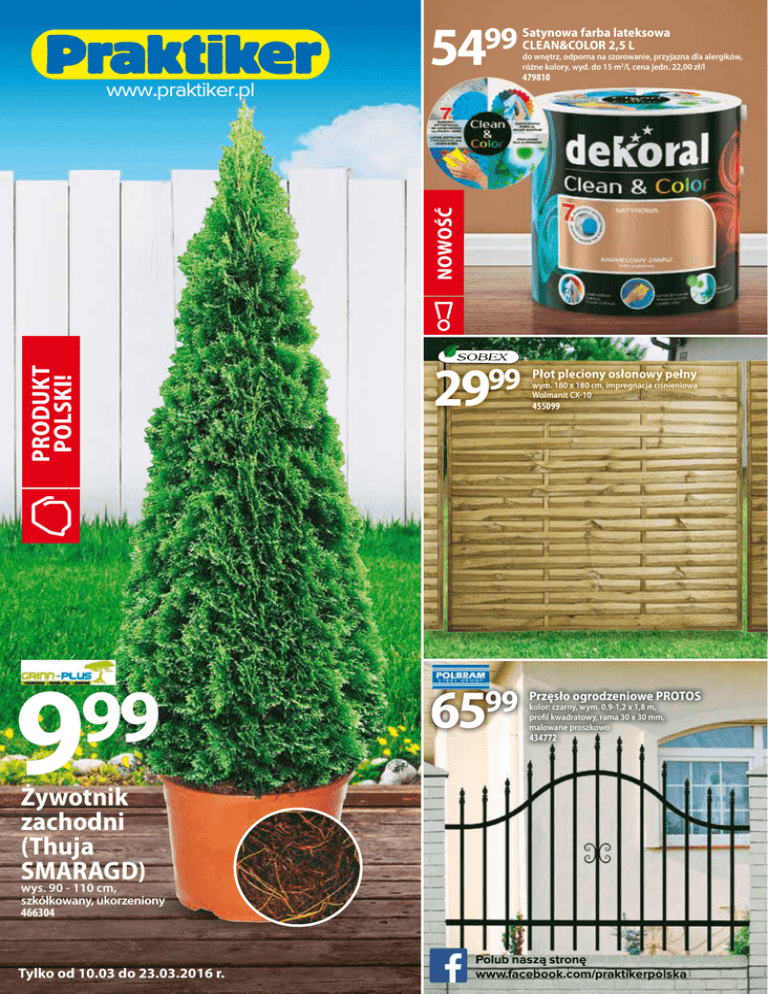 54 99 www.praktiker.pl 29 9 65 do wnętrz, odporna na szorowanie, przyjazna dla alergików, różne kolory, wyd. do 15 m2/l, cena jedn. 22,00 zł/l 479810 99 99 Satynowa farba lateksowa CLEAN&COLOR 2,5 L 99 Płot pleciony osłonowy pełny wym. 180 x 180 cm, impregnacja ciśnieniowa Wolmanit CX-10 455099 Przęsło ogrodzeniowe PROTOS kolor: czarny, wym. 0,9-1,2 x 1,8 m, profil kwadratowy, rama 30 x 30 mm, malowane proszkowo 434772 Żywotnik zachodni (Thuja SMARAGD) wys. 90 - 110 cm, szkółkowany, ukorzeniony 466304 Tylko od 10.03 do 23.03.2016 r. Polub naszą stronę www.facebook.com/praktikerpolska 7 99 4 99 17 2 412108 19 99 Róża wielkokwiatowa w balocie, różne rodzaje 287903 99 899 Nawóz do trawnika BIOPON 1 kg Nawóz do iglaków 100 dni 5 kg siatka 5 l cena jedn. 16,00 zł/kg 277512 202550 Żywotnik zachodni (Thuja OCC BRABANT) poj. donicy 3 l, wys. 80-100 cm, szkółkowany, ukorzeniony Dla zaradnych 173526 7999 Jabłonie w odmianach 443306 Nawóz do trawnika 100 dni 1 kg 1899 21 99 Wierzba IWA poj. donicy 5 l, wys. 120 cm 277543 8999 Nawóz uniwersalny AZOFOSKA 3 kg Mieszanka MURAWA SPORTOWA 5 kg 455624 276956 cena jedn. 7,33 zł/kg cena jedn. 18,00 zł/kg Warszawa (Ząbki) M1 – CH Marki, ul. Radzymińska 303; Warszawa (Janki) Park Handlowy Janki, plac Szwedzki 4; Bytom M1 – CH, ul. Strzelców Bytomskich 96; Czeladź M1 – CH, ul. Będzińska 80; Częstochowa M1 – CH, ul. Kisielewskiego 8/16; Gdańsk, ul. Kołobrzeska 26; Grudziądz, ul. Konarskiego 47; Katowice, ul. Górnośląska 57; Kielce, ul. Radomska 8; Kraków M1 – CH, al. Pokoju 67; Leszno, al. Konstytucji 3 Maja 12; Lublin, ul. Mełgiewska 2c; 6999 Taczka ogrodowa 65 l + grabie 470496 4299 7 99 Panel ogrodzeniowy ocynkowany kolor: zielony, wym. 2,5 x 1,52 m, oczko 75 x 200 mm, drut o ø 3,2 mm 99 454616 49 99 Sekator ogrodowy 272654 99 Kompostownik EKO 320 l wym. 65 x 65 x 75 cm 481659 Aluminiowy sekator dwuręczny dł. rękojeści 46 cm 438776 99,119,499 CENA Z KARTĄ KLUBU PRAKTIKER Siekiera rozłupująca dł. 70 cm, waga 1550 g, rękojeść z włókna szklanego 472504 Płotek trawnikowy rollborder z łukiem wym. 4,5 x 17 x 120 cm, impregnacja ciśnieniowa Wolmanit CX-10 290724 599 Podest ryflowany wym. 50 x 50 cm 1499 749,Szpadel prosty z drewnianym trzonkiem 427045/460947 Domek działkowy SUZI wym. 200 x 122 x 168 cm, impregnacja ciśnieniowa Wolmanit CX-10 409437 477665 7 99 Deska tarasowa wym. 19 x 90 x 2400 mm 477655 Łódź M1 – CH, ul. Brzezińska 27/29; Łódź, ul. Wieniawskiego 1/3; Olsztyn, al. gen. Sikorskiego 2b; Opole Turawa Park – CH, ul. Dębowa 1; Piła, ul. 500-lecia Piły 5; Poznań M1 – CH, ul. Szwajcarska 14; Poznań CH Galeria Pestka, al. Solidarności 47; Radom M1 – CH, al. Grzecznarowskiego 28; Rybnik, ul. Żorska 16; Rzeszów, ul. Podkarpacka 4; Wrocław, ul. Krakowska 63/69; Zabrze M1 – CH, ul. Plutonowego R. Szkubacza 1 3 289,799,- Pilarka elektryczna OREGON moc 2400 W, dł. prowadnicy 40 cm 456105 299,- Glebogryzarka spalinowa Pilarka spalinowa moc 2,7 KM, poj. silnika 45 cm3, dł. prowadnicy 40 cm 433747 1699,- moc 5 KM, poj. silnika 139 cm3, szer. robocza 36-60 cm, 1 bieg 475496 Glebogryzarka TEXAS POWERLINE moc 5 KM, poj. silnika 179 cm3, szer. robocza 35-55-86 cm, głębokość robocza 33 cm 475586 349,Kosa spalinowa moc 2,04 KM, poj. silnika 51,7 cm3, w kpl.: szelki i głowica z żyłką 455739 799,899,- 349,- CENA Z KARTĄ KLUBU PRAKTIKER Kosiarka elektryczna moc 1600 W, szer. robocza 38 cm, wys. koszenia 25-65 mm, poj. kosza 45 l 433719 Kosiarka spalinowa z napędem, poj. silnika 139 cm3, szer. robocza 46 cm, poj. kosza 60 l, koła łożyskowane, centralna regulacja koszenia 475570 295,4 Aerator + wertykulator (2 w 1) moc 1400 W, szer. robocza 32 cm, poj. kosza 35 l, centralna regulacja wys. 475417 KREDYT nawet do 36 0% rat 1499,- Kosiarka spalinowa silnik SUBARU, moc 5,5 KM, poj. silnika 189 cm3,, szer. robocza 55 cm, korpus stalowy, poj. kosza 70 l, koła łożyskowane, centralna regulacja koszenia 456070 W ramach Umowy kredytu ratalnego i umowy o limit kredytowy i o kartę kredytową zbliżeniową MasterCard RRSO dla całkowitej kwoty kredytu ratalnego w wysokości 1725 zł, dla 36 rat w kwocie 47,92 zł każda, wynosi 0%. Całkowita kwota do zapłaty wynosi 1725 zł RRSO dla całkowitej kwoty kredytu w karcie kredytowej na www.sygmabank.pl. Stan na dzień 07.01.2016 r. Szczegóły i czas trwania oferty w Regulaminie Promocji “Kredyt 36x0%-Praktiker”dostępny w Placówce Sygma Bank Polska S.A. i na www.sygmabank.pl Sygma Bank Polska S.A. ul.Suwak 3, 02-676 Warszawa 139,- Wiertarka udarowa moc 1100 W, obroty 0-2700/min, uchwyt wiertarski szybkomocujący, przewód zasilający 3 m, w kpl.: walizka 479230 189,- 199,- Młotowiertarka Wiertarkowkrętarka moc 800 W, maks. energia udaru 2,9 J (liczona w EPTA 2,5 J), udar 0-4500 min, obroty 0-1500/min, maks. ø wiercenia w betonie 26 mm, waga 2,6 kg, w kpl.: walizka napięcie 18 V, 2 akumulatory, 2 biegi, obroty 350/1100 min, maks. moment obrotowy 30 Nm, ładowanie 1 h, w kpl.: walizka 456956 467344 CENA Z KARTĄ KLUBU PRAKTIKER Szlifierka kątowa moc 730 W, obroty 11000/min, ø tarczy 125 mm 475495 Wyrzynarka moc 500 W, prędkość skokowa 500-3000/min, 6-stopniowa regulacja prędkości, regulacja podcinania, przewód zasilający 3 m 480314 229,- Urządzenie do mycia okien WV CLASSIC zasilanie bezprzewodowe, akumulator 3,6 V Li-Ion, wyd. powierzchniowa na 1 ładowanie: ok. 60 m2 = 20 okien, czas ładowania 120 min, czas pracy ciągłej 20 min, szer. ssawki 280 mm, ciężar z akumulatorem 0,7 kg, w kpl.: butelka ze spryskiwaczem wyposażona w pad z mikrofibry + 20 ml środka do mycia okien 457407 499,- 479,- 74 99 279,- 179,- Urządzenie wielofunkcyjne moc 180 W, ilość oscylacji 20000 min-1, do cięcia, szlifowania, skrobania drewna, metalu, ceramiki itp., system odprowadzania pyłu z możliwością odłączenia, w kpl.: walizka 398156 Urządzenie parowe moc 1500 W, zasilanie 230 V, maks. ciśnienie 3,5-4 barów, 
