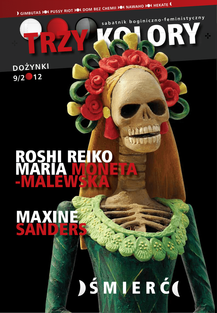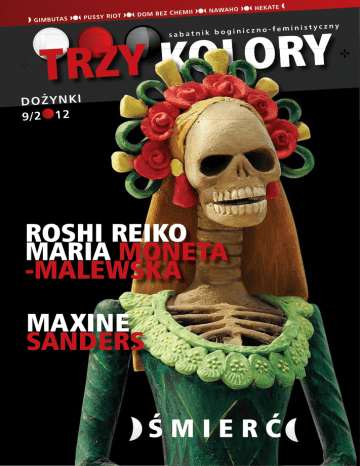 GI M BU TA S PU SS Y RI OT II DO M BE Z CH EM NA W AH O HE KATE iniczno-f sabatnik bog eministyczny Y R O L O TRZY K DOŻYNKI 9 /2 1 2 ROSHI REIKO MARIA MONETA -MALEWSKA MAXINE SANDERS ŚMIERĆ spis rzeczy pochwalona Śmierć nikogo nie pomija wstępniak pisze Ewa Bury – str. 3 z kotła Między bezruchem a ruchem o książce Morgany Poza miotłą pisze Ewa Bury – str. 4 słowo W poszukiwaniu prawdziwej tożsamości wywiad z roshi Reiko Marią Monetą-Malewską – str. 6 Królowa Czarownic wywiad z Maxine Sanders – str. 20 bogini Hekate. Światło w ciemności o bogini śmierci pisze Agnieszka Kraska – str. 26 mikrokosmos Śmierć – moje marzenie o śmierci pisze Maria Ela Lewańska – str. 32 czarna Santa Muerte o Świętej Śmierci pisze Katarzyna „3Jane” Olszewska – str. 34 Memento Mori o barokowej fascynacji śmiercią pisze Agnieszka Kraska – str. 40 Złowieszcze zwierzęta o zwierzętach chtonicznych pisze Enenna – str. 44 Śmierć jako sprzymierzeńczyni o śmierci pisze Agnieszka Kramm – str. 46 „Żyję w nadziei, że mogę skoczyć... o eutanazji pisze Tamara Jurewicz – str. 51 „Saul porwał miecz i upadł nań” o możliwości wyboru śmierci pisze Magdalena Piekara – str. 52 Prawo do eutanazji w praktyce o praktykowaniu eutanazji pisze Mijke van der Drift – str. 54 W obliczu Śmierci Miłość świeci jaśniej o śmierci szamańskiej pisze Tanna Jakubowicz-Mount – str. 56 na okładce: La Catarina – postać z meksykańskiej kultury ludowej, spopularyzowana przez José Guadalupe Posadę. Jest to szkielet kobiety z wyższej klasy, jedna z najpopularniejszych figurek związanych z obchodami Święta Śmierci. Foto: Tomas Castelazo. źródło: http://commons.wikimedia.org/wiki/File:Catrinas_2.jpg?uselang=pl Prosta historia śmierć taty wspomina Grażyna – str. 63 Choroba i śmierć o śmierci mamy pisze Agnieszka Matyszewska – str. 66 *** poezja Agnieszki Mędrek – str. 68 Kilka słów o śmierci o śmierci pisze Anna Zielińska – str. 70 Wszystkie kolory śmierci o śmierci pisze Dagny Agasz – str. 72 Neofitka o umieraniu opowiada Iwona Jędrusik – str. 74 *** o śmierci babci i koty pisze Iza Desperak – str. 76 Patrząc w słońce o spojrzeniu w twarz śmierci pisze Iza Jąderek – str. 78 *** o śmierci mamy opowiada Małgorzata Hołubowska – str. 80 W twym początku jest mój kres o śmierci w kontekście macierzyństwa pisze Marta Niedźwiecka – str. 82 *** wiersze Sylwii Ewy Paszko – str. 84 Snem było życie o świeckim pogrzebie pisze Lidia Barc – str. 86 Urwane tory o cmentarzu w Sewilli pisze Iwona Jędrusik – str. 88 Śmierć i dziewczyna o nekrofilii pisze Aga Dellfina Dellert – str. 90 Droga o duchach pisze Patrycja Niagara – str. 92 Matka Aya o Ayahuasce jako doświadczeniu śmierci pisze Patrycja Kowalska – str. 94 Urwane tory o cmentarzu w Sewilli pisze Iwona Jędrusik – str. xx Bez narodzin, bez śmierci o buddyjskim spojrzeniu na śmierć pisze Alek Kowalski – str. 98 Zgroza nagłych cisz o turpizmie pisze Monika Chmielewska – str. 108 przodkini Znaki spoza czasu o Mariji Gimbutas pisze Sebastian Kotlarz – str. 110 Fakt Pussy! Riot! o karze dla rosyjskich feministek pisze Lidia Barc – str. 114 kolektyw Sa’ah naaghái bik’éh hózhó o narodzie Nawaho pisze Ewa Bury – str. 116 ekoeko Dom bez chemii? o ekologicznych środkach czystości pisze Maria Ela Lewańska – str. 118 na miotle Na szlakach herezji śladami katarów podąża Barbara Srebro-Fila – str. 120 Rytuał oczyszczania negatywności o rytuale Hekate pisze Agnieszka Kraska – str. 123 gędźba Śmierć. Ze zmęczenia bajkę pisze Agnieszka Weseli/Furja – str. 124 zielna Niezapominajki o kwiatkach z bajki pisze Iza Kasia Zalewska-Kantek – str. 126 Kara za niewinność o wycinaniu alei drzew pisze Iza Kasia Zalewska-Kantek – str. 128 z kotła recenzje książek piszą Monika Czaplicka, Agnieszka Weseli/Furja, Ewa Bury, Enenna, Agnieszka Kraska, Iza-Kasia Zalewska-Kantek i Maria Ela Lewańska – str. 130 gotuj się Stołeczek dla Niej gotuje Katarzyna Rączka – str. 149 śpiewajmy Pani! Kali – str. 149 Kontakt ISSN: 2084-2805 „Trzy Kolory” działają niekomercyjnie. Nie stoi za nami żadna korporacja, kościół, firma ani organizacja. Nie otrzymujemy żadnych grantów ani dotacji. Nasza duchowość i idea nie stanowią przedmiotów ekonomicznych transakcji. Dzielimy się nimi. Niemniej jednak, jeśli zechcesz nas wesprzeć, wpłać dowolną kwotę na konto: ING Bank Śląski: 05 1050 1793 1000 0022 3968 4711, z dopiskiem „trzy kolory”. Z góry dziękujemy. Nie jest wykluczone, że w przyszłości wystąpimy o grant lub dotację. [email protected] Wydawczynie „Trzy Kolory” wydaje zespół wydawczyń w składzie: Ewa Bury, Agnieszka Kraska, Agnieszka Weseli, z siedzibą w Warszawie. pochwalona! (Y) a j i m o p e i n o g o k i n ć Śmier ę, rz e je m y si sk a li . S ta ro ik czy e m i rz m a k ro si ą g a ją j k re s. W ta . K re s o ó ę rz . sw e ie a n w z M z c o li ty nam ń c z y. sy st e m y p k ie d y ś k o z ą b li sk ie d ę ją o a si h d c o ę a d k p si o st u y, n ia W sz y ę z w ią z k i, łe o lb rz y m z ie ń z a m ie k o ń c z ą si ją ja k o b ia n ie b y t – d a w wcza w y ę ry ż si o o u m ie ra m y, g ją sp o a rt o ść ż o d d a la w w ia z d y d , ie g n ie – w in z ie ró d lk j go w ie z e c y k le w k o le jn e ą. w y, k ró ts o, z in a k o n a d o M a łe sp ra tę k o ń c o w g a , d , c o u m a rł ń e ją si o je sw w a m a si ę , a to to z e la d ż , , k c ra ty ta o d to n o w is , w we e sz ło jo g u rt ó d z ą si ę n o To , c o o d . ro a ż n ią n c ie w ją m I st a e rg ii . a je n ie z wych pow , p e łe n e n n a p o z o st ji su p e rn o z ywego lo ż e , m ło d e ż Ty lk o z m ia ie sp z k e ra św b – i z im , w znów so b ie o k ę w ro si k ie si m ia o n ją w i ia p o ja z ie m ja śn re ja k o ta io sn y ro z ż y 