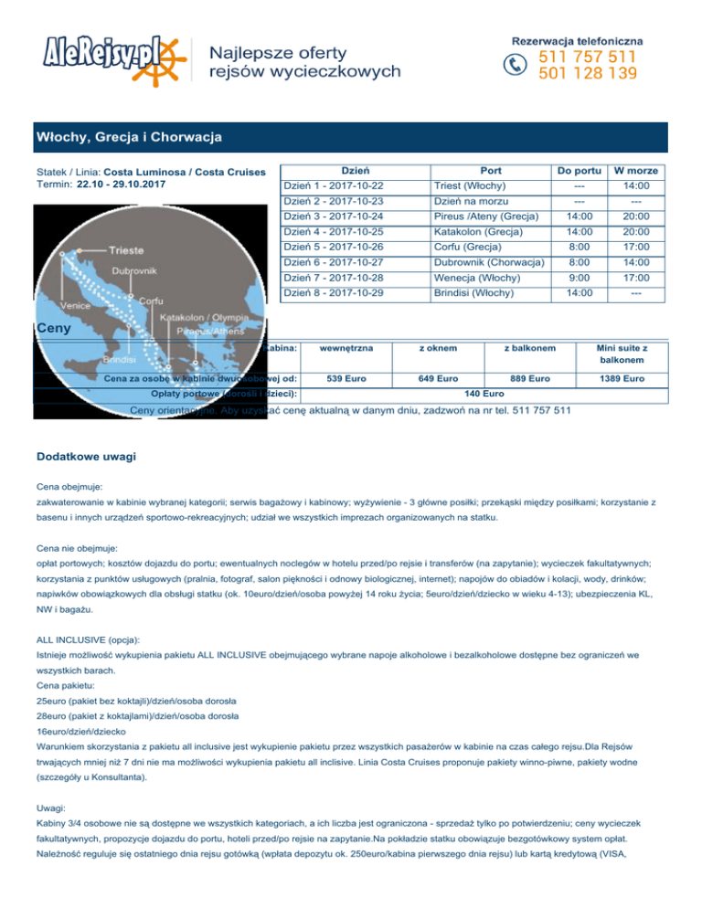 Włochy, Grecja i Chorwacja Statek / Linia: Costa Luminosa / Costa Cruises Termin: 22.10 - 29.10.2017 Dzień Port Do portu W morze --- 14:00 Dzień 1 - 2017-10-22 Triest (Włochy) Dzień 2 - 2017-10-23 Dzień na morzu --- --- Dzień 3 - 2017-10-24 Pireus /Ateny (Grecja) 14:00 20:00 Dzień 4 - 2017-10-25 Katakolon (Grecja) 14:00 20:00 Dzień 5 - 2017-10-26 Corfu (Grecja) 8:00 17:00 Dzień 6 - 2017-10-27 Dubrownik (Chorwacja) 8:00 14:00 Dzień 7 - 2017-10-28 Wenecja (Włochy) 9:00 17:00 Dzień 8 - 2017-10-29 Brindisi (Włochy) 14:00 --- Ceny Kabina: Cena za osobę w kabinie dwuosobowej od: Opłaty portowe (dorośli i dzieci): wewnętrzna z oknem z balkonem Mini suite z balkonem 539 Euro 649 Euro 889 Euro 1389 Euro 140 Euro Ceny orientacyjne. Aby uzyskać cenę aktualną w danym dniu, zadzwoń na nr tel. 511 757 511 Dodatkowe uwagi Cena obejmuje: zakwaterowanie w kabinie wybranej kategorii; serwis bagażowy i kabinowy; wyżywienie - 3 główne posiłki; przekąski między posiłkami; korzystanie z basenu i innych urządzeń sportowo-rekreacyjnych; udział we wszystkich imprezach organizowanych na statku. Cena nie obejmuje: opłat portowych; kosztów dojazdu do portu; ewentualnych noclegów w hotelu przed/po rejsie i transferów (na zapytanie); wycieczek fakultatywnych; korzystania z punktów usługowych (pralnia, fotograf, salon piękności i odnowy biologicznej, internet); napojów do obiadów i kolacji, wody, drinków; napiwków obowiązkowych dla obsługi statku (ok. 10euro/dzień/osoba powyżej 14 roku życia; 5euro/dzień/dziecko w wieku 4-13); ubezpieczenia KL, NW i bagażu. ALL INCLUSIVE (opcja): Istnieje możliwość wykupienia pakietu ALL INCLUSIVE obejmującego wybrane napoje alkoholowe i bezalkoholowe dostępne bez ograniczeń we wszystkich barach. Cena pakietu: 25euro (pakiet bez koktajli)/dzień/osoba dorosła 28euro (pakiet z koktajlami)/dzień/osoba dorosła 16euro/dzień/dziecko Warunkiem skorzystania z pakietu all inclusive jest wykupienie pakietu przez wszystkich pasażerów w kabinie na czas całego rejsu.Dla Rejsów trwających mniej niż 7 dni nie ma możliwości wykupienia pakietu all inclisive. Linia Costa Cruises proponuje pakiety winno-piwne, pakiety wodne (szczegóły u Konsultanta). Uwagi: Kabiny 3/4 osobowe nie są dostępne we wszystkich kategoriach, a ich liczba jest ograniczona - sprzedaż tylko po potwierdzeniu; ceny wycieczek fakultatywnych, propozycje dojazdu do portu, hoteli przed/po rejsie na zapytanie.Na pokładzie statku obowiązuje bezgotówkowy system opłat. Należność reguluje się ostatniego dnia rejsu gotówką (wpłata depozytu ok. 250euro/kabina pierwszego dnia rejsu) lub kartą kredytową (VISA, Mastercard, American Express) na podstawie zbiorczego rachunku. Karty kredytowe należy zarejestrować zaraz po zaokrętowaniu. Costa Luminosa Costa Luminosa Tonaż: 92.600 ton Rok budowy 2009 Długość: 294 m Szerokość: 32,25 m Szybkość: 21,6 węzła Pokłady pasażerskie: 12 Pasażerowie: max. 2.828 Basen: 2, w tym jeden z rozsuwanym dachem (4 jacuzzi) Waluta: EURO Do dyspozycji: 4 restauracje, w tym Club Luminosa i restauracja Samsara dostępne tylko na rezerwacje, 11 barów (w tym Cigar Lounge i kawiarnia), kasyno, teatr na 3 pokładach, dyskoteka, salon odnowy biologicznej "Samsara Spa" znajdujący się na 2 pokładach (3.500m²), sauna, sala gimnastyczna, fitness center, salon piękności, kort tenisowy, symulator formuły 1, trasa do joggingu, biblioteka, kawiarenka internetowa, kino 4D, pokój zabaw dla dzieci, punkt medyczny, butiki, ogromny ekran na pokładzie z basenem. Kabiny: 1.130 kabin wyposażonych w łazienkę (prysznic, wc, suszarka), klimatyzację, telefon, sejf, mini bar, telewizję satelitarną, radio pokładowe. 56 kabin posiada bezpośredni dostęp do spa, 718 prywatny balkon. Na statku znajdują się 44 kabiny typu suite (wszystkie z balkonami), a 4 z nich ma bezpośredni dostęp do spa. Costa Luminosa dysponuje również kabinami, które są przystosowane dla osób niepełnosprawnych. Room Service dostępny 24h na dobę.