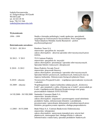 Izabela Kaczanowska ul. Żeligowskiego 50/52m46 90-644 Łódź tel. 42 652 49 30 kom. 796 512 366 [email protected] Wykształcenie 1994 - 1999 Studia o kierunku politologia i nauki społeczne, specjalność socjologia na Uniwersytecie Szczecińskim. Praca magisterska "Indywidualizm Michała Anioła Buonarroti - portret psychosocjologiczny" Doświadczenie zawodowe VI 2013 – III 2014 Rainbow Tours S.A. stanowisko: specjalista ds. turystyki zakres obowiązków: aktywna sprzedaż ofert turystycznych przez telefon. XI 2012 – V 2013 TUI Centrum Podróży stanowisko: specjalista ds. turystyki zakres obowiązków: prezentacja i sprzedaż ofert turystycznych. Sprzedaż biletów lotniczych i ubezpieczeń X 2010 – X 2012 Biuro Podróży Nevada Travel stanowisko: pracownik biurowy zakres obowiązków: prezentacja i sprzedaż ofert turystycznych. Sprzedaż biletów promowych, autobusowych, lotniczych oraz na imprezy kulturalne. Dokonywanie bieżących płatności biura X.2010 – obecnie Towarzystwo Przyjaciół Łodzi – współpraca (prowadzenie wycieczek i szkoleń) IX.2009 – obecnie Współorganizator imprez kulturalno-edukacyjnych: „Kolorowa Łódź”, gier miejskich z cyklu „Orientuj się w Łodzi”, przewodnik po Łodzi, współpracownik Muzeum Rozproszonego oraz grupy przewodników łódzkich TOTUTOTAM 14.VII.2008 - 30.VIII.2008 Santander Consumer Bank S.A. stanowisko: doradca klienta zakres obowiązków: znajomość i przestrzeganie zasad udzielania produktów banku, informowanie klientów o produktach, przyjmowanie i sprawdzanie dokumentów przedstawianych przez klientów, przygotowywanie raportów, obsługa posprzedażowa 1.I.2003 - 30.VI.2008 Bank Pekao S.A. Centrum Bankowości Elektronicznej stanowisko: teleoperator zakres obowiązków: autoryzacja transakcji przy użyciu kart płatniczych, zastrzeganie kart, obsługa klienta w zakresie informowania o stanie karty, sprzedaż produktów bankowych 25.IX.2005 11.X.2002 - 24.X.2002 15.X.1999 - 31.VIII.2002 1.IV.1996 - 30.VI.1998 Obwodowa Komisja Wyborcza nr 17 w Łodzi, stanowisko: ● Zastępca przewodniczącego w wyborach do Sejmu i Senatu RP BRE Bank Centrum Rozliczeniowe (zlecenie) Praca w Biurze Rozwoju Regionalnego podlegającego kolejno pod: ● Rządowe Centrum Studiów Strategicznych ● Ministerstwo Rozwoju Regionalnego i Budownictwa ● Ministerstwo Gospodarki stanowisko: podreferendarz zakres obowiązków: zbieranie i analiza danych statystycznych, sporządzanie raportów o sytuacji społeczno-ekonomicznej regionu, opracowywanie tematów z zakresu studiów regionalnych, obsługa Biura, obserwacja rozwoju programu Agenda 21 w gminach Sklep Muzyczny "Music Shop" w Gryfinie stanowisko ekspedientka zakres obowiązków: sprzedaż produktów (płyt i kaset) Szkolenia 1998 International Summer School in Political Science and International Relations zorganizowaną przez Fundację im. S. Batorego. 2001 Kurs podstawowy w zakresie obsługi programu Crystal Report 2003 Obsługa klientów przez telefon w ruchu przychodzącym 2006 Szkolenia w ramach projektu "Nowa Wiedza szansą na Twój rozwój i sukces" zorganizowane przez Pozaszkolny Ośrodek Kształcenia Zawodowego "System" sc: ● Praktyczna wiedza o możliwościach pozyskiwania środków finansowych z funduszy Unii Europejskiej ● Prawo zamówień publicznych w kontekście realizacji projektów Unii Europejskiej 2008 - 2009 Kurs przewodnicki po mieście Łodzi Dodatkowe informacje Znajomość języków obcych: Język angielski w mowie i w piśmie - stopień dobry Umiejętności: Obsługa komputera (Word, Excel, Internet, poczta elektroniczna) i innych urządzeń biurowych Obsługa programów: MerlinX, Sykon, S.A.R.T, BlueVendo, Travella Zainteresowania: Prace z dziedziny socjologii, książki o Łodzi, sztuka Renesansu, ortografia, koncerty rockowe Wyrażam zgodę na przetwarzanie moich danych osobowych zawartych w ofercie pracy dla potrzeb procesu rekrutacji zgodnie z ustawą z dnia 27.08.1997r. Dz. U. z 2002 r., Nr 101, poz. 923 ze zm.