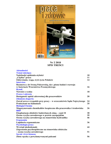 Nr 2 2010 SPIS TREŚCI Aktualności Temat miesiąca Nadchodzi epidemia otyłości „Ciężka” praca Odżywianie, waga, tryb życia Polaków Interview Rozmowa z dr Iwoną Palczewską, dyr. pionu badań i rozwoju w Instytucie Wzornictwa Przemysłowego Rynek Nowości z rynku Prawo i zdrowie Dostępność opieki zdrowotnej dla pracowników Zdaniem eksperta Zawał serca a wypadek przy pracy – w orzecznictwie Sądu Najwyższego Praktykant na badaniach Biologia/Chemia Magazynowanie chemikaliów bezpieczne dla pracownika i środowiska BHP Eksploatacja obiektów budowlanych zimą – część II Ocena ryzyka zawodowego w prawie europejskim Ocena ryzyka zawodowego na stanowisku hydraulika Ergonomia Lapidaria ergonomiczne Psychologia pracy Wywiad niedoskonały Zagrożenia psychospołeczne na stanowisku elektryka – ocena ryzyka zawodowego Savoir vivre biznesu Złota rączka z powyłamywanymi palcami 10 11 14 16 18 20 24 35 26 30 39 46 36 44 51 56