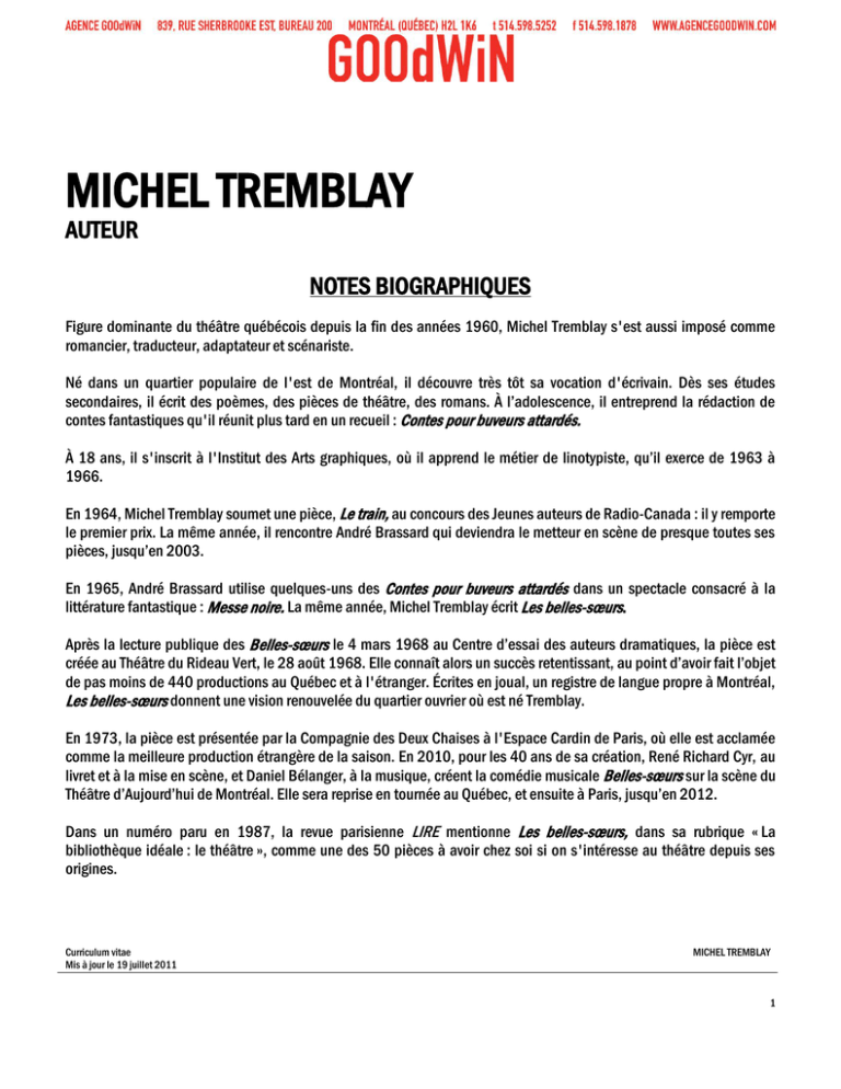 MICHEL TREMBLAY AUTEUR NOTES BIOGRAPHIQUES Figure dominante du théâtre québécois depuis la fin des années 1960, Michel Tremblay s'est aussi imposé comme romancier, traducteur, adaptateur et scénariste. Né dans un quartier populaire de l'est de Montréal, il découvre très tôt sa vocation d'écrivain. Dès ses études secondaires, il écrit des poèmes, des pièces de théâtre, des romans. À l’adolescence, il entreprend la rédaction de contes fantastiques qu'il réunit plus tard en un recueil : Contes pour buveurs attardés. À 18 ans, il s'inscrit à l'Institut des Arts graphiques, où il apprend le métier de linotypiste, qu’il exerce de 1963 à 1966. En 1964, Michel Tremblay soumet une pièce, Le train, au concours des Jeunes auteurs de Radio-Canada : il y remporte le premier prix. La même année, il rencontre André Brassard qui deviendra le metteur en scène de presque toutes ses pièces, jusqu’en 2003. En 1965, André Brassard utilise quelques-uns des Contes pour buveurs attardés dans un spectacle consacré à la littérature fantastique : Messe noire. La même année, Michel Tremblay écrit Les belles-sœurs. Après la lecture publique des Belles-sœurs le 4 mars 1968 au Centre d’essai des auteurs dramatiques, la pièce est créée au Théâtre du Rideau Vert, le 28 août 1968. Elle connaît alors un succès retentissant, au point d’avoir fait l’objet de pas moins de 440 productions au Québec et à l'étranger. Écrites en joual, un registre de langue propre à Montréal, Les belles-sœurs donnent une vision renouvelée du quartier ouvrier où est né Tremblay. En 1973, la pièce est présentée par la Compagnie des Deux Chaises à l'Espace Cardin de Paris, où elle est acclamée comme la meilleure production étrangère de la saison. En 2010, pour les 40 ans de sa création, René Richard Cyr, au livret et à la mise en scène, et Daniel Bélanger, à la musique, créent la comédie musicale Belles-sœurs sur la scène du Théâtre d’Aujourd’hui de Montréal. Elle sera reprise en tournée au Québec, et ensuite à Paris, jusqu’en 2012. Dans un numéro paru en 1987, la revue parisienne LIRE mentionne Les belles-sœurs, dans sa rubrique « La bibliothèque idéale : le théâtre », comme une des 50 pièces à avoir chez soi si on s'intéresse au théâtre depuis ses origines. Curriculum vitae Mis à jour le 19 juillet 2011 MICHEL TREMBLAY 1 Dix autres pièces suivront entre 1968 et 1977 et seront connues sous le titre Le cycle des Belles-sœurs. Font partie de ce cycle quelques-unes des œuvres les plus prisées de Michel Tremblay, dont À toi, pour toujours, ta Marie-Lou, créée en 1971, et Bonjour, là, bonjour, en 1974. En 1972, Michel Tremblay et André Brassard abordent le cinéma avec un court métrage, Françoise Durocher, waitress qui leur vaut trois prix « Genie » à Toronto. Tremblay signe la même année son premier scénario de long métrage, Il était une fois dans l'est. Le film, réalisé par André Brassard en 1973, représente le Canada au festival de Cannes et à celui de Chicago, en 1974. Un autre long métrage de Tremblay et Brassard, Le soleil se lève en retard , est produit en 1976. À partir de 1978, Michel Tremblay se consacre à une œuvre romanesque de grande envergure, Les chroniques du Plateau Mont-Royal. Amorcées avec La grosse femme d’à côté est enceinte, les Chroniques sont constituées de six tomes portant sur une famille du Plateau Mont-Royal, dont l’aboutissement est Un objet de beauté, paru en 1997. En 2000, les éditions Leméac/Actes Sud regroupent l’ensemble dans Les chroniques du Plateau Mont-Royal Ŕ Thesaurus. Malgré cet intermède occupé à l’écriture romanesque, il n’en continue pas moins à écrire avec régularité pour le théâtre. En 1984, puis en 1987, le Centre national des Arts d’Ottawa et le Théâtre du Rideau Vert de Montréal créent, en co-production, Albertine, en cinq temps et Le vrai monde?, qui figurent parmi les pièces les plus importantes de son répertoire. En 1986, il fait paraître un roman au caractère plus intimiste, Le cœur découvert, dont la suite, Le cœur éclaté, est publiée en 1993. En 2005, ils sont réunis par les éditions Leméac/Actes Sud dans Le gay savoir Ŕ Thesaurus, un recueil auquel s’ajoutent trois autres romans. Cette veine intimiste trouve son prolongement au début des années 1990 dans une série de récits autobiographiques et initiatiques sur la découverte par un enfant du Plateau Mont-Royal des arts du cinéma, du théâtre et de la littérature. Tour à tour paraissent Les vues animées, en 1990, Douze coups de théâtre, en 1992, et Un ange cornu avec des ailes de tôle, en 1994. En 2006, il adapte même pour le théâtre une quatrième série de récits autobiographiques, Bonbons assortis, publiés à l’origine en 2004. En 2003, le Globe and Mail de Toronto classe au sommet des 100 meilleurs livres Birth of a Bookworm, la traduction d’Un ange cornu avec des ailes de tôle. La même année, Michel Tremblay signe le roman Le cahier noir, le premier volet des Cahiers de Céline. Le cahier rouge et Le cahier bleu complètent cette trilogie en 2004 et 2005. Depuis 2007, il se consacre à une nouvelle série de romans, La diaspora des Desrosiers, dans lesquels il remonte dans le passé de Nana, connue comme la grosse femme dans Les chroniques du Plateau Mont-Royal. Le plus récent vient de paraître, en 2010 : Le passage obligé. Curriculum vitae Mis à jour le 19 juillet 2011 MICHEL TREMBLAY 2 Le théâtre demeure toujours un genre que Michel Tremblay affectionne. En 1998 est créée Encore une fois, si vous permettez par le Théâtre du Rideau Vert de Montréal et, presque simultanément, par le Centaur Theatre de Montréal, dans sa version anglaise. En 1999-2000, cette pièce est présentée en tournée canadienne, tant dans sa version originale que dans sa version anglaise. En février 2002, la version anglaise est joué