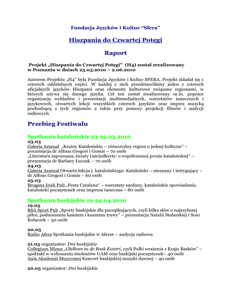 Fundacja Języków i Kultur “Sfera” Hiszpania do Czwartej Potęgi Raport Projekt „Hiszpania do Czwartej Potęgi” (H4) został zrealizowany w Poznaniu w dniach 23.03.2010 – 2.06.2010 Autorem Projektu „H4” była Fundacja Języków i Kultur SFERA. Projekt składał się z czterech oddzielnych części. W każdej z nich przedstawiliśmy jeden z czterech oficjalnych języków Hiszpanii oraz elementy kulturowe związane regionami, w których używa się danego języka. Cel ten został zrealizowany m.in. poprzez organizację wykładów i prezentacji multimedialnych, warsztatów tanecznych i językowych, otwartych lekcji wszystkich czterech języków oraz imprez muzyką pochodzącą z tych regionów a także przy pomocy projekcji filmów i audycji radiowych. Przebieg Festiwalu Spotkania katalońskie 23-25.03.2010 23.03 Galeria Arsenał „Krainy Katalońskie – różnorodny region o jednej kulturze” – prezentacja dr Alfons Gregori i Gomis – 70 osób „Literatura zapoznana, światy (nie)odkryte: o współczesnej prozie katalońskiej” – prezentacja dr Barbary Łuczak – 70 osób 24.03 Galeria Arsenał Otwarta lekcja j. katalońskiego: Kataloński – nieznany i intrygujący – dr Alfons Gregori i Gomis – 60 osób 25.03 Brogans Irish Pub „Festa Catalana“ – warsztaty sardany, katalońskie opowiadania, kataloński poczęstunek oraz impreza taneczna – 80 osób Spotkania baskijskie 19-24.04.2010 19.05 BSA Sport Pub „Sporty baskijskie dla początkujących, czyli kilka słów o najszybszej piłce, podnoszeniu kamieni i koszeniu trawy” – prezentacja Natalii Stolarskiej i Soni Kolaczek – 30 osób 20.05 Radio Afera Spotkania baskijskie w Aferze – audycja radiowa 21.05 organizator: Dni baskijskie Collegium Minus „Głelkom tu de Bask Kontri, czyli Polki wrażenia z Kraju Basków” – spektakl w wykonaniu studentów UAM oraz baskijski poczęstunek– 40 osób Aula Akademii Muzycznej Koncert baskijskiej muzyki dawnej – 40 osób 22.05 organizator: Dni baskijskie Collegium Novum "Nie mieszajcie nam języka z polityką" – wykłady dr Tomasza Wicherkiewicza i Joanny Janiszewskiej- 30 osób Baskijskie filmy krótkometrażowe – 30 osób „I ty zostaniesz Euskaldunem, czyli kącik gier i zabaw językowych dla ciekawych języka baskijskiego” – warsztaty językowe Natalii Stolarskiej i Alicji Wiącek – 5 osób 23.05 Galeria Arsenał „Herriko jaiak czyli co się święci w Kraju Basków”- prezentacja Natalii Stolarskiej – 15 osób Brogans Iris Pub Warsztaty taneczne – prowadzenie: Amaia Donés Mendia Konkurs pintxo, czyli baskijskich przekąsek Impreza z muzyką baskijską – 100 osób 24.05 Galeria Arsenał „Kaixo, zer moduz?, czyli otwarta lekcja j. baskijskiego” prowadzenie: Amaia Donés Mendia – 30 osób Kino Rialto „Zbrodnia Ferpekcyjna” – projekcja filmu – 30 osób Spotkania kastylijskie 6-9.05.2010 6.05 MDK Dragon „Transkulturowy potencjał – hiszpańskie butô czy japońskie flamenco?” – wykład mgr Ewy Janckiej – 30 osób „Jesús Franco: przyjemność dla trojga. Pornografia, hispanicum, horror?” – wykład dr Magdaleny Kamińskiej – 30 osób „Kobieta w świecie machismo – w poszukiwaniu hiszpańskich fotografek” – wykład dr Marianny Michałowskiej – 30 osób Kino Rialto „Duchy Goi” – projekcja filmu 7.05 MDK Dragon „O hybrydycznym charakterze kultury hiszpańskiej” – wykład dr Krzysztofa Moraczewskiego – 35 osób „La movida madrileña - ruch, który stał się legendą” – wykład dr Weroniki BrylRoman – 25 osób Kino Rialto „4 piętro” – projekcja fimu 8.05 Miejsce Spotkania Pijalnia Yerba Mate „Perła Południa – andaluzyjski świat przez pryzmat jego kultury, historii i języka” – prezentacja Pauliny Wandas i José Luis Bautista Montero – 40 osób 9.05 Kino Rialto “Iberia” – projekcja filmu Klubokawiarnia Meskal “Legendy toledańskie” – cuentacuentos w wykonaniu Evy Rufo Spotkaniom kastylijskim towarzyszyła wystawa fotografii Sławomira Rompskiego (www.rompski.com) z trasy Camino de Santiago, którą można obejrzeć na stronie internetowej Fundacji „Sfera”:www.fundacjasfera.org Spotkania galicyjskie 28.05-2.06.2010 28.o5 Miejsce Spotkania Pijalnia Yerba Mate „Ciudades meigas. Wyprawy do zielonego serca Hiszpanii” – prezentacja Łukasza Bergera – 25 osób 29.05 Miejsce Spotkania Pijalnia Yerba Mate „Galicja kręci się wokół piłki” – prezentacja Jakuba Czubiela i Andrzeja Bazylczuka – 20 osób Otwarta lekcja języka języka galicyjskiego – prowadzenie: studenci z Galicji przebywający w Poznaniu w ramach programu ERASMUS – 20 osób Mistura Pub „Fiesta gallega” – rytuał queimady oraz impreza taneczna z muzyką galicyjską – 130 osób 30.05 Kino Rialto „W stronę morza” – projekcja filmu 1.06 Radio Afera Spotkania galicyjskie w Aferze – audycja radiowa 2.06 Galeria Arsenał „Galicyjki w literackim świecie czyli kilka słów na temat galicyjskich autorek” – prezentacja Mai Koszarskiej – 35 osób „Galicja magiczna” prezentacja Katarzyny Połczyńskiej – 30 osób Spotkaniom galicyjskim towarzyszyła wystawa fotografii Sławomira Rompskiego (www.rompski.com) z trasy Camino de Santiago, którą można obejrzeć na stronie internetowej Fundacji „Sfera”: www.fundacjasfera.org Sponsorzy Festiwalu Księgarnia Nowela Księgarnia Arsenał Grafton Druk Partnerzy Festiwalu Galeria Miejska Arsenał Kontakt Español Kino Rialto Fundacja Mały Dom Kultury Klub Dragon Miejsce Spotkania Pijalnia Yerba Mate Koło Naukowe Hispanistów Brogans Iris Pub Mistura Pub Klubokawiarnia Meskal Zakład Katalonistyki UAM Dni Baskijskie BSA Sport Pub Radio Afera Patroni Medialni Telewizja WTVK Radio Merkury Czas Kultury Plakat Projekt: Ewa Grabowska (1000 szt., format A3) Promocja Promocja odbywała się przez cały okres trwania projektu i polegała m.in. na promocji w mediach, poprzez plakaty bannery internetowe o