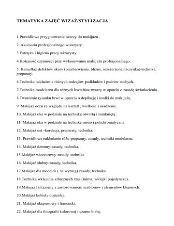 TEMATYKA ZAJĘĆ WIZAŻ/STYLIZACJA 1.Prawidłowe przygotowanie twarzy do makijażu . 2. Akcesoria profesjonalnego wizażysty. 3.Estetyka i higiena pracy wizażysty. 4.Kolejność czynności przy wykonywaniu makijażu profesjonalnego. 5. Kamuflaż defektów skóry (przebarwienia, blizny, rozszerzone naczyńka)-technika, preparaty. 6.Technika nakładania różnych rodzajów podkładów i pudrów suchych. 7.Technika modelarzu dla różnych kształtów twarzy w oparciu o zasadę światłocienia. 8.Tworzenie rysunku brwi w oparciu o depilację i środki do makijażu. 9. Makijaż oczu ze względu na kształt , wielkość i osadzenie. 10. Makijaż oka w podziale na technikę otwartą i zamkniętą . 11. Makijaż oka w podziale na technikę mono i polichromatyczna 12. Makijaż ust –korekcja, preparaty, technika. 13. Prawidłowe nakładanie różu-preparaty, zasady, techniki modelarzu. 14. Makijaż dzienny-zasady, technika. 15.Makijaz wieczorowy-zasady, technika. 16. Makijaż ślubny-zasady, technika. 17.Makijaż dla modelek ( na wybieg) zasady, technika. 18.Technika wklejania sztucznych rzęs (taśma, wklejki pojedyncze). 19.Makijaż fantazyjny z zastosowaniem szablonów i elementów klejonych. 20.Makijaż kobiety dojrzałej. 21. Makijaż ekspresowy i francuski. 22. Makijaż dla fotografii kolorowej i czarno białej. 23.Historia makijażu , ubioru i fryzury : Egipt, Grecja, barok, rokoko-referat. 24. Cechy modela w poszukiwaniu najlepszego rozwiązania dla określonej stylizacji. 25.Stylizacja fryzury do wybranego tematu –przykłady(historia) 26.Wyknonanie makijażu w oparciu o zdobyte wiadomości z historii makijażu: Egipt, Grecja, barok, Japonia. 27. Historia makijażu, ubioru i fryzury : lata: 20,30,50,60,70,80, współczesność –referat. 28.Stylizacja fryzury do wybranego tematu-przykłady . 29.Wykonanie makijażu w oparciu o zdobyte wiadomości lata:20,30,50,60,70,80 . 30. Elementy ,,body painting ,,-przykłady, technika. 31. Makijaż dla dzieci z wykorzystaniem ,,body-painting ,,. 32.Zasady stylizacji. 33.Zasady analizy kolorystycznej –zastosowanie, stanowisko pracy, akcesoria . 34.Relacje stylisty i klienta, wizerunek stylisty podczas pracy-aspekt psychologiczny. 35.Analiza koloru skóry, włosów i tęczówki oka . 36.Umiejętność stworzenia indywidualnej palety barw dla klienta w oparciu o kolory ciepłe, zimne, czyste i przytłumione. 37.Technika stosowania chust kolorystycznych –demonstracja. 38.Indywidualne ćwiczenia z chustami kolorystycznymi. 39.Stylizacja sylwetki uwzględniająca proporcje ciała –dobór wzorów, struktur i rodzajów materiałów. 40.Dobór kolorystyki ubrań w oparciu o indywidualną paletę barw. 41. Dobór fryzury i koloru włosów w oparciu o indywidualną paletę barw i kształt twarzy. 42.Dobór dodatków dla poszczególnych typów kolorystycznych. 43.Zasady doboru odzieży na dzień , wieczór i charakterystyczne okazje. 44.Podstawy charakteryzacji-pokaz tzw. ,,efektów specjalnych,,. 45.Podstawy marketingu i prawa przy poszukiwaniu pracy i zakładaniu własnej firmy. 46. Egzamin końcowy –wykonanie stylizacji ubioru, makijażu i fryzury na wybrany temat i sesja fotograficzna.