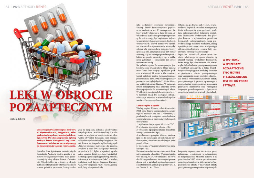 64 P&B ARTYKUŁY BIZNES ARTYKUŁY BIZNES P&B LEKI W OBROCIE POZAAPTECZNYM Izabela Libera Coraz więcej Polaków kupuje leki OTC w hipermarketach, drogeriach, sklepach osiedlowych czy na stacjach benzynowych. Do ich zakupu poza apteką zachęca łatwa dostępność czy cena. Farmaceuci od dawna zwracają uwagę na konsekwencje takiego rozwiązania. Naczelna Izba Aptekarska zwróciła się do Prezydenta Andrzeja Dudy z prośbą o pomoc w rozwiązaniu problemu stale poszerzającej się sfery obrotu lekami. Członkowie NIA chcieliby, by w trosce o zdrowie publiczne stanął razem z farmaceutami po stronie polskich pacjentów, którzy zasłu- gują na taką samą ochronę, jak obywatele innych państw Unii Europejskiej. Ich zdaniem „ze względu na bezpieczeństwo zdrowotne obywateli konieczne jest podjęcie zdecydowanych działań legislacyjnych. Obrót lekami w sklepach ogólnodostępnych stanowi poważne zagrożenie dla zdrowia Polaków i musi być zastąpiony obrotem w aptekach. (…) Tylko w aptekach są właściwe warunki do ich przechowywania i tylko tam pacjenci uzyskają fachową, rzetelną informację o nabywanym leku” – dodają podpisani pod listem: Grzegorz Kucharewicz, były już prezes NRA i Marek Jędrzejczak, były wiceprezes Rady. Izba dodatkowo postuluje nowelizację Ustawy Prawo farmaceutyczne poprzez m.in. dodanie w art. 71 nowego ust. 1a, który miałby stanowić o tym, iż poza aptekami oraz punktami aptecznymi produkty lecznicze mogą być wydawane jedynie w najmniejszych dopuszczonych do obrotu opakowaniach. Wśród postulatów wymienić można także wprowadzenie obowiązku szkoleń dla pracowników sklepów, którzy sprzedają leki, przynajmniej raz na 6 lub 12 miesięcy, czy właściwego przechowywania leków, w sposób zamknięty, np. w szklanych gablotach i wydawanie ich przez uprawnione osoby. Na polskim rynku farmaceutycznym jest bowiem coraz więcej leków, które pacjent może kupić bez recepty. Aptekarze podczas konferencji 11 marca w Warszawie na temat patologii rynku farmaceutycznego przypomnieli, że w 1991 roku w sprzedaży pozaaptecznej było jedynie 11 leków. Obecnie jest ich już ponad 3 tysiące. W założeniu rynek pozaapteczny miał ułatwiać szybki dostęp pacjentów do podstawowych leków. W sklepach, na stacjach benzynowych czy w kioskach miały być dostępne wybrane substancje aktywne, w niewielkich opakowaniach i bezpiecznych dawkach. Leki nie tylko z apteki Według zapisu Ustawy z dnia 6 września 2001 roku Prawo farmaceutyczne, zawartego w artykule 23a ust. 1 wskazano, iż produkty lecznicze dopuszczone do obrotu otrzymują jedną z następujących kategorii dostępności: 1) wydawane bez przepisu lekarza – OTC; 2) wydawane z przepisu lekarza – Rp; 3) wydawane z przepisu lekarza do zastrzeżonego stosowania – Rpz; 4) wydawane z przepisu lekarza, zawierające środki odurzające lub substancje psychotropowe, określone w odrębnych przepisach – Rpw; 5) stosowane wyłącznie w lecznictwie zamkniętym – Lz. Ustawodawca dopuszcza zatem obrót lekami bez recepty lekarskiej. W dalszej części ww. ustawy, w art. 68 wskazano, że obrót detaliczny produktami leczniczymi prowadzony jest w aptekach ogólnodostępnych, z zastrzeżeniem jednak przepisów ust. 2, art. 70 ust. 1 i art. 71 ust. 1. Właśnie na podstawie art. 71 ust. 1 ustawodawca dopuścił sprzedaż pozaapteczną leków wskazując, że poza aptekami i punktami aptecznymi obrót detaliczny produktami leczniczymi wydawanymi bez przepisu lekarza, z wyłączeniem produktów leczniczych weterynaryjnych, mogą prowadzić: sklepy zielarsko-medyczne, sklepy specjalistyczne zaopatrzenia medycznego, sklepy ogólnodostępne – zwane dalej „placówkami obrotu pozaaptecznego”. Legislator zobowiązał jednocześnie ministra właściwego do spraw zdrowia, by określił wykazy produktów leczniczych, które mogą być dopuszczone do obrotu w placówkach obrotu pozaaptecznego oraz w punktach aptecznych, a także kwalifikacje osób wydających produkty lecznicze w placówkach obrotu pozaaptecznego, oraz wymagania, jakim powinien odpowiadać lokal i wyposażenie placówek obrotu pozaaptecznego i punktu aptecznego – uwzględniając bezpieczeństwo stosowania produktów leczniczych oraz wymagania dotyczące przechowywania i dystrybucji produktów leczniczych w tych placówkach. Preparaty dopuszczone do obrotu pozaaptecznego wymieniono w załącznikach do rozporządzenia Ministra Zdrowia z 22 października 2010 roku w sprawie wykazu produktów leczniczych, które mogą być dopuszczone do obrotu w placówkach obrotu pozaaptecznego oraz punktach aptecznych. 65 W 1991 ROKU W SPRZEDAŻY POZAAPTECZNEJ BYŁO JEDYNIE 11 LEKÓW. OBECNIE JEST ICH JUŻ PONAD 3 TYSIĄCE. 66 P&B ARTYKUŁY BIZNES WŚRÓD POSTULATÓW APTEKARZY WYMIENIĆ MOŻNA WPROWADZENIE OBOWIĄZKU SZKOLEŃ DLA PRACOWNIKÓW SKLEPÓW SPRZEDAJĄCYCH LEKI, PRZYNAJMNIEJ RAZ NA 6 LUB 12 MIESIĘCY, CZY WŁAŚCIWEGO PRZECHOWYWANIA LEKÓW. Obejmują one wykazy substancji czynnych dopuszczonych do sprzedaży w różnych placówkach obrotu pozaaptecznego. Osobne listy utworzono dla punktów aptecznych, sklepów zielarsko-medycznych oraz sklepów ogólnodostępnych i sklepów specjalistycznego zaopatrzenia medycznego. Sklepy ogólnodostępne, drogerie i stacje benzynowe mogą zatem w Polsce handlować wybranymi lekami wydawanymi bez recepty, jeżeli ich zezwolenie na prowadzenie działalności gospodarczej obejmuje obrót produktami leczniczymi. Wymagania w zakresie lokalu i przechowywania leków Apteka obowiązana jest do spełnienia ustawowo określonych wymogów dotyczących warunków lokalowych, wyposażenia oraz wymagań w zakresie zatrudnienia osób kompetentnych do wydawania produktów leczniczych. Rozporządzenie Ministra Zdrowia z dnia 2 lutego 2009 roku w sprawie kwalifikacji osób wydających produkty lecznicze w placówkach obrotu pozaaptecznego, a także wymogów, jakim powinien odpowiadać lokal i wyposażenie tych placówek 