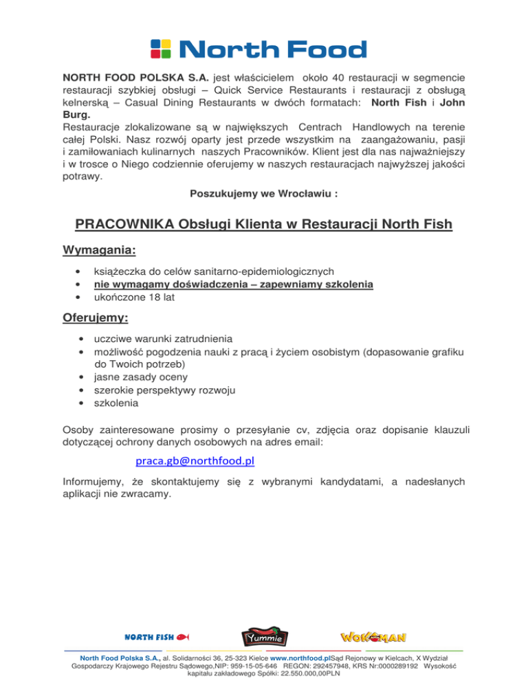 NORTH FOOD POLSKA S.A. jest właścicielem około 40 restauracji w segmencie restauracji szybkiej obsługi – Quick Service Restaurants i restauracji z obsługą kelnerską – Casual Dining Restaurants w dwóch formatach: North Fish i John Burg. Restauracje zlokalizowane są w największych Centrach Handlowych na terenie całej Polski. Nasz rozwój oparty jest przede wszystkim na zaangażowaniu, pasji i zamiłowaniach kulinarnych naszych Pracowników. Klient jest dla nas najważniejszy i w trosce o Niego codziennie oferujemy w naszych restauracjach najwyższej jakości potrawy. Poszukujemy we Wrocławiu : PRACOWNIKA Obsługi Klienta w Restauracji North Fish Wymagania: • • • książeczka do celów sanitarno-epidemiologicznych nie wymagamy doświadczenia – zapewniamy szkolenia ukończone 18 lat Oferujemy: • uczciwe warunki zatrudnienia • możliwość pogodzenia nauki z pracą i życiem osobistym (dopasowanie grafiku do Twoich potrzeb) • jasne zasady oceny • szerokie perspektywy rozwoju • szkolenia Osoby zainteresowane prosimy o przesyłanie cv, zdjęcia oraz dopisanie klauzuli dotyczącej ochrony danych osobowych na adres email: [email protected] Informujemy, że skontaktujemy się z wybranymi kandydatami, a nadesłanych aplikacji nie zwracamy. North Food Polska S.A., al. Solidarności 36, 25-323 Kielce www.northfood.plSąd Rejonowy w Kielcach, X Wydział Gospodarczy Krajowego Rejestru Sądowego,NIP: 959-15-05-646 REGON: 292457948, KRS Nr:0000289192 Wysokość kapitału zakładowego Spółki: 22.550.000,00PLN