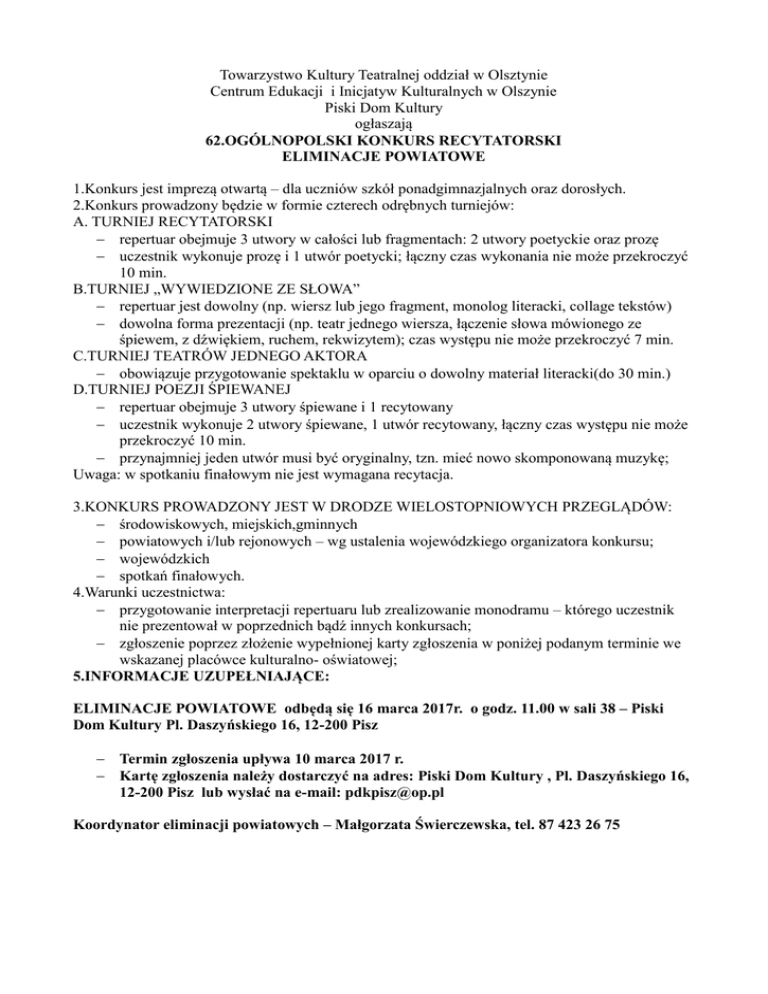 Towarzystwo Kultury Teatralnej oddział w Olsztynie Centrum Edukacji i Inicjatyw Kulturalnych w Olszynie Piski Dom Kultury ogłaszają 62.OGÓLNOPOLSKI KONKURS RECYTATORSKI ELIMINACJE POWIATOWE 1.Konkurs jest imprezą otwartą – dla uczniów szkół ponadgimnazjalnych oraz dorosłych. 2.Konkurs prowadzony będzie w formie czterech odrębnych turniejów: A. TURNIEJ RECYTATORSKI repertuar obejmuje 3 utwory w całości lub fragmentach: 2 utwory poetyckie oraz prozę uczestnik wykonuje prozę i 1 utwór poetycki; łączny czas wykonania nie może przekroczyć 10 min. B.TURNIEJ „WYWIEDZIONE ZE SŁOWA” repertuar jest dowolny (np. wiersz lub jego fragment, monolog literacki, collage tekstów) dowolna forma prezentacji (np. teatr jednego wiersza, łączenie słowa mówionego ze śpiewem, z dźwiękiem, ruchem, rekwizytem); czas występu nie może przekroczyć 7 min. C.TURNIEJ TEATRÓW JEDNEGO AKTORA obowiązuje przygotowanie spektaklu w oparciu o dowolny materiał literacki(do 30 min.) D.TURNIEJ POEZJI ŚPIEWANEJ repertuar obejmuje 3 utwory śpiewane i 1 recytowany uczestnik wykonuje 2 utwory śpiewane, 1 utwór recytowany, łączny czas występu nie może przekroczyć 10 min. przynajmniej jeden utwór musi być oryginalny, tzn. mieć nowo skomponowaną muzykę; Uwaga: w spotkaniu finałowym nie jest wymagana recytacja. 3.KONKURS PROWADZONY JEST W DRODZE WIELOSTOPNIOWYCH PRZEGLĄDÓW: środowiskowych, miejskich,gminnych powiatowych i/lub rejonowych – wg ustalenia wojewódzkiego organizatora konkursu; wojewódzkich spotkań finałowych. 4.Warunki uczestnictwa: przygotowanie interpretacji repertuaru lub zrealizowanie monodramu – którego uczestnik nie prezentował w poprzednich bądź innych konkursach; zgłoszenie poprzez złożenie wypełnionej karty zgłoszenia w poniżej podanym terminie we wskazanej placówce kulturalno- oświatowej; 5.INFORMACJE UZUPEŁNIAJĄCE: ELIMINACJE POWIATOWE odbędą się 16 marca 2017r. o godz. 11.00 w sali 38 – Piski Dom Kultury Pl. Daszyńskiego 16, 12-200 Pisz Termin zgłoszenia upływa 10 marca 2017 r. Kartę zgłoszenia należy dostarczyć na adres: Piski Dom Kultury , Pl. Daszyńskiego 16, 12-200 Pisz lub wysłać na e-mail: [email protected] Koordynator eliminacji powiatowych – Małgorzata Świerczewska, tel. 87 423 26 75
