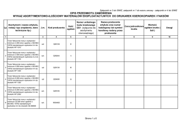 Załącznik nr 3 do SIWZ, załącznik nr 1 do wzoru umowy - załącznik nr 4 do SIWZ OPIS PRZEDMIOTU ZAMÓWIENIA WYKAZ ASORTYMENTOWO-ILOŚCIOWY MATERIAŁÓW EKSPLOATACYJNYCH DO DRUKAREK KSEROKOPIAREK I FAKSÓW Asortyment ( nazwa artykułu, Lp. rodzaj i typ urządzenia, dane techniczne itp.) Numer unikalnego kodu kreskowego Ilość GS1 (wyłącznie dla ogółem asortymentu równoważnego) J.m. Kod producenta 3 4 5 Toner fabrycznie nowy o wydajności minimum 2.000 stron zgodnie z ISO/IEC 1 19752 standartowych wydruków A-4 do drukarki HP 1015 szt Q2612A 2 Toner fabrycznie nowy o wydajności minimum 2.500 stron zgodnie z ISO/IEC 2 19752 standardowych wydruków A-4 do drukarki HP 1150 szt. Q2624A 1 Toner fabrycznie nowy o wydajności minimum 4.000 stron zgodnie z ISO/IEC 3 19752 standartowych wydruków A-4 do drukarki HP 1300 szt Q2613X 8 Toner fabrycznie nowy o wydajności minimum 6.000 stron zgodnie z ISO/IEC 19752 standartowych wydruków A-4 do drukarki HP 1320 szt Q5949X 5 Toner fabrycznie nowy o wydajności minimum 6.000 stron zgodnie z ISO/IEC 5 19752 standartowych wydruków A-4 do drukarki HP 2300 szt. Q2610A 5 Toner fabrycznie nowy o wydajności minimum 22.000 stron zgodnie z 6 ISO/IEC 19752 standartowych wydruków A-4 do drukarki Oki B6500 szt. 9004462 4 1 4 2 6 Strona 1 z 6 Nazwa producenta artykułu oraz numer Wartość Cena jednostkowa ogółem brutto ( katalogowy lub symbol brutto handlowy nadany przez 5x8 ) producenta 7 8 9 Uwagi 10 Toner fabrycznie nowy o wydajności minimum 7.000 stron zgodnie z ISO/IEC 7 19752 standartowych wydruków A-4 do drukarki Oki B430dn szt. 43979202 1 Toner fabrycznie nowy o wydajności 8 minimum 17.000 kopii standartowych wydruków A-4 do drukarki Oki B6300 szt. 9004079 5 Toner fabrycznie nowy o wydajności minimum 20.000 ston zgodnie z 9 ISO/IEC 19752 standardowtch wydruków A-4 do drukarki EPSON Aculaser M4000 szt. C13S051170 5 Toner fabrycznie nowy o wydajności minimum 17.500 stron zgodnie z 10 ISO/IEC 19752 standardowych wydruków A-4 do kserokopiarki Konica Minolta 250 szt. TN211 3 Toner Black fabrycznie nowy o wydajności minimum 20.000 stron 11 zgodnie z ISO/IEC 19752 standardowych wydruków A-4 do kserokopiarki Develop 253 szt. TN213 1 Toner fabrycznie nowy o wydajności minimum 17.500 stron zgodnie z 12 ISO/IEC 19752 standardowych wydruków A-4 do kserokopiarki Develop 250 szt. TN211 1 Bęben fabrycznie nowy o wydajności 80.000 stron zgodnie z ISO/IEC 19752 13 standardowych wydruków A-4 do kserokopiarki Konica Minolta 250 szt. DR310 3 14 Bęben fabrycznie nowy o wydajności 80.000 stron zgodnie z ISO/IEC 19752 standardowych wydruków A-4 do kserokopiarki Develop 250 szt. DR310 3 15 Developer fabrycznie nowy do kserokopiarki konica Minolta Bizhub 162 szt. DV 110 2 szt. DV 310 3 szt. DV 110 2 Developer fabrycznie nowy do kserokopiarki Konica Minolta 250 Developer fabrycznie nowy do 17 kserokopiarki Develop 163 16 Strona 2 z 6 18 Developer fabrycznie nowy do kserokopiarki Develop 250 szt. DV 310 3 Toner fabrycznie nowyo wydajności do 2.500 stron zgodnie z ISO/IEC 19752 A19 4 przy 5% pokryciu do faxu Panasonic 513/613 szt. KX-FA 83 3 20 Bęben fabrycznie nowy o wydajności minimum 10.000 stron zgodnie z ISO/IEC 19752 do faxu Panasonic 513/613 szt. KX-FA84 2 21 Listwa czyszcząca, fabrycznie nowa do kserokopairki Konica Minolta 162 szt. X 2 22 Listwa czyszcząca, fabrycznie nowa do kserokopiarki Develop INEO 163 szt. X 2 szt. X 25 szt. X 50 Bęben fabrycznie nowy o wydajności minimum 45.000 stron zgodnie z 25 ISO/IEC 19752 standardowych wydruków A-4 do kserokopiarki Develop 253 Cyan Develop IU211) szt. IU211 1 Bęben fabrycznie nowy o wydajności minimum 45.000 stron zgodnie z 26 ISO/IEC 19752 standardowych wydruków A-4 do kserokopiarki Develop 253 Yellow Develop IU211) szt. IU211 1 Bęben fabrycznie nowy o wydajności minimum 45.000 stron zgodnie z 27 ISO/IEC 19752 standardowych wydruków A-4 do kserokopiarki Develop 253 Magenta Develop IU211) szt. IU211 1 Bęben fabrycznie nowy o wydajności minimum 70.000 stron zgodnie z 28 ISO/IEC 19752 standardowych wydruków A-4 do kserokopiarki Develop 253 Black (np. Develop IU211) szt. IU211 2 Taśma termotransferowa EASYCODER 301/E4/F/F4 60*220mm 24 Etykieta E 050080-401(1316 szt.) 23 Strona 3 z 6 Toner fabrycznie nowy o wydajności minimum 11.000 stron zgodnie z 29 ISO/IEC 19752 standardowych wydruków A-4 do kserokopiarki Konica Minolta 162 szt. TN114 3 Toner fabrycznie nowy o wydajności minimum 11.000 stron zgodnie z 30 ISO/IEC 19752 standardowych wydruków A-4 do kserokopiarki Develop 163 szt. TN114 2 Etykiety do drukarki Citizen CLP 2001 31 (50X30 E-1067 1R 40/1000 out), 1.000 szt na rolce szt. X 3 szt. X 8 szt. X 2 Toner fabrycznie nowy o wydajności minimum 5.000 stron zgodnie z ISO/IEC 19752 standartowych wydruków A-4 do drukarki Samsung ML-2250 szt. ML-2250D5 4 Toner fabrycznie nowy o wydajności minimum 6.000 stron zgodnie z ISO/IEC 35 19752 standartowych wydruków A-4 do drukarki Samsung ML-3560 szt. ML-3560D6 1 Toner fabrycznie nowy o wydajności minimum 10.000 stron zgodnie z 36 ISO/IEC 19752 standardowych wydruków A-4 do kserokopiarki Samsung SCX-5635FN szt. MLT-D2082L 1 szt. 43979002 2 szt. X 4 0T650H11E 40 X 4 32 Etykiety samoprzylepne PP80x50 mm do drukarki PD-41 ( 1 rolka 2780 etykiet) Taśma termotransferowa do drukarki 33 Citizen CLP 2001, żywiczna (64x300 out) 34 Bęben do drukarni OKI B430dn o wydajności minimum 25.000 stron Taśma barwiąca Super Premium 38 85mmx150m do drukarki PD-41 37 Toner fabrycznie nowy o wydajności minimum 25.000 stron zgodnie z 39 ISO/IEC 19752 standartowych wydruków A-4 do drukarki Lexmark T650 40 Taśma barwiąca Super Premium 85mmx150m do drukarki PD-41 szt. Strona 4 z 6 Toner Black fabrycznie nowy o wydajności minimum 27.000 stron 41 zgodnie z ISO/IEC 19752 standartowych wydruków A-4 do kserokopiarki Konica Minolta Bizhub C224 szt. TN-321K 1 Toner Cyan fabrycznie nowy o wydajności minimum 25.000 stron 42 zgodnie z ISO/IEC 19752 standar