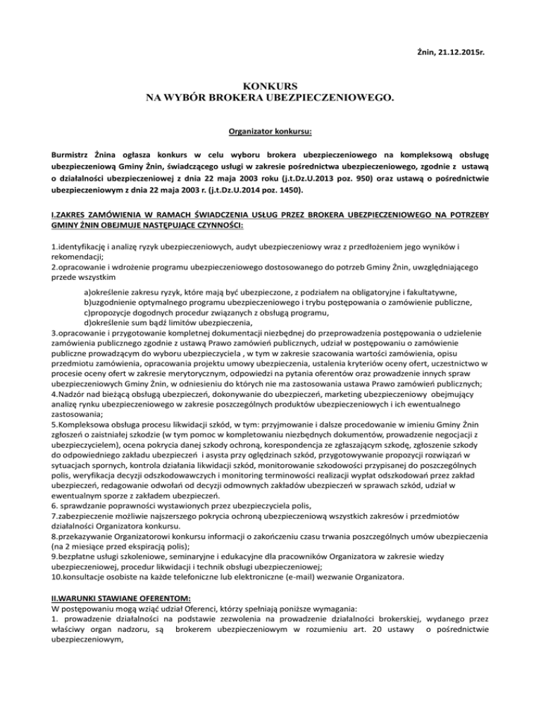 Żnin, 21.12.2015r. KONKURS NA WYBÓR BROKERA UBEZPIECZENIOWEGO. Organizator konkursu: Burmistrz Żnina ogłasza konkurs w celu wyboru brokera ubezpieczeniowego na kompleksową obsługę ubezpieczeniową Gminy Żnin, świadczącego usługi w zakresie pośrednictwa ubezpieczeniowego, zgodnie z ustawą o działalności ubezpieczeniowej z dnia 22 maja 2003 roku (j.t.Dz.U.2013 poz. 950) oraz ustawą o pośrednictwie ubezpieczeniowym z dnia 22 maja 2003 r. (j.t.Dz.U.2014 poz. 1450). I.ZAKRES ZAMÓWIENIA W RAMACH ŚWIADCZENIA USŁUG PRZEZ BROKERA UBEZPIECZENIOWEGO NA POTRZEBY GMINY ŻNIN OBEJMUJE NASTĘPUJĄCE CZYNNOŚCI: 1.identyfikację i analizę ryzyk ubezpieczeniowych, audyt ubezpieczeniowy wraz z przedłożeniem jego wyników i rekomendacji; 2.opracowanie i wdrożenie programu ubezpieczeniowego dostosowanego do potrzeb Gminy Żnin, uwzględniającego przede wszystkim a)określenie zakresu ryzyk, które mają być ubezpieczone, z podziałem na obligatoryjne i fakultatywne, b)uzgodnienie optymalnego programu ubezpieczeniowego i trybu postępowania o zamówienie publiczne, c)propozycje dogodnych procedur związanych z obsługą programu, d)określenie sum bądź limitów ubezpieczenia, 3.opracowanie i przygotowanie kompletnej dokumentacji niezbędnej do przeprowadzenia postępowania o udzielenie zamówienia publicznego zgodnie z ustawą Prawo zamówień publicznych, udział w postępowaniu o zamówienie publiczne prowadzącym do wyboru ubezpieczyciela , w tym w zakresie szacowania wartości zamówienia, opisu przedmiotu zamówienia, opracowania projektu umowy ubezpieczenia, ustalenia kryteriów oceny ofert, uczestnictwo w procesie oceny ofert w zakresie merytorycznym, odpowiedzi na pytania oferentów oraz prowadzenie innych spraw ubezpieczeniowych Gminy Żnin, w odniesieniu do których nie ma zastosowania ustawa Prawo zamówień publicznych; 4.Nadzór nad bieżącą obsługą ubezpieczeń, dokonywanie do ubezpieczeń, marketing ubezpieczeniowy obejmujący analizę rynku ubezpieczeniowego w zakresie poszczególnych produktów ubezpieczeniowych i ich ewentualnego zastosowania; 5.Kompleksowa obsługa procesu likwidacji szkód, w tym: przyjmowanie i dalsze procedowanie w imieniu Gminy Żnin zgłoszeń o zaistniałej szkodzie (w tym pomoc w kompletowaniu niezbędnych dokumentów, prowadzenie negocjacji z ubezpieczycielem), ocena pokrycia danej szkody ochroną, korespondencja ze zgłaszającym szkodę, zgłoszenie szkody do odpowiedniego zakładu ubezpieczeń i asysta przy oględzinach szkód, przygotowywanie propozycji rozwiązań w sytuacjach spornych, kontrola działania likwidacji szkód, monitorowanie szkodowości przypisanej do poszczególnych polis, weryfikacja decyzji odszkodowawczych i monitoring terminowości realizacji wypłat odszkodowań przez zakład ubezpieczeń, redagowanie odwołań od decyzji odmownych zakładów ubezpieczeń w sprawach szkód, udział w ewentualnym sporze z zakładem ubezpieczeń. 6. sprawdzanie poprawności wystawionych przez ubezpieczyciela polis, 7.zabezpieczenie możliwie najszerszego pokrycia ochroną ubezpieczeniową wszystkich zakresów i przedmiotów działalności Organizatora konkursu. 8.przekazywanie Organizatorowi konkursu informacji o zakończeniu czasu trwania poszczególnych umów ubezpieczenia (na 2 miesiące przed ekspiracją polis); 9.bezpłatne usługi szkoleniowe, seminaryjne i edukacyjne dla pracowników Organizatora w zakresie wiedzy ubezpieczeniowej, procedur likwidacji i technik obsługi ubezpieczeniowej; 10.konsultacje osobiste na każde telefoniczne lub elektroniczne (e-mail) wezwanie Organizatora. II.WARUNKI STAWIANE OFERENTOM: W postępowaniu mogą wziąć udział Oferenci, którzy spełniają poniższe wymagania: 1. prowadzenie działalności na podstawie zezwolenia na prowadzenie działalności brokerskiej, wydanego przez właściwy organ nadzoru, są brokerem ubezpieczeniowym w rozumieniu art. 20 ustawy o pośrednictwie ubezpieczeniowym, 2. posiadanie polisy odpowiedzialności cywilnej brokera zgodnie z Rozporządzeniem Ministra Finansów z dnia czerwca 2005r. w sprawie obowiązkowego ubezpieczenia odpowiedzialności cywilnej z tytułu wykonywania działalności brokerskiej (j.t.Dz.U.2015 poz.75), 3. nie zaleganie z opłacaniem podatków, opłat oraz składek na ubezpieczenie zdrowotne i społeczne, 4. posiadanie doświadczenia w zakresie ubezpieczania jednostek samorządu terytorialnego, tj. zawarli umowy na świadczenie usług brokerskich i współpracują z co najmniej 5 jednostkami samorządu terytorialnego (gminami, powiatami, województwami ,a nie ich jednostkami) wg stanu na dzień ogłaszania konkursu , 5. dysponowanie odpowiednim potencjałem kadrowym, tj zatrudniają na podstawie umowy o pracę lub stosunku cywilnoprawnego osób posiadających uprawnienia do wykonywania czynności brokerskich (np. osób legitymujących się zdanym egzaminem brokerskim) wg stanu na dzień ogłaszania konkursu, 6. posiadanie komórki organizacyjnej zajmującej się likwidacją szkód, 7.uczestnictwo wykonując funkcję brokera w co najmniej 5 postępowaniach o udzielenie zamówienia publicznego po stronie jednostek samorządu terytorialnego (gminy, powiatu, województwa), których przedmiotem był wybór ubezpieczyciela, prowadzonych zgodnie z przepisami ustawy Prawo Zamówień Publicznych, w ciągu ostatnich trzech lat kalendarzowych (2013-2015) III.KRYTERIA OCENY OFERT: 1. Liczba jednostek samorządu terytorialnego, dla których Wykonawca świadczy usługi brokerskie, wg stanu na dzień ogłoszenia konkursu: a) 5 jednostek-5 pkt, b) 6-15 jednostek-10 pkt c) 16-25 jednostek-15 pkt, d) 26 jednostek i więcej-20 pkt. Na potwierdzenie spełnienia warunku należy załączyć zgodny ze stanem faktycznym wykaz obsługiwanych wg stanu na dzień ogłoszenia konkursu jednostek samorządu terytorialnego. 2.Liczba przygotowywanych postępowań o udzielenie zamówienia publicznego w trybie ustawy Prawo zamówień publicznych, dla jednostek samorządu