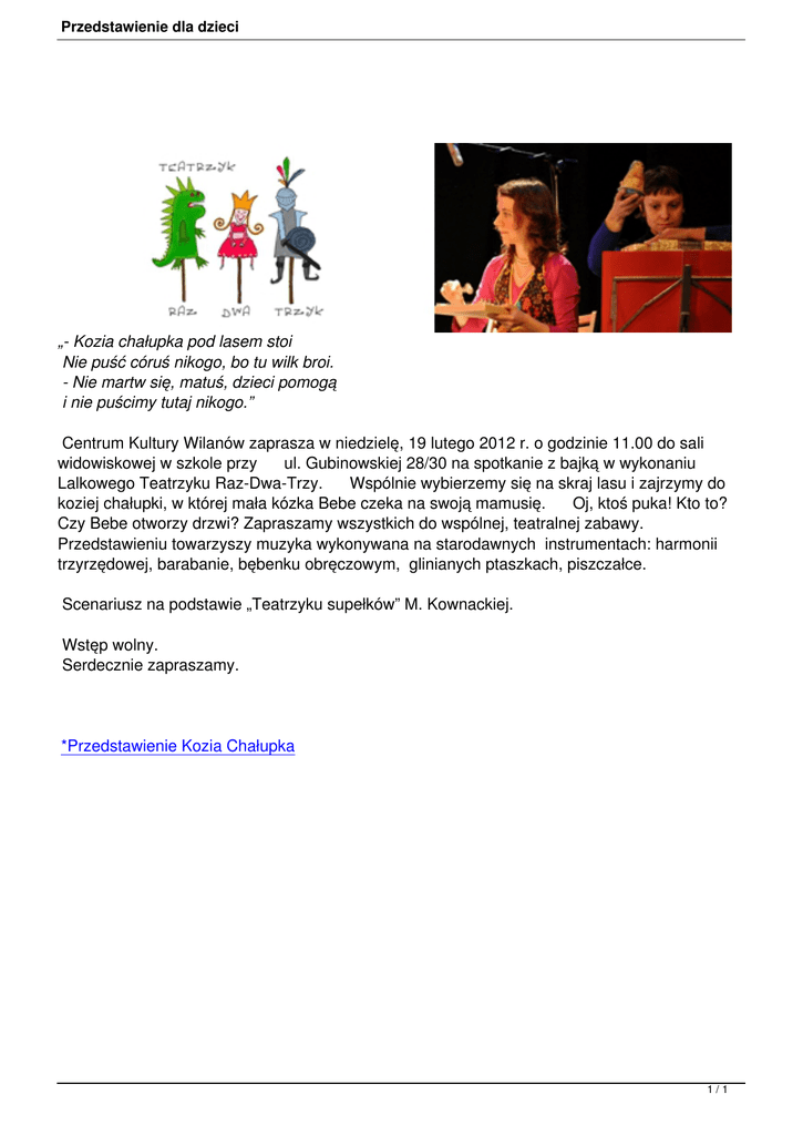 Przedstawienie dla dzieci „- Kozia chałupka pod lasem stoi Nie puść córuś nikogo, bo tu wilk broi. - Nie martw się, matuś, dzieci pomogą i nie puścimy tutaj nikogo.” Centrum Kultury Wilanów zaprasza w niedzielę, 19 lutego 2012 r. o godzinie 11.00 do sali widowiskowej w szkole przy ul. Gubinowskiej 28/30 na spotkanie z bajką w wykonaniu Lalkowego Teatrzyku Raz-Dwa-Trzy. Wspólnie wybierzemy się na skraj lasu i zajrzymy do koziej chałupki, w której mała kózka Bebe czeka na swoją mamusię. Oj, ktoś puka! Kto to? Czy Bebe otworzy drzwi? Zapraszamy wszystkich do wspólnej, teatralnej zabawy. Przedstawieniu towarzyszy muzyka wykonywana na starodawnych instrumentach: harmonii trzyrzędowej, barabanie, bębenku obręczowym, glinianych ptaszkach, piszczałce. Scenariusz na podstawie „Teatrzyku supełków” M. Kownackiej. Wstęp wolny. Serdecznie zapraszamy. *Przedstawienie Kozia Chałupka 1/1