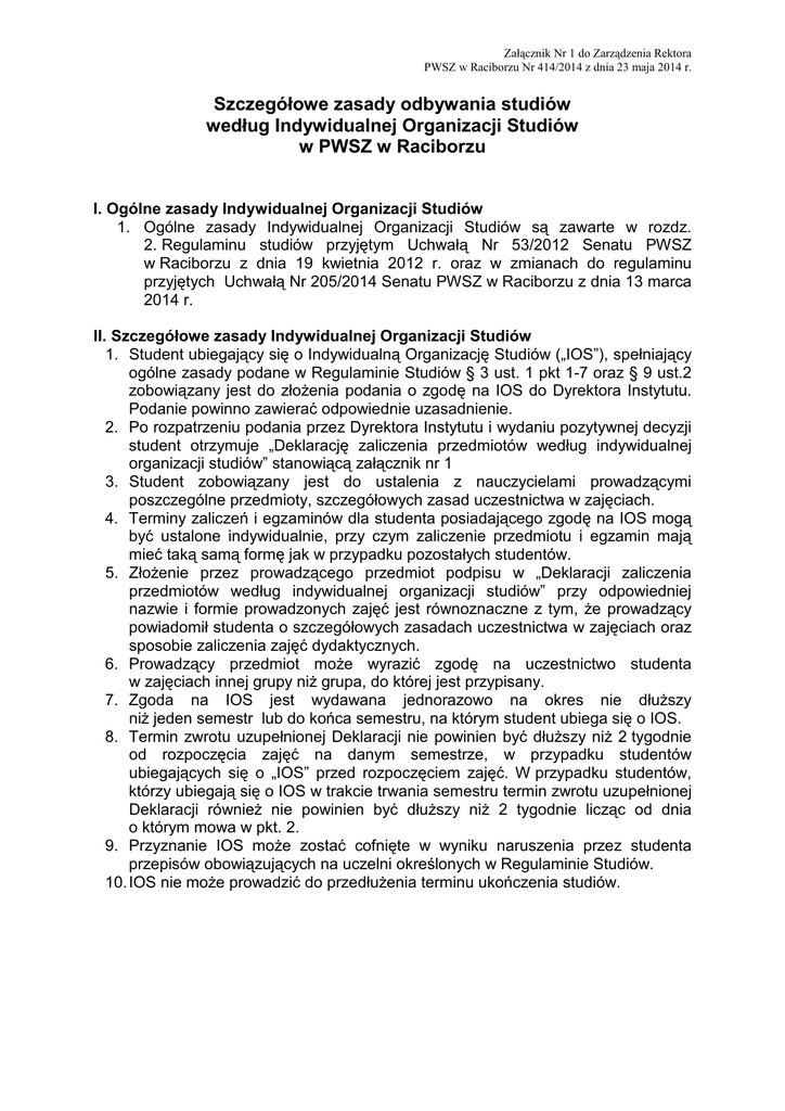 Załącznik Nr 1 do Zarządzenia Rektora PWSZ w Raciborzu Nr 414/2014 z dnia 23 maja 2014 r. Szczegółowe zasady odbywania studiów według Indywidualnej Organizacji Studiów w PWSZ w Raciborzu I. Ogólne zasady Indywidualnej Organizacji Studiów 1. Ogólne zasady Indywidualnej Organizacji Studiów są zawarte w rozdz. 2. Regulaminu studiów przyjętym Uchwałą Nr 53/2012 Senatu PWSZ w Raciborzu z dnia 19 kwietnia 2012 r. oraz w zmianach do regulaminu przyjętych Uchwałą Nr 205/2014 Senatu PWSZ w Raciborzu z dnia 13 marca 2014 r. II. Szczegółowe zasady Indywidualnej Organizacji Studiów 1. Student ubiegający się o Indywidualną Organizację Studiów („IOS”), spełniający ogólne zasady podane w Regulaminie Studiów § 3 ust. 1 pkt 1-7 oraz § 9 ust.2 zobowiązany jest do złożenia podania o zgodę na IOS do Dyrektora Instytutu. Podanie powinno zawierać odpowiednie uzasadnienie. 2. Po rozpatrzeniu podania przez Dyrektora Instytutu i wydaniu pozytywnej decyzji student otrzymuje „Deklarację zaliczenia przedmiotów według indywidualnej organizacji studiów” stanowiącą załącznik nr 1 3. Student zobowiązany jest do ustalenia z nauczycielami prowadzącymi poszczególne przedmioty, szczegółowych zasad uczestnictwa w zajęciach. 4. Terminy zaliczeń i egzaminów dla studenta posiadającego zgodę na IOS mogą być ustalone indywidualnie, przy czym zaliczenie przedmiotu i egzamin mają mieć taką samą formę jak w przypadku pozostałych studentów. 5. Złożenie przez prowadzącego przedmiot podpisu w „Deklaracji zaliczenia przedmiotów według indywidualnej organizacji studiów” przy odpowiedniej nazwie i formie prowadzonych zajęć jest równoznaczne z tym, że prowadzący powiadomił studenta o szczegółowych zasadach uczestnictwa w zajęciach oraz sposobie zaliczenia zajęć dydaktycznych. 6. Prowadzący przedmiot może wyrazić zgodę na uczestnictwo studenta w zajęciach innej grupy niż grupa, do której jest przypisany. 7. Zgoda na IOS jest wydawana jednorazowo na okres nie dłuższy niż jeden semestr lub do końca semestru, na którym student ubiega się o IOS. 8. Termin zwrotu uzupełnionej Deklaracji nie powinien być dłuższy niż 2 tygodnie od rozpoczęcia zajęć na danym semestrze, w przypadku studentów ubiegających się o „IOS” przed rozpoczęciem zajęć. W przypadku studentów, którzy ubiegają się o IOS w trakcie trwania semestru termin zwrotu uzupełnionej Deklaracji również nie powinien być dłuższy niż 2 tygodnie licząc od dnia o którym mowa w pkt. 2. 9. Przyznanie IOS może zostać cofnięte w wyniku naruszenia przez studenta przepisów obowiązujących na uczelni określonych w Regulaminie Studiów. 10. IOS nie może prowadzić do przedłużenia terminu ukończenia studiów.