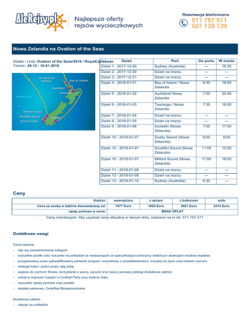 Nowa Zelandia na Ovation of the Seas Dzień Statek / Linia: Ovation of the Seas/2016 / RoyalCaribbean Termin: 29.12 - 10.01.2018 Dzień 1 - 2017-12-29 Do portu W morze Sydney (Australia) Port --- 18:30 Dzień 2 - 2017-12-30 Dzień na morzu --- --- Dzień 3 - 2017-12-31 Dzień na morzu --- --- Dzień 4 - 2018-01-01 Bay of Island / Nowa Zelandia 9:30 18:00 Dzień 5 - 2018-01-02 Auckland/ Nowa Zelandia 7:00 20:45 Dzień 6 - 2018-01-03 Tauranga / Nowa Zelandia 7:30 18:00 Dzień 7 - 2018-01-04 Dzień na morzu --- --- Dzień 8 - 2018-01-05 Dzień na morzu --- --- Dzień 9 - 2018-01-06 Dunedin (Nowa Zelandia) 7:00 17:00 Dzień 10 - 2018-01-07 Dusky Sound (Nowa Zelandia) 8:00 9:00 Dzień 10 - 2018-01-07 Doubtful Sound (Nowa Zelandia) 11:00 12:00 Dzień 10 - 2018-01-07 Milford Sound (Nowa Zelandia) 17:00 18:00 Dzień 11 - 2018-01-08 Dzień na morzu --- --- Dzień 12 - 2018-01-09 Dzień na morzu --- --- Dzień 13 - 2018-01-10 Sydney (Australia) 6:30 --- Ceny Kabina: Cena za osobę w kabinie dwuosobowej od: opaty portowe w cenie: wewnętrzna z oknem z balkonem suite 1677 Euro 1852 Euro 2021 Euro 3412 Euro BRAK OPŁAT Ceny orientacyjne. Aby uzyskać cenę aktualną w danym dniu, zadzwoń na nr tel. 511 757 511 Dodatkowe uwagi Cena zawiera: - rejs wg zarezerwowanej kategorii - wszystkie posiłki oraz rozrywka na pokładzie (w restauracjach ze specyfikacją kuchni/przy niektórych atrakcjach możliwa dopłata) - przygotowany przez wykwalifikowany personel program rozrywkowy z przedstawieniami, muzyką na żywo oraz klubem nocnym - obsługa kabin i pokoi przez całą dobę - wejście do centrum fitness, korzystanie z sauny, jacuzzi oraz sauny parowej (zabiegi dodatkowo płatne) - udział w imprezie Captain´s Cocktail Party przy bufecie Gala - wszystkie opłaty portowe oraz podatki - dopłata paliwowa, Certyfikat Bezpieczeństwa Dodatkowo płatne: - napoje na pokładzie - osobiste wydatki - wycieczki na lądzie - napiwki (mogą być odliczane z Twojego rachunku na pokładzie (sugerowane: ok. USD 10 za osobę/dzień za gości powyżej 13 lat, 5 USD za osobę/dzień za gości od 3 do 12 lat) - ubezpieczenie podróży - wiza, jeśli wymagana język na pokładzie: angielski