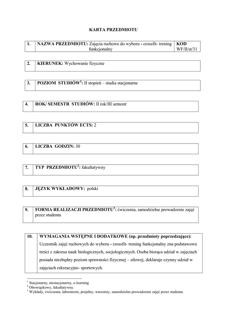 KARTA PRZEDMIOTU 1. NAZWA PRZEDMIOTU: Zajęcia ruchowe do wyboru - crossfit- trening funkcjonalny 2. KIERUNEK: Wychowanie fizyczne 3. POZIOM STUDIÓW1: II stopień – studia stacjonarne KOD WF/II/st/31 4. ROK/ SEMESTR STUDIÓW: II rok/III semestr 5. LICZBA PUNKTÓW ECTS: 2 6. LICZBA GODZIN: 30 7. TYP PRZEDMIOTU2: fakultatywny 8. JĘZYK WYKŁADOWY: polski 9. FORMA REALIZACJI PRZEDMIOTU3: ćwiczenia, samodzielne prowadzenie zajęć przez studenta 10. WYMAGANIA WSTĘPNE I DODATKOWE (np. przedmioty poprzedzające): Uczestnik zajęć ruchowych do wyboru - crossfit- trening funkcjonalny zna podstawowe treści z zakresu nauk biologicznych, socjologicznych. Osoba biorąca udział w zajęciach posiada niezbędny poziom sprawności fizycznej – siłowej, deklaruje czynny udział w zajęciach rekreacyjno- sportowych. 1 Stacjonarny, niestacjonarny, e-learning Obowiązkowy, fakultatywny. 3 Wykłady, ćwiczenia, laboratoria, projekty, warsztaty, samodzielne prowadzenie zajęć przez studenta. 2 11. CEL PRZEDMIOTU: Zapoznanie studenta z nowoczesną formą pracy nad siłą ogólną organizmu, z wykorzystaniem najnowszej generacji sprzętu, oraz dawno już znanego sprzętu w nieznany dotąd sposób użytkowania. Wskazanie na różne formy możliwe do zastosowania w różnych miejscach dla osób w każdym wieku. 12. Odniesienie do kierunkowych efektów kształcenia (symbol) Odniesienie do obszarowych efektów kształcenia i standardów kształcenia nauczycieli (symbol) K_W05 K_W08 M2_W04 M2_W08 P_W02. Student zna zasady zmienności pracy mięśniowej , wzrostu intensywności podczas ćwiczeń siłowych ludzi w różnym wieku, potrafi je zastosować w planowaniu treningu sportowego. K_W10 K_W12 M2_W05 M2_W10 P_U01. Student dokonuje krytycznej oceny K_U08 M2_U05 M2_U04 M2_U07 K_U12 M2_U04 M2_U05 M2_U10 M2_U09 M2_U11 M2_U11 PRZEDMIOTOWE EFEKTY KSZTAŁCENIA4 P_W01. Student wie, jaką role odgrywa aktywność ćwiczeniach fizyczna ruchowych podejmowana na w przykładzie kulturystki, w profilaktyce zdrowego stylu życia. Rozumie znaczenie procesu motywacyjnego w jej podejmowaniu. ogólnodostępnych programów ćwiczeń potrafi wskazać, do jakie grupy ćwiczących najlepiej je zastosować ze względu na wiek, płeć i poziom sprawności ćwiczących. P_U02. Student zna przepisy związane z organizacją zawodów CrossFit. Zgodnie z panującymi zasadami bezpieczeństwa. P_U03. Student prezentuje wysoki poziom K_U15 umiejętności technicznych w poszczególnych ćwiczeniach siłowych. Zna zasady metodyki nauczania jak również zwraca uwagę na punkty kluczowe w danej czynności ruchowej. 4 Efekty kształcenia w zakresie wiedzy (P_W), umiejętności (P_U) i kompetencji społecznych (P_K). P_K01. Student za istotność dokształcania zawodowego wie jak ważna jest praca nad sobą K_K01 K_K03 M2_K01 M2_K06 M2_K08 K_K05 M2_K04 M2_K03 M2_K06 oraz stała aktywność fizyczna, potrafi w sposób nowatorski zaproponować nowa formę ćwiczeń dostosowana do wymagań wybranej grupy uczestników zajęć ruchowych. P_K02. Student prowadzi dzienniki treningowy, w którym uwzględnia pracę wykonaną podczas zajęć. Na podstawie dziennika dokonuje analizy intensywności i objętości podjętego wysiłku fizycznego. Potrafi dokonać analizy pracy wykonanej przez współćwiczącego i dać mu wskazówki umożliwiające osiągnięcie wcześniej wyznaczonego celu. 13. METODY OCENY EFEKTÓW KSZTAŁCENIA Symbol przedmiotowego efektu kształcenia Metody (sposoby) oceny5 Typ oceny6 Forma dokumentacji P_W01 ocenianie ciągłe podsumowująca praca pisemna P_W02 zaliczenie pisemne podsumowująca praca pisemna P_U01 ocenianie ciągłe podsumowująca praca pisemna P_U02 ocenianie ciągłe formująca konspekt zajęć P_U03 podsumowująca arkusz zaliczeń P_K01 sprawdziany poszczególnych prób: Przysiad ze sztangą na barkach, wyciskanie leżąc, martwy ciąg, podciąganie na drążku ocenianie ciągłe formująca konspekt zajęć P_K02 ocenianie ciągłe oraz zaliczenie formująca konspekt zajęć pisemne 5 Ocenianie ciągłe (bieżące przygotowanie do zajęć), śródsemestralne zaliczenie pisemne, śródsemestralne zaliczenie ustne, końcowe zaliczenia pisemne, końcowe zaliczenia ustne, egzamin pisemny, egzamin ustny, praca semestralna, ocena umiejętności ruchowych, praca dyplomowa, projekt, kontrola obecności 6 Formująca, podsumowująca. 14. TREŚCI PROGRAMOWE Forma zajęć7 Treść zajęć (liczba godz.) Zapoznanie z zasadami bezpieczeństwa panującymi na siłowni, regulamin siłowni, sposoby samo asekuracji podczas ćwiczeń Technika wykonania Symbol przedmiotowych efektów kształcenia ćwiczenia (2) P_U02, P_W02 ćwiczenia (2) P_U03 ćwiczenia (2) P_U03, P_W02 ćwiczenia (2) P_U03, P_W02 ćwiczenia (2) P_K01, P_U01 ćwiczenia (2) P_K01, P_W02 ćwiczenia (2) P_K02, P_W01 ćwiczenia (2) P_K02, P_W01 ćwiczenia (2) P_K02, P_W01 ćwiczenia (2) P_K02, P_W01 ćwiczeń kształtujących główne partie mięśniowe: Przysiad ze sztangą na barkach, wyciskanie leżąc, martwy ciąg, podciąganie na drążku. Początkowy sprawdzian siłowy studentów z Przysiadu ze sztangą na barkach, wyciskania leżąc, martwego ciągu, podciągania na drążku. Zasady i zastosowanie metody obwodowej treningu. Zasady i zastosowanie metody stacyjnej. Zasady i zastosowanie metody izometrycznej Zasady i zastosowanie metody ciężkoatletycznej. Zasady i zastosowanie metody kulturystycznej Wprowadzenie zasad treningu Weidera. Pokaz, opis, ćwiczenia praktyczne. Zapoznanie z zasadami tworzenia jednostek treningowych, wprowadzenie do zasady zmienności pracy mięśniowej poprzez ćwiczenia stacyjne, obwodowe. Prowadzenie zajęć przez studenta z zastosowaniem w części głównej zajęć metody obwodowej, dla początkujących. Prowadzenie zajęć przez studenta z zastosowaniem w części głównej zajęć metody stacyjnej, z przeznaczeniem dla osób starszych. Prowadzenie zajęć przez studenta z zastosowaniem w części głównej zajęć metody izometryc